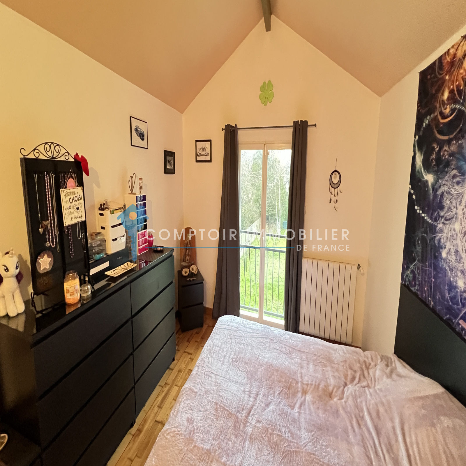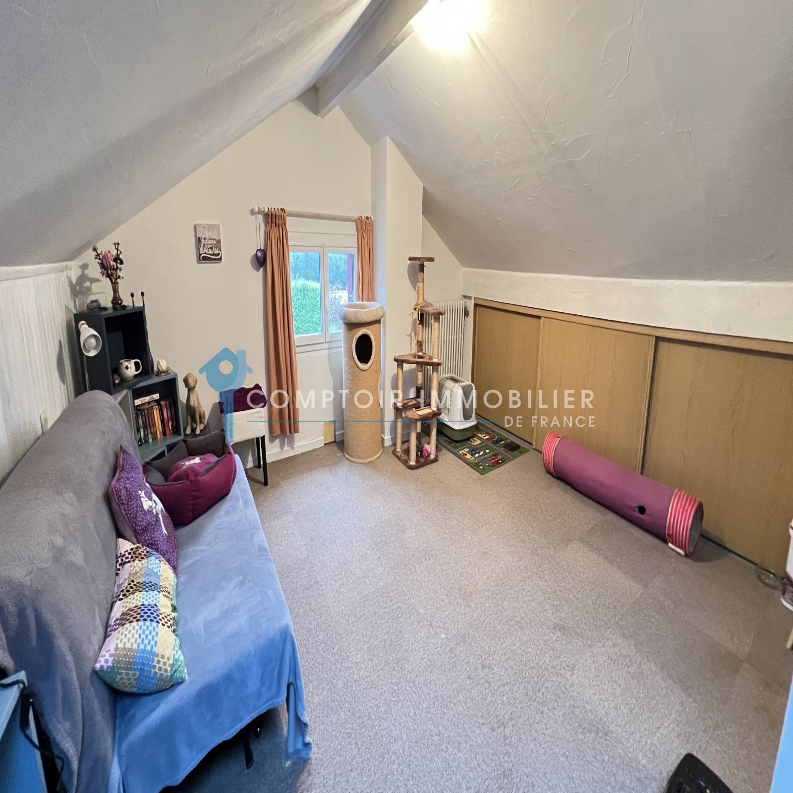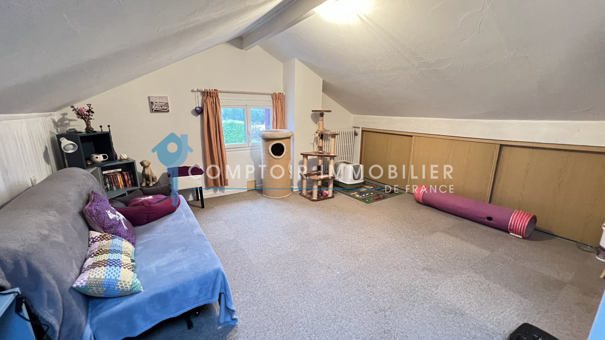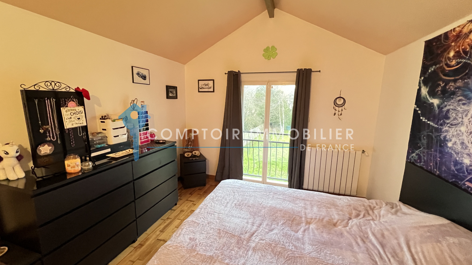 La maison est édifiée sur un sous-sol Total qui se découpe en garage/atelier/buanderie/cave/débarras. En RDC une entrée/SAS, un salon et une salle à manger, une cuisine séparée et équipée, une SDE/wc, un cellier et une belle chambre. A l'étage une grande chambre de 27m² au sol.