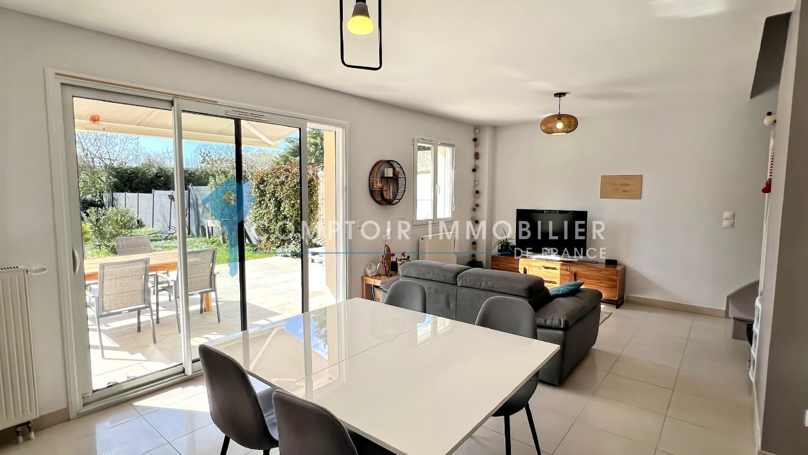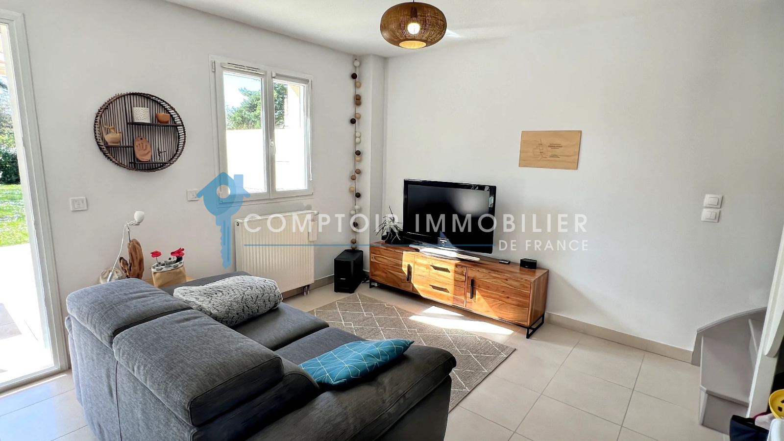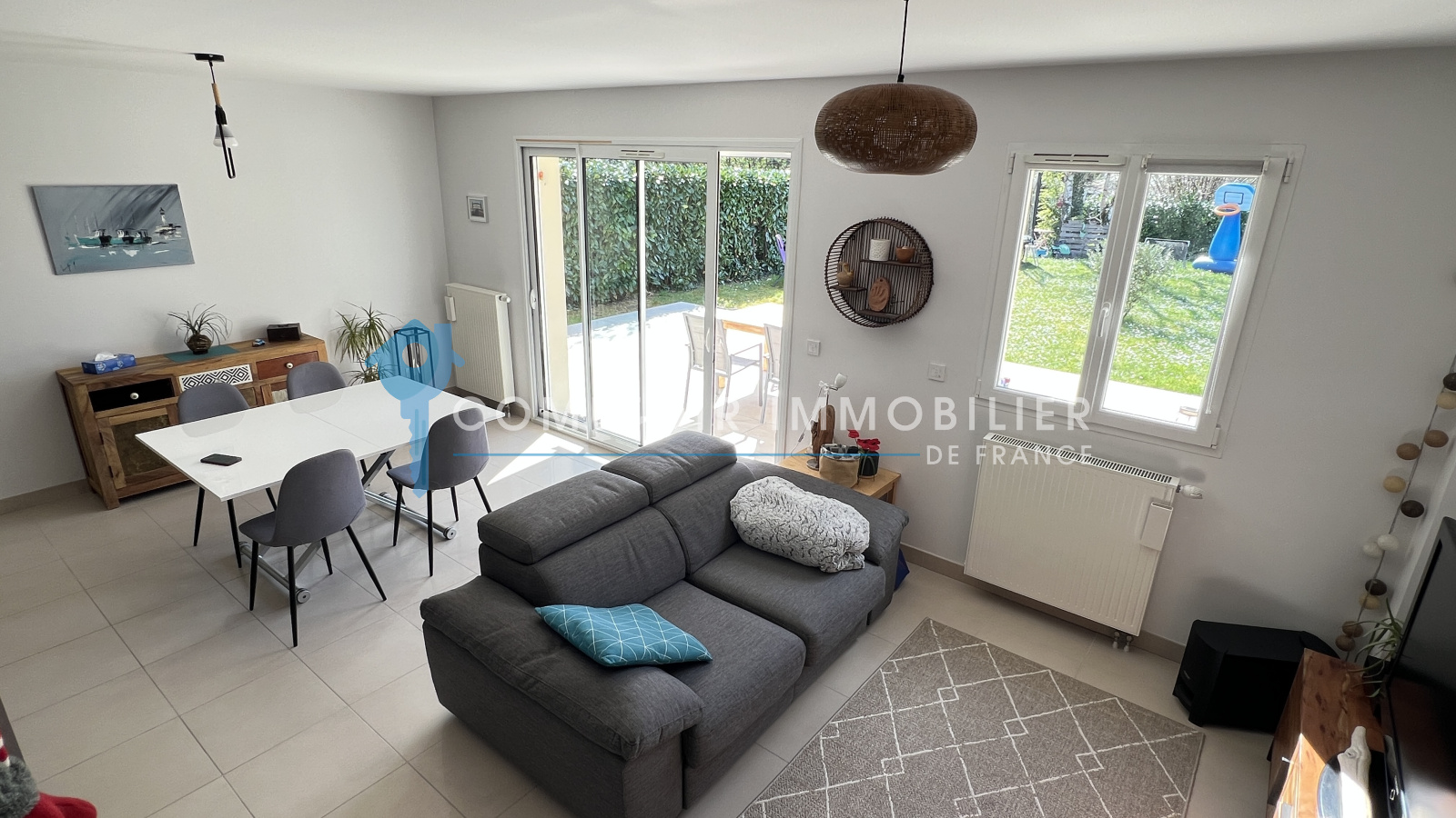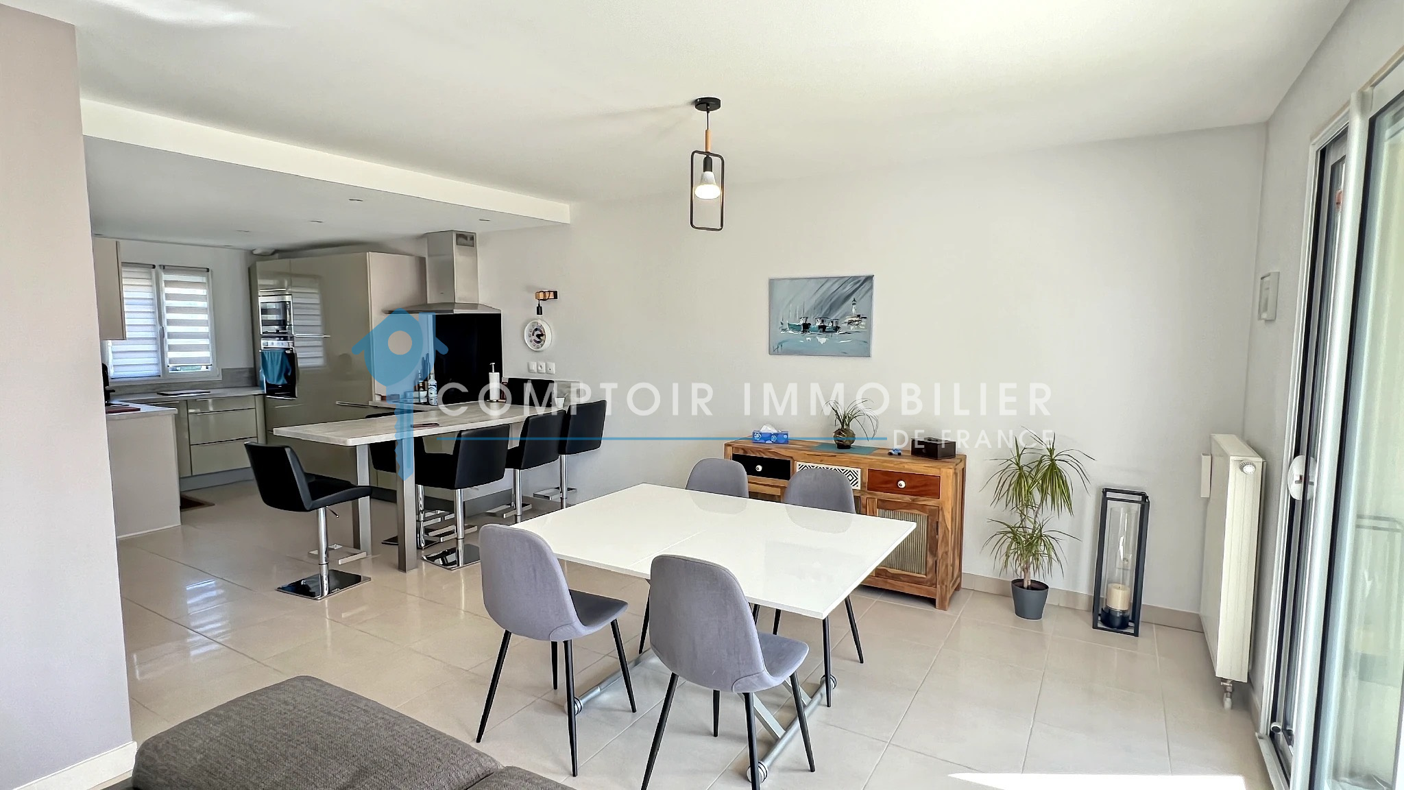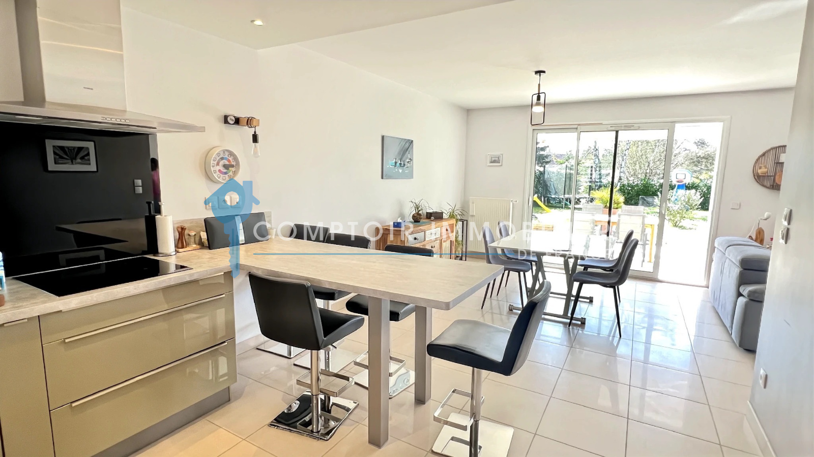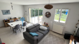 La maison dispose au rdc : d'une entrée , une belle cuisine aménagée et équipée ouverte sur salon/salle à manger, un wc, une buanderie et un garage.