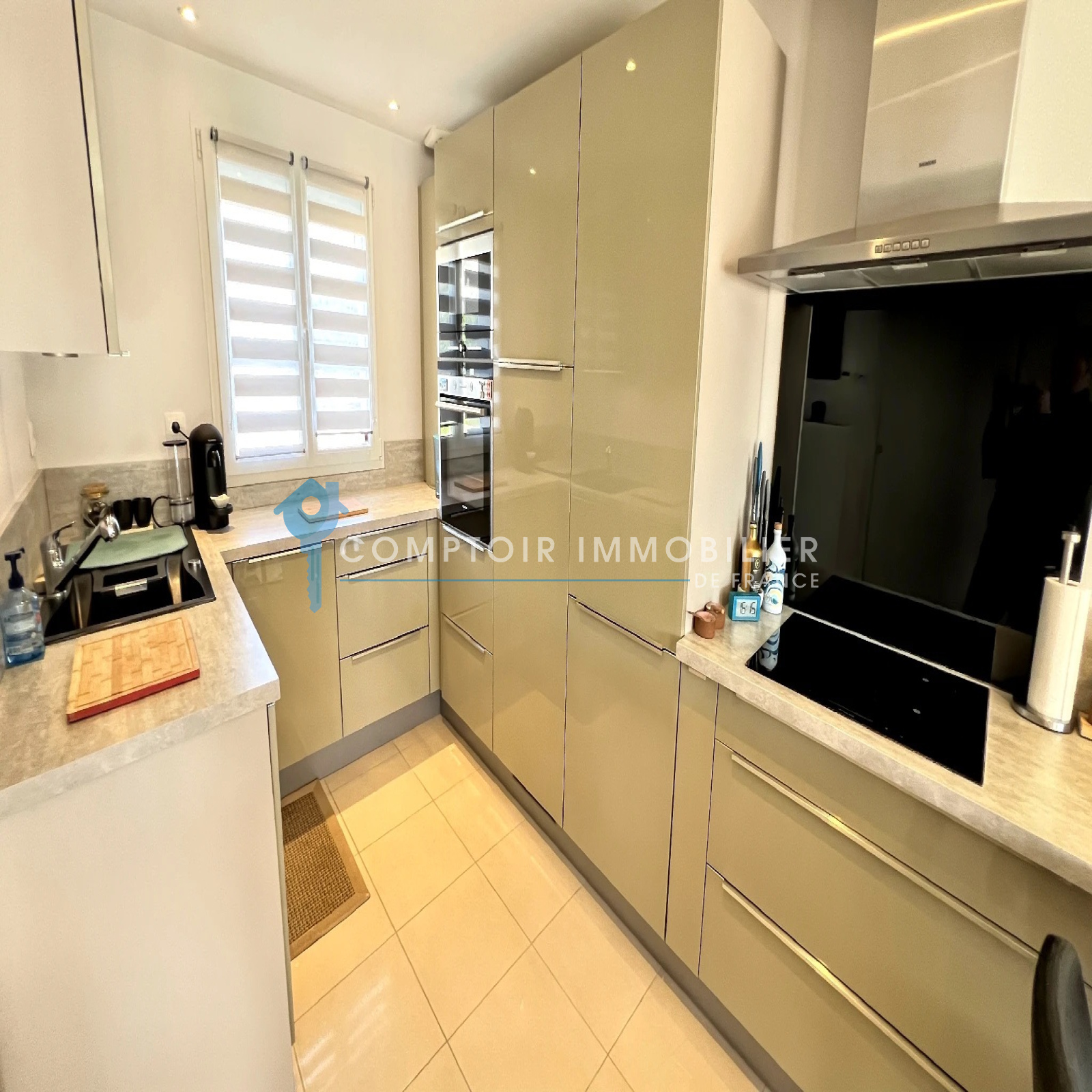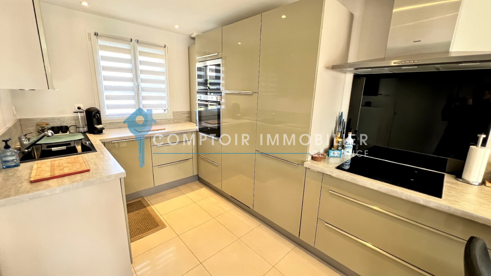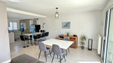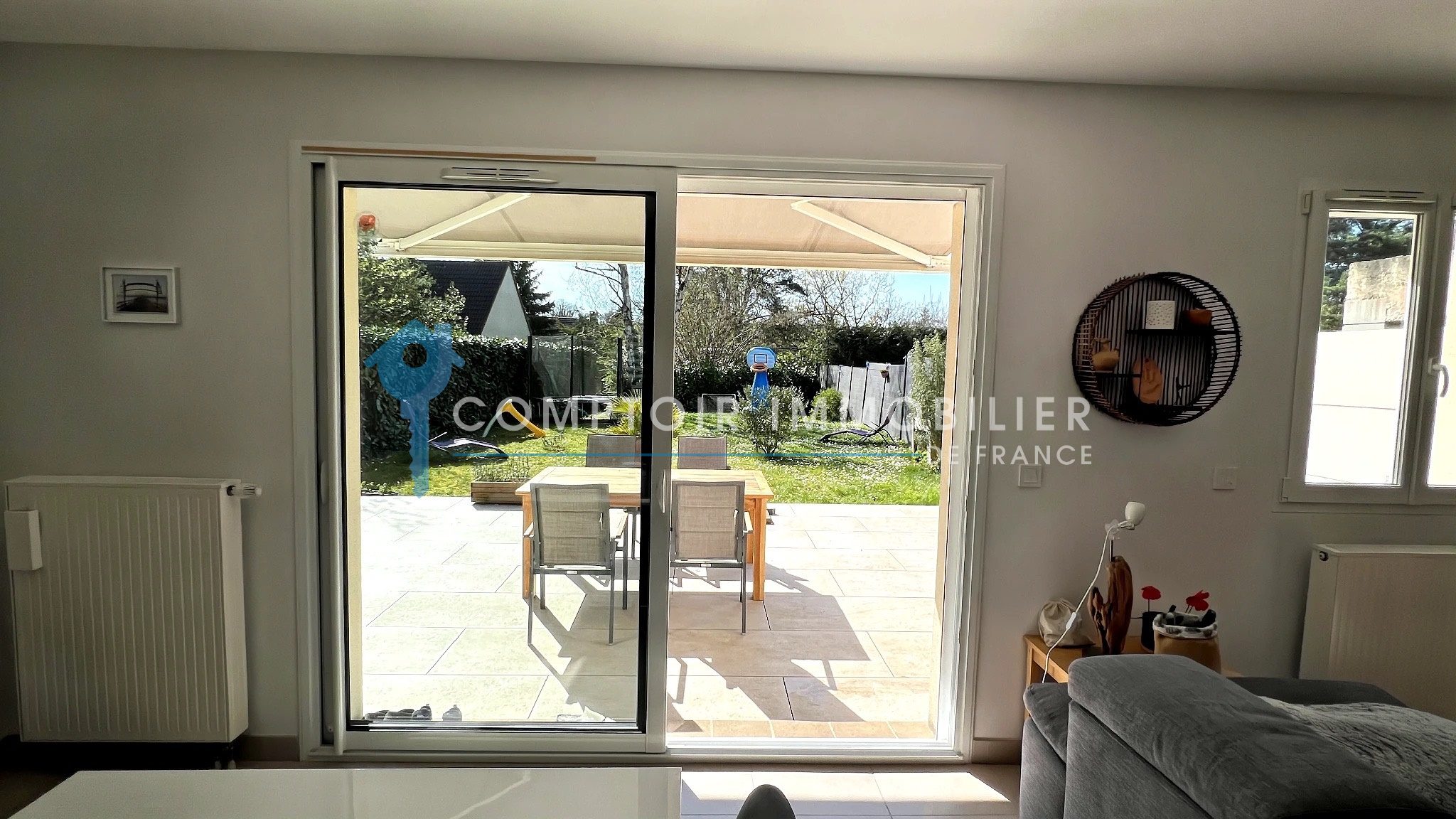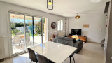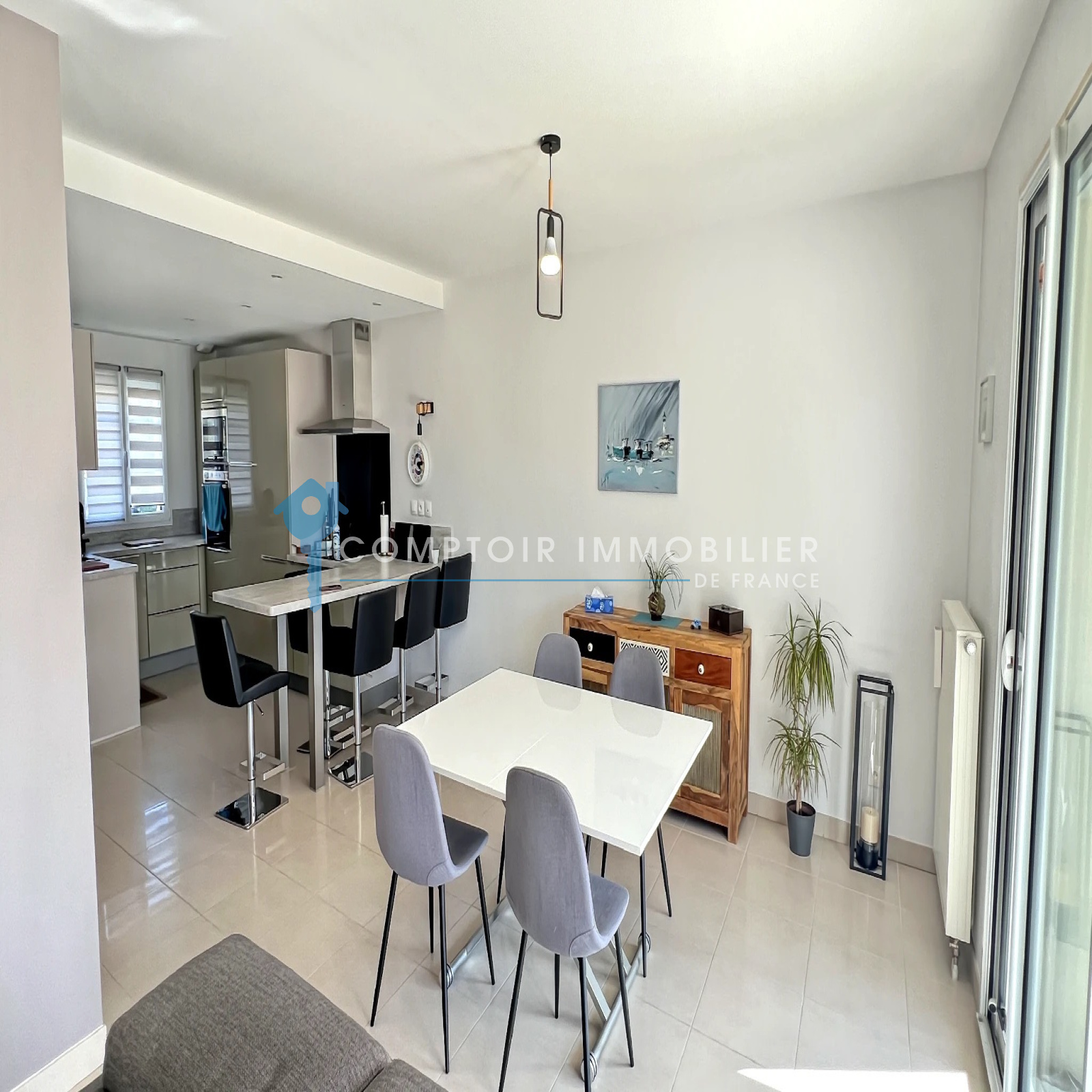 La maison dispose au rdc : d'une entrée , une belle cuisine aménagée et équipée ouverte sur salon/salle à manger, un wc, une buanderie et un garage.