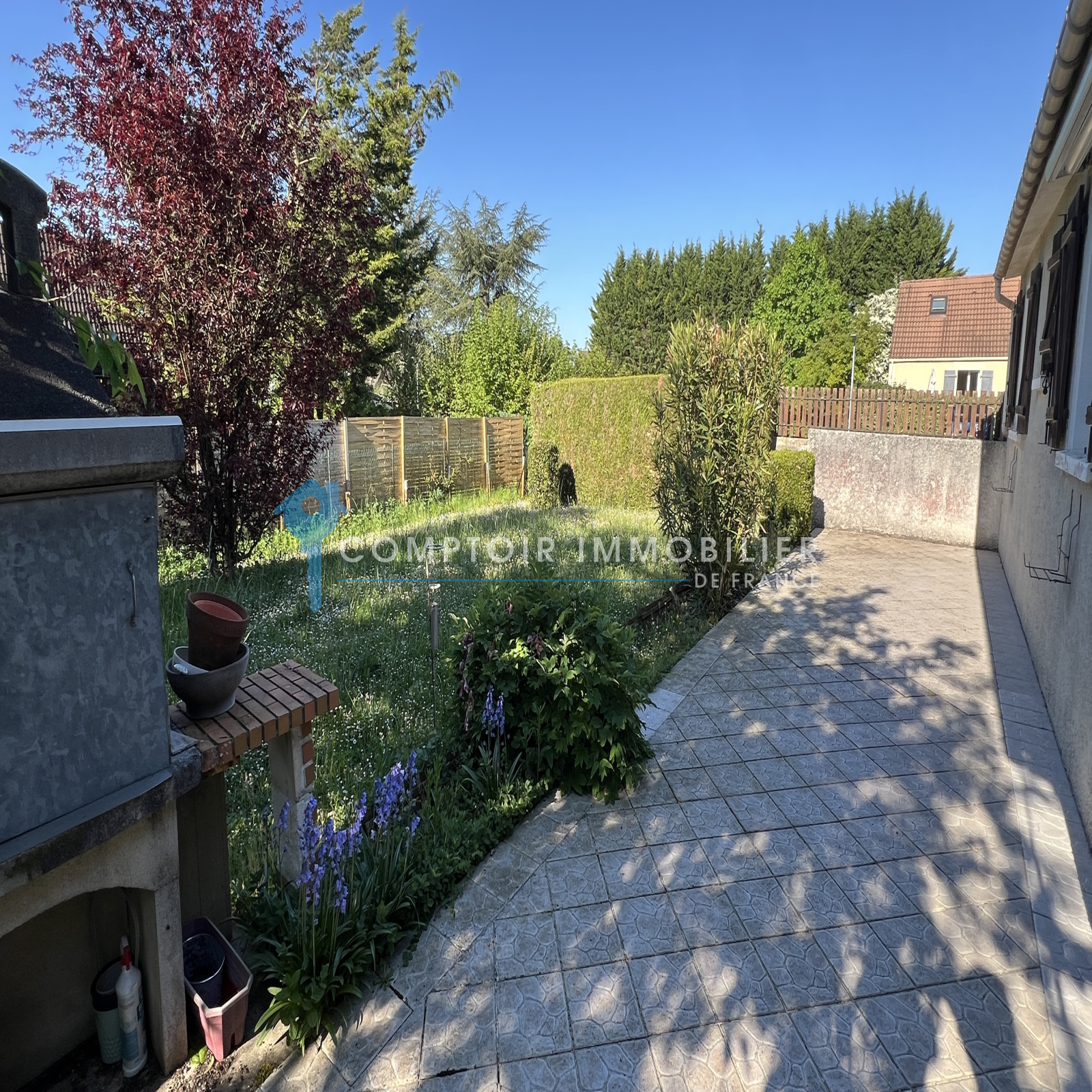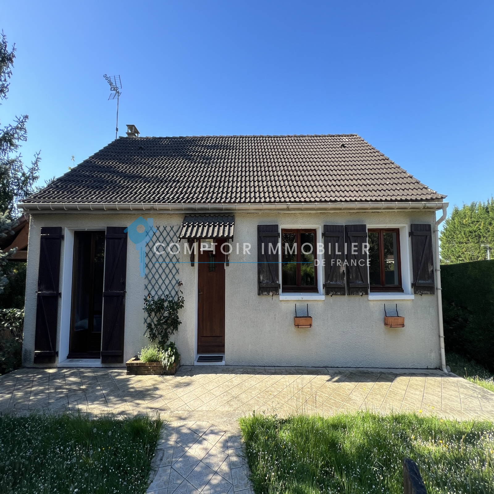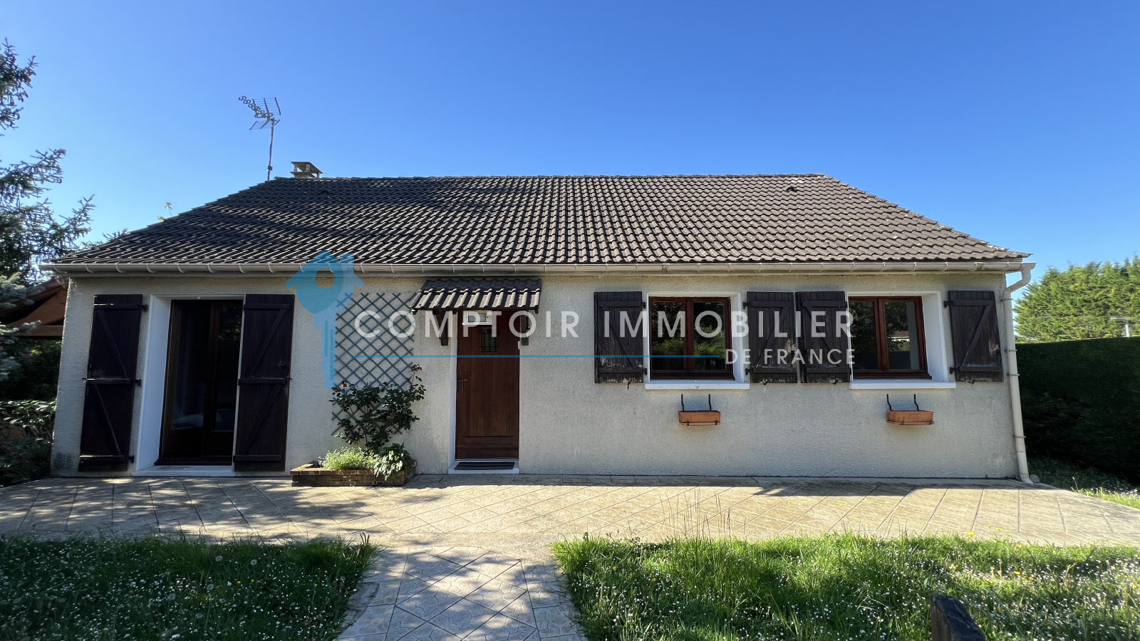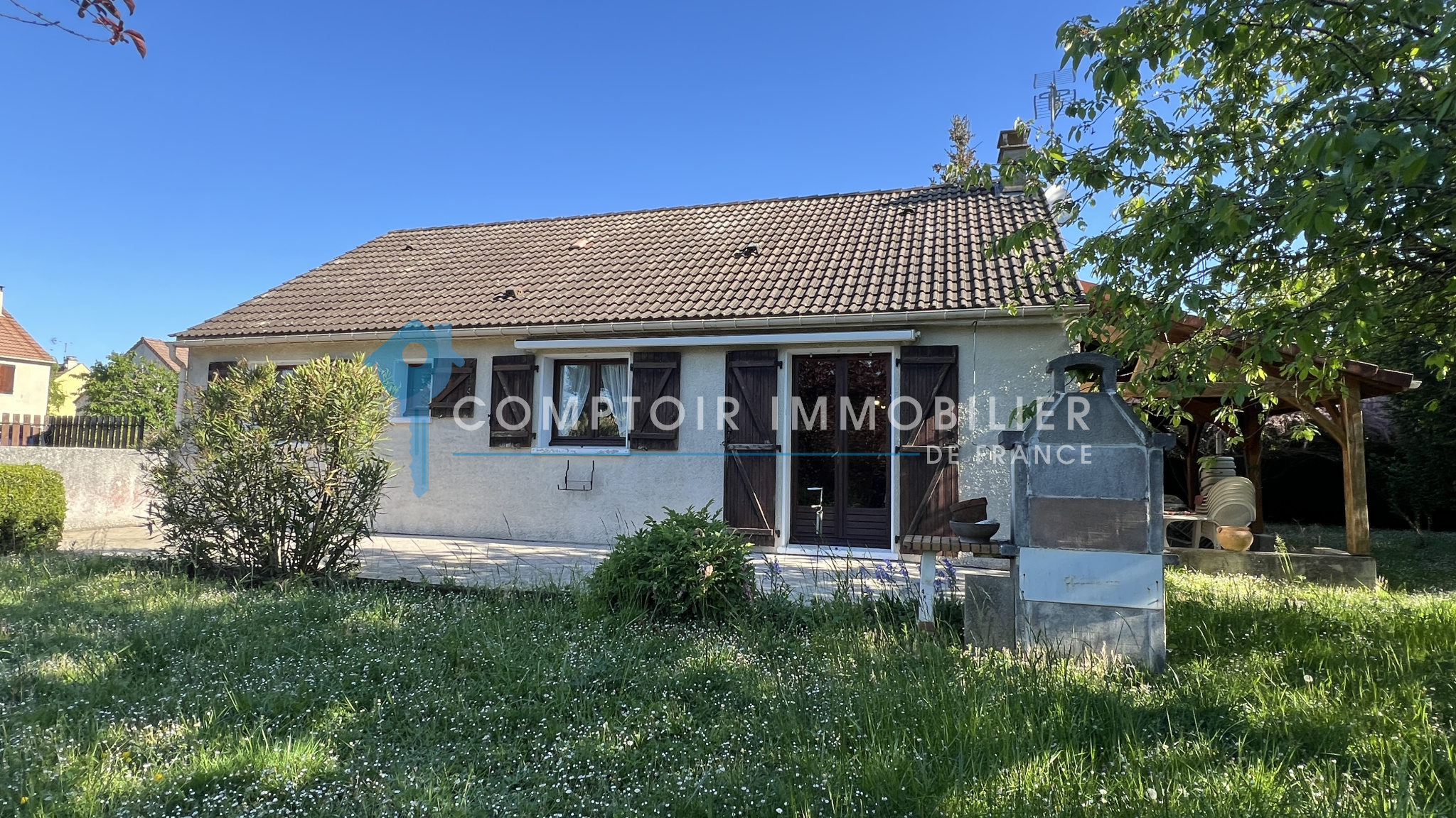 NOUVEAUTÉ et seulement dans votre agence CIF Gatinais - Maison entièrement de plain pied et élevée sur sous-sol total dans quartier calme et recherché de La Ferté Alais à deux pas des écoles ainsi que de la ferme pédagogique comprenant : entrée, salon/séjour avec cheminée donnant sur une belle terrasse exposée plein sud, cuisine aménagée et équipée, dégagement, trois chambres, salle d'eau et wc séparé.