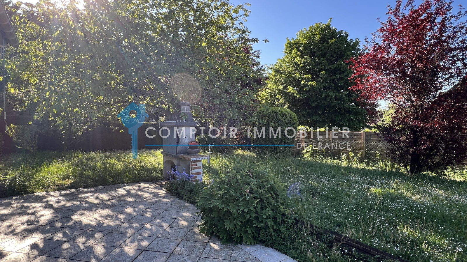 Terrain clos d'environ 824m2 avec terrasse exposée plein sud ainsi qu'un carport sur le côté de la maison.