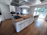 La maison familiale se compose, en RDC ; d'une entrée/cellier, une grande cuisine dinatoire ouverte avec ilot central, un salon avec cheminée, un grand séjour, un bureau et un wc séparé et un garage en cours d'aménagement en pièce de vie.