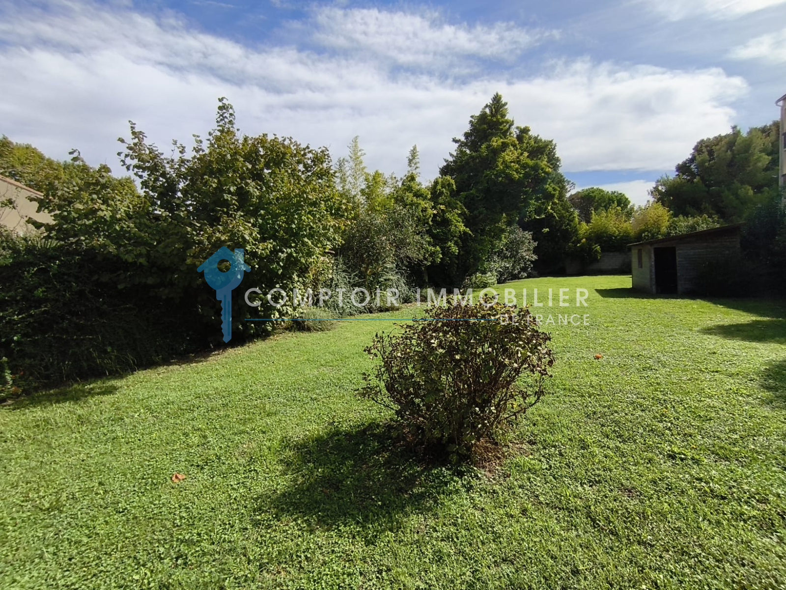 Un garage fermé complète cet espace extérieur, parfait pour les amateurs de bricolage ou de stockage.