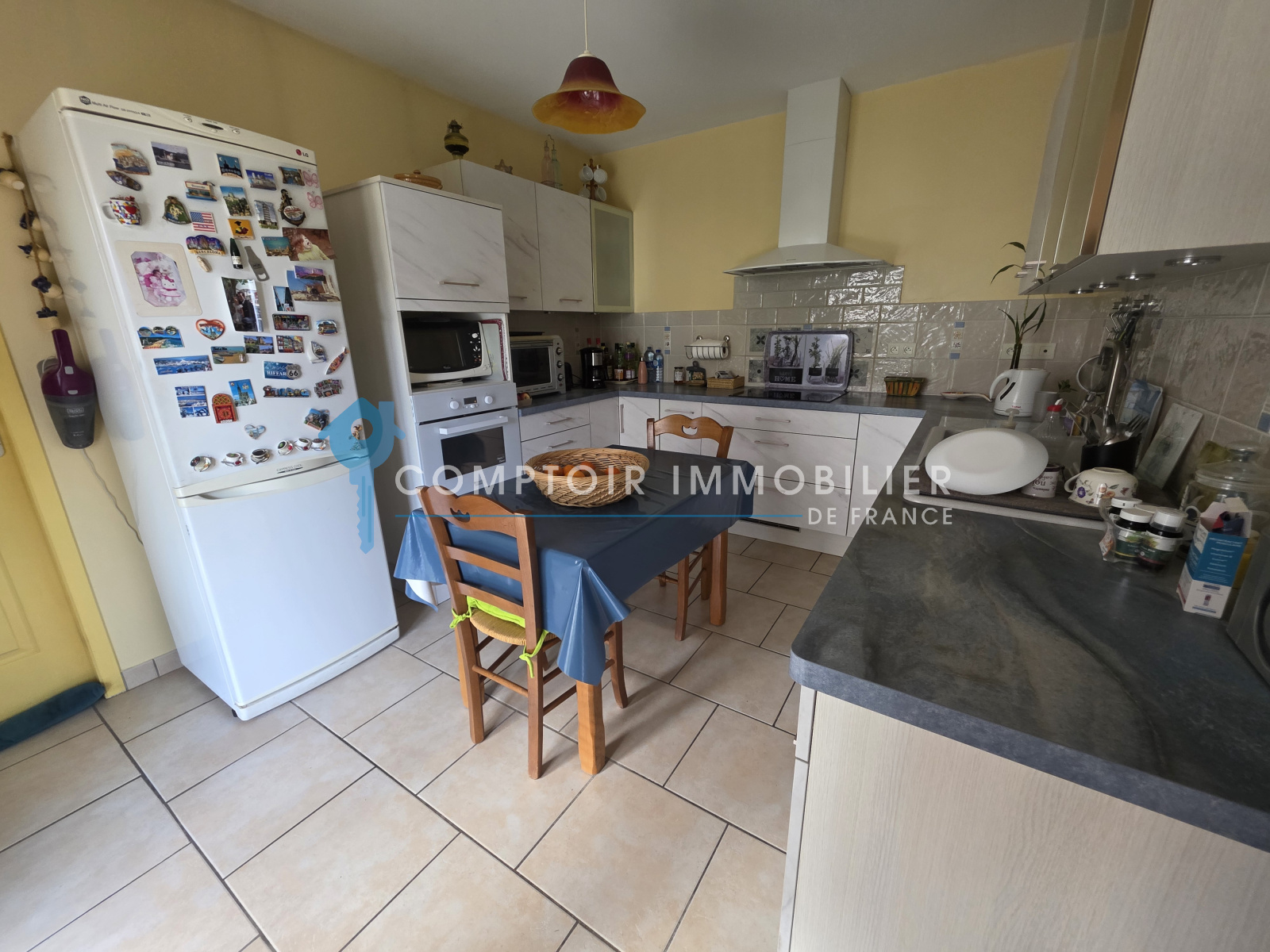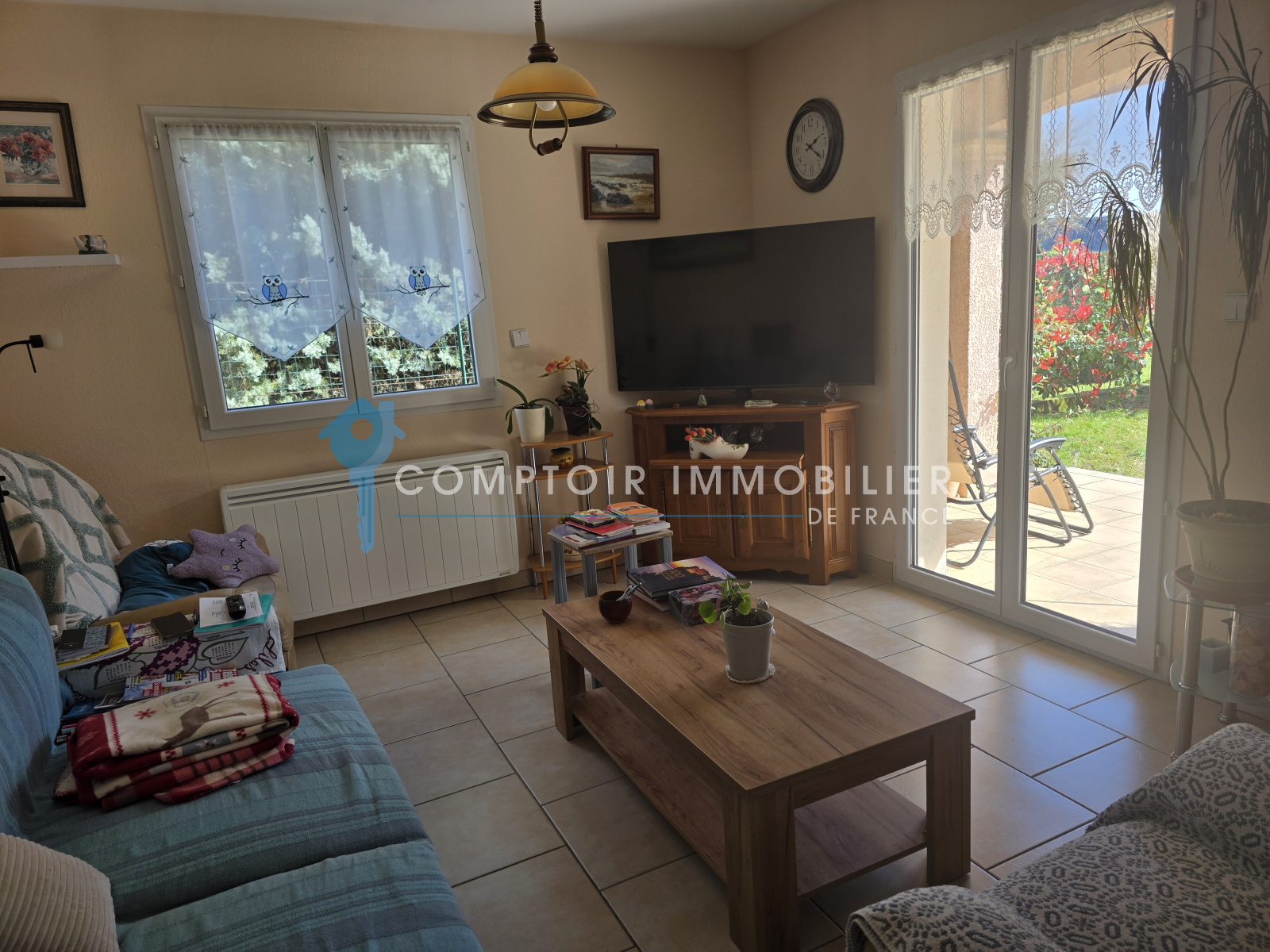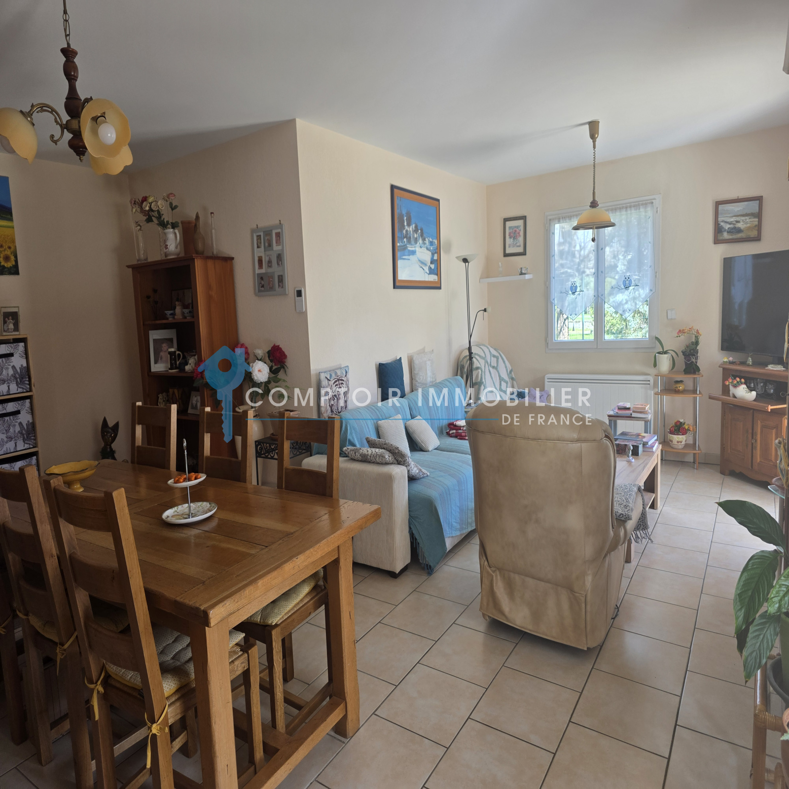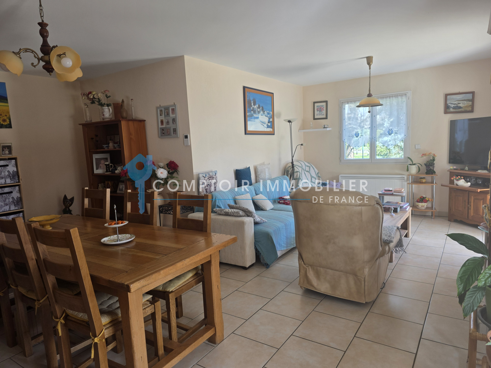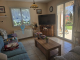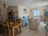 Maison de plain-pied offre un grand séjour/salon très lumineux, la cuisine indépendante est meublée, équipée s'ouvrant sur la terrasse -