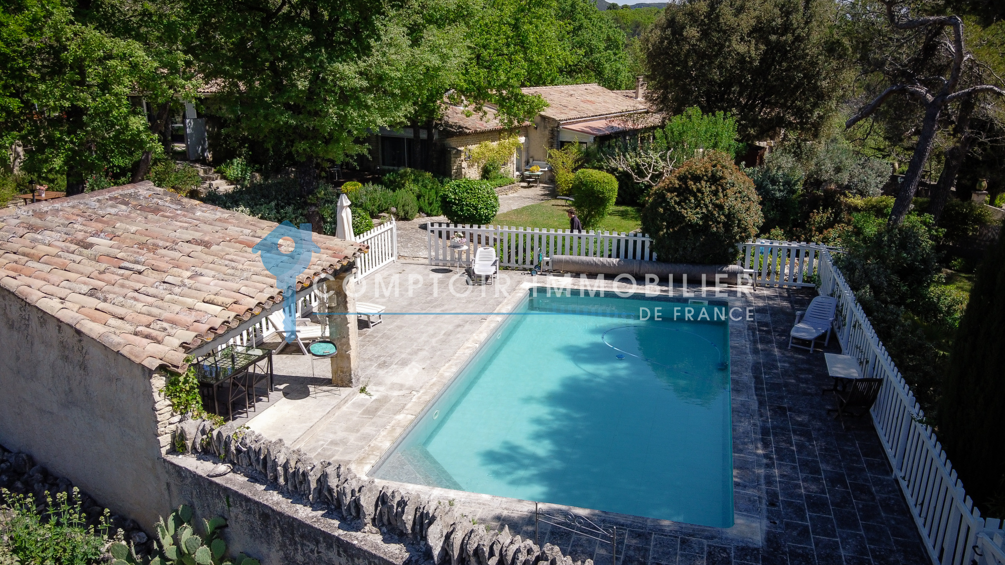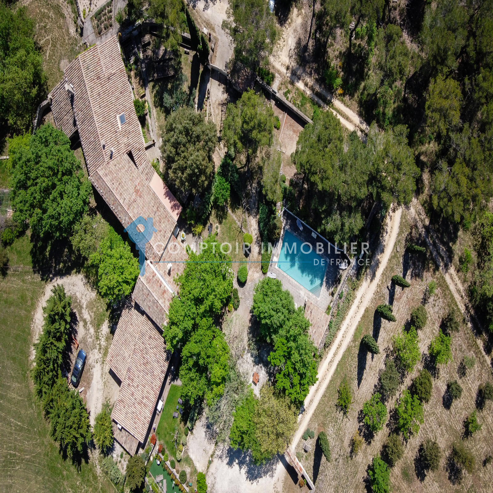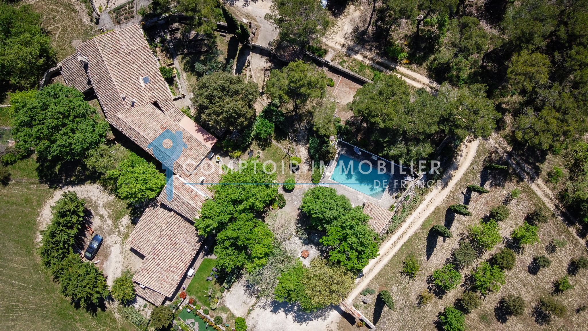 Le tout représente plus de 360 m² habitables sur un terrain de plus de 2ha plantés d’essences locales (chênes truffiers, oliviers, cyprès…) et un jardin clos de murs en pierre autour de la maison avec un espace piscine (10x5 m) et son pool-house, un terrain de pétanque, terrasses, potager…