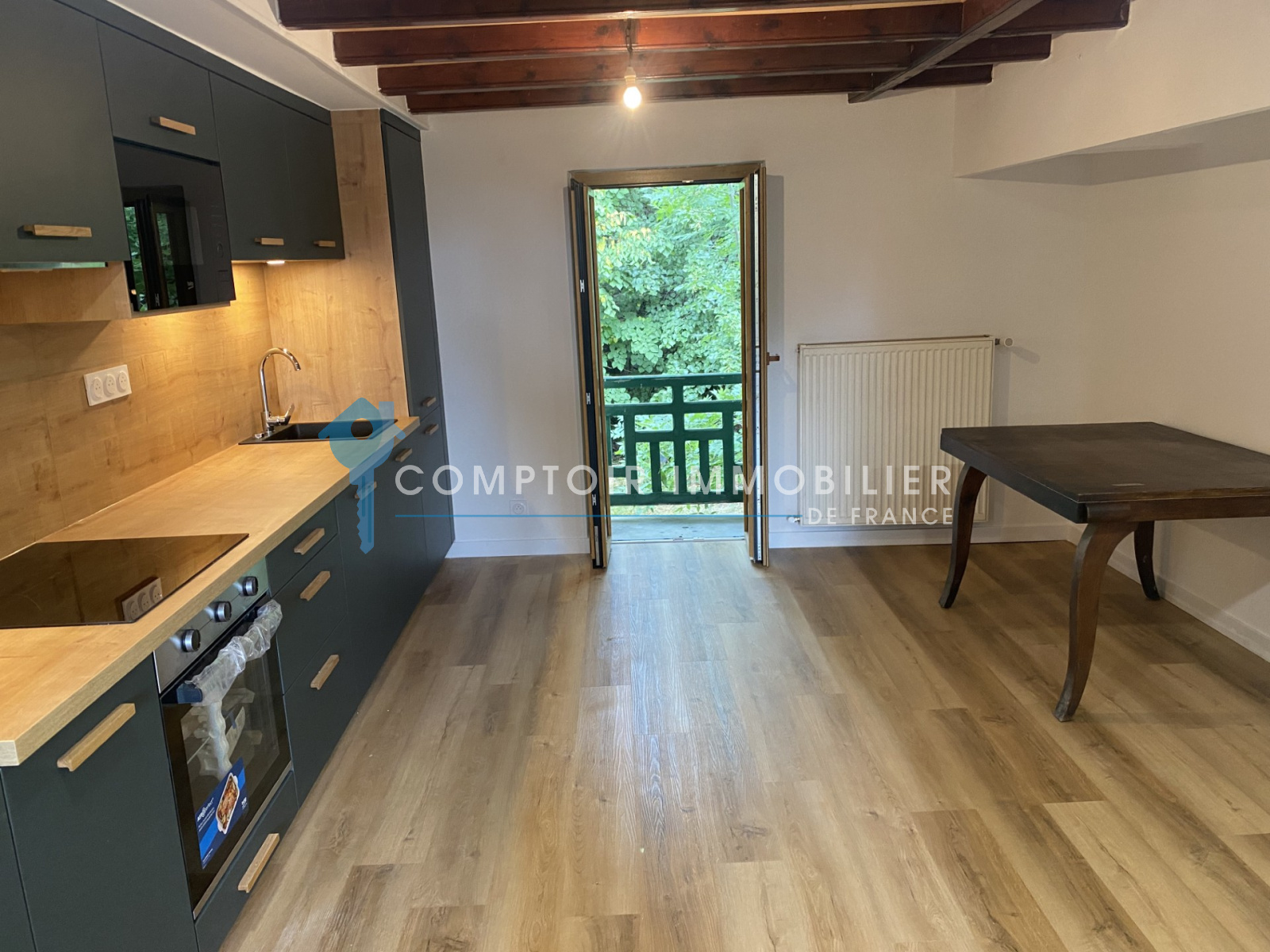 Au 1 er étage, cuisine équipée et salon.