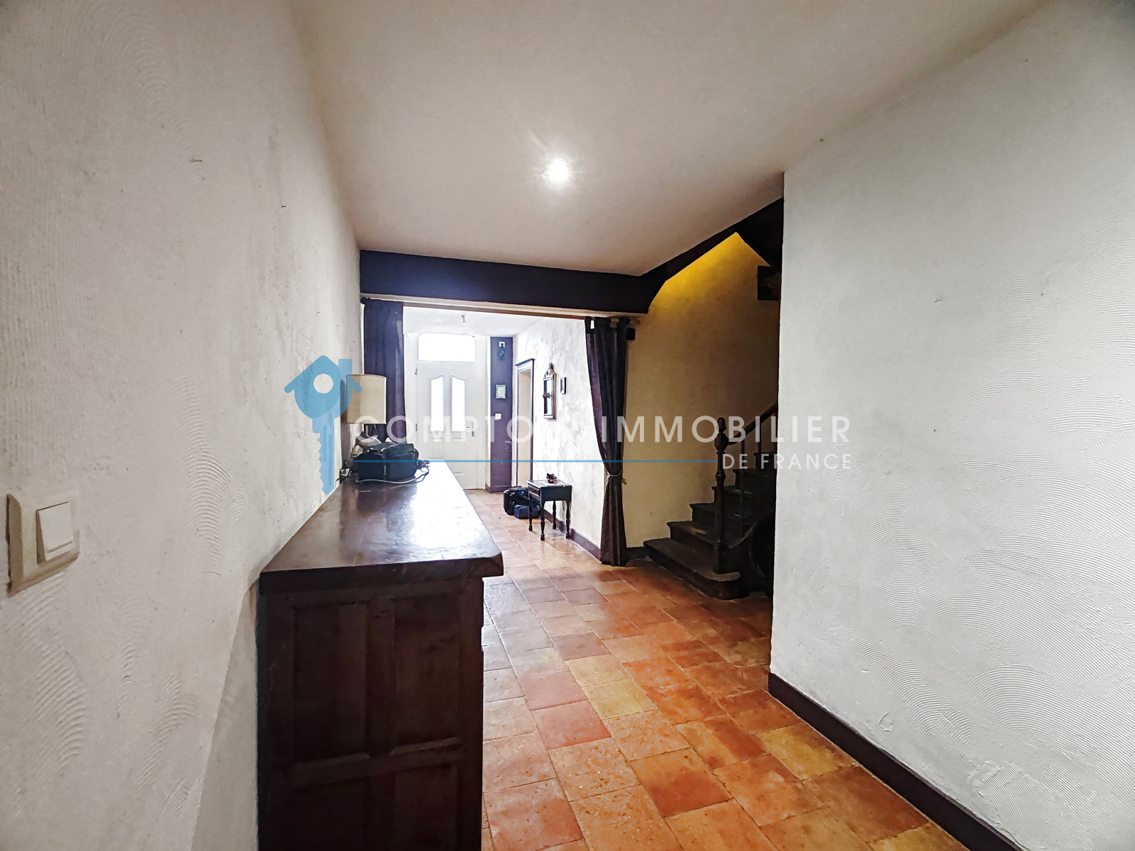 La maison de maître sur 2 niveaux + combles aménageables et verrière de 105 m² pouvant être réhabilitée. Vous serez séduit par les hauteurs sous plafond, les tomettes et les parquets qui donnent un cachet et un charme à cette demeure.