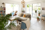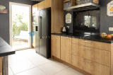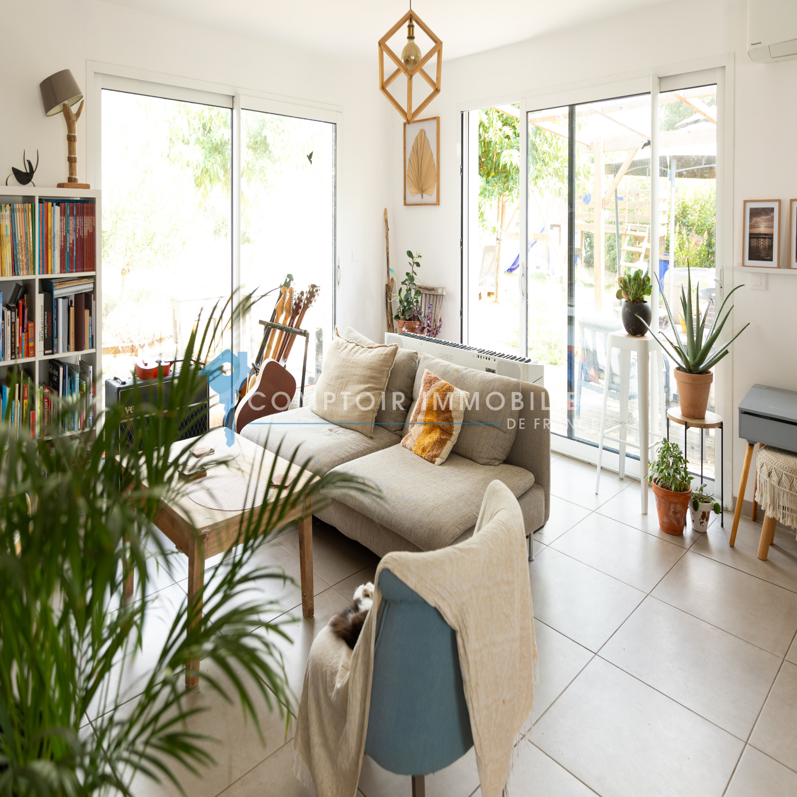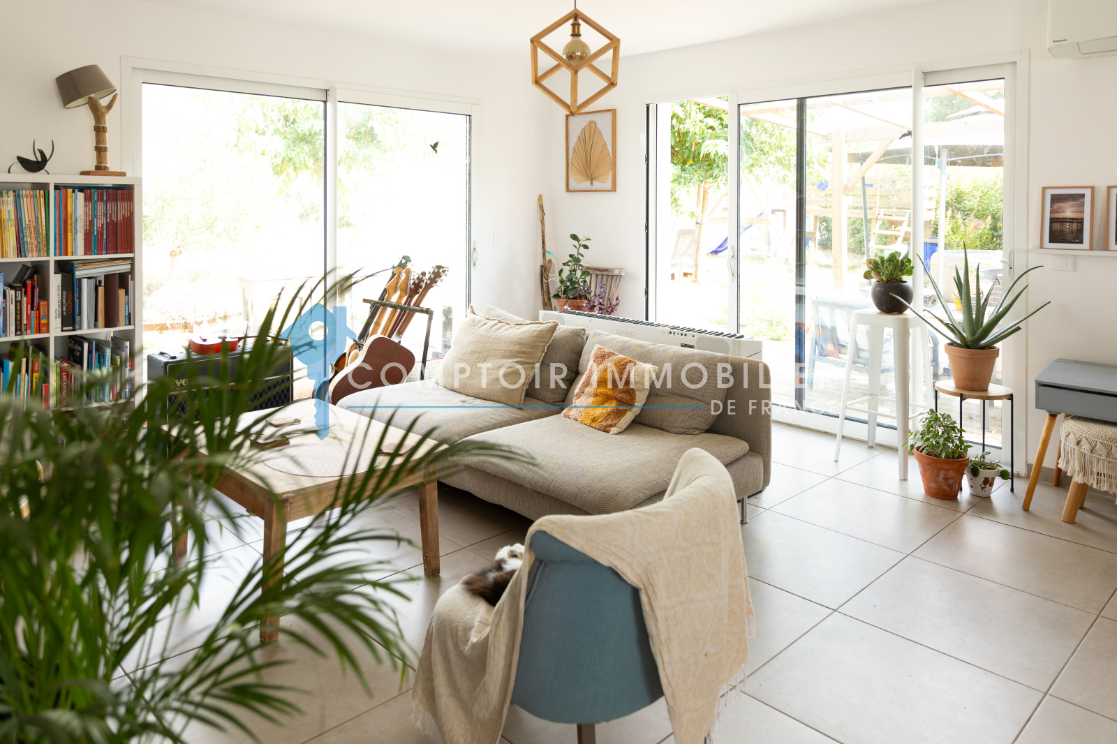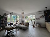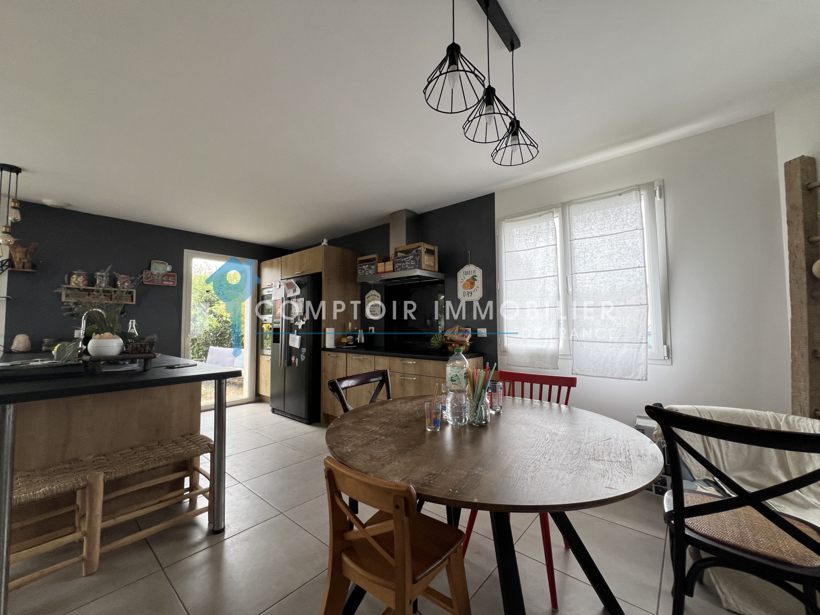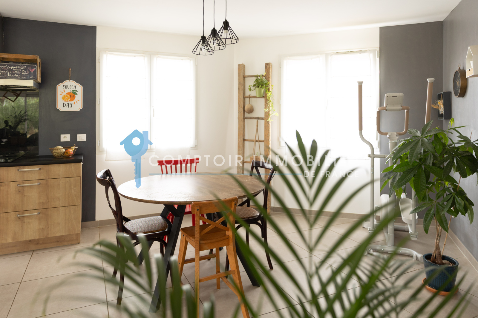 Grande pièce de vie lumineuse, cuisine ouverte équipée avec ilot central, cellier, rangements.