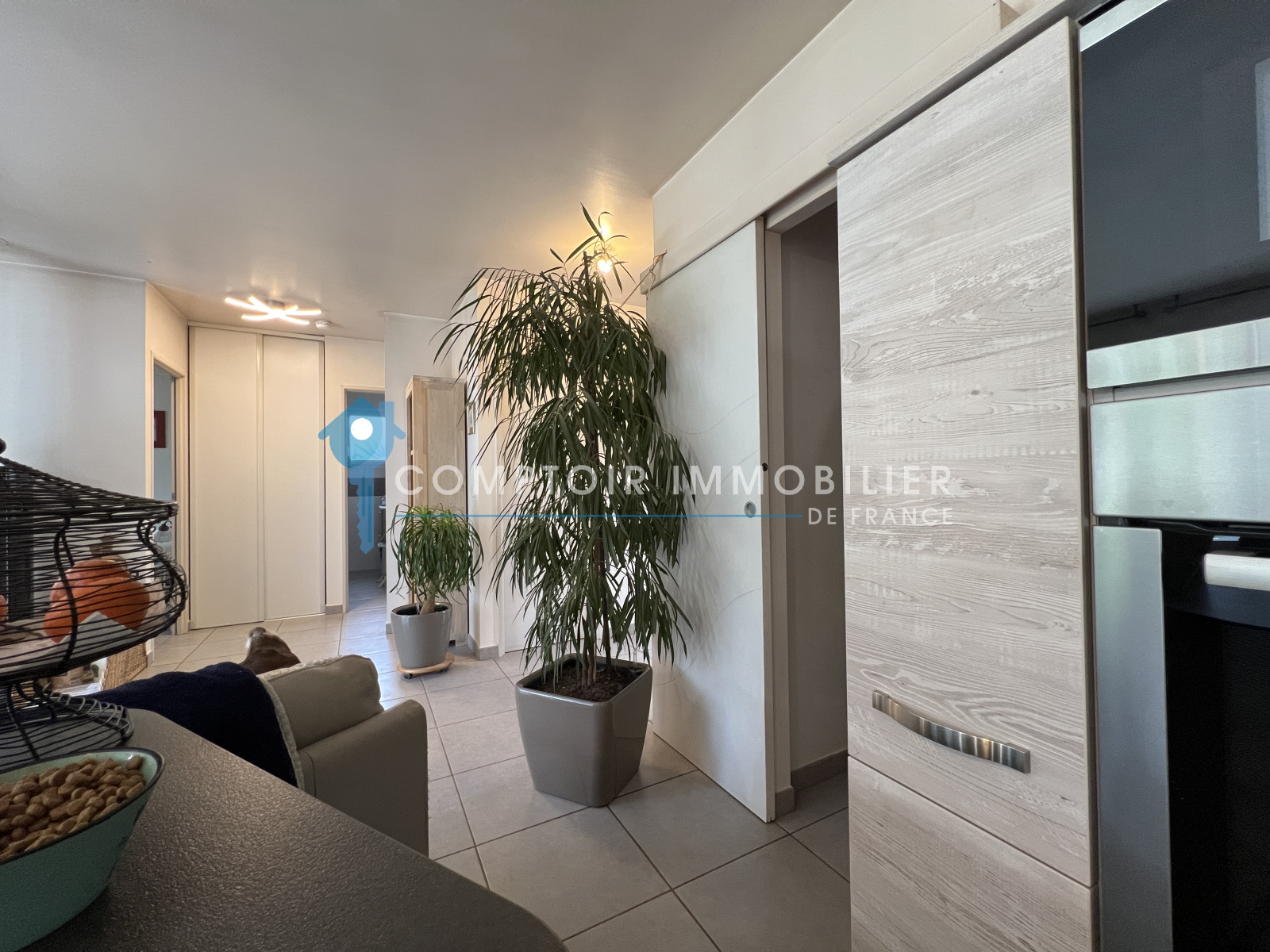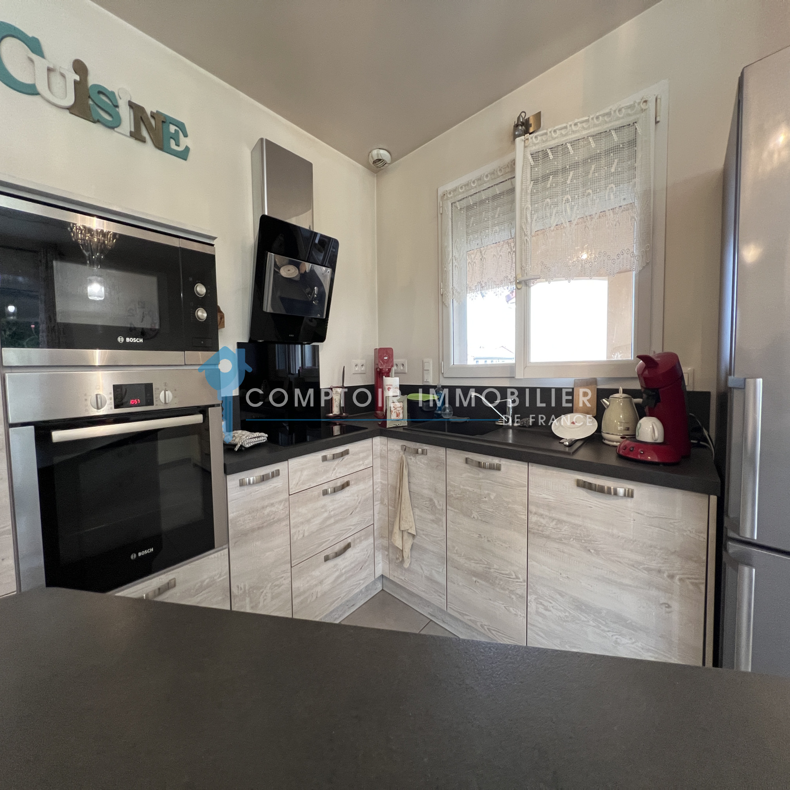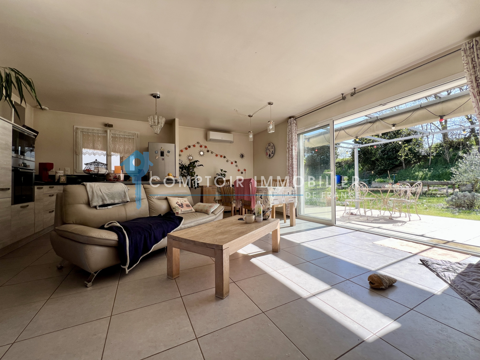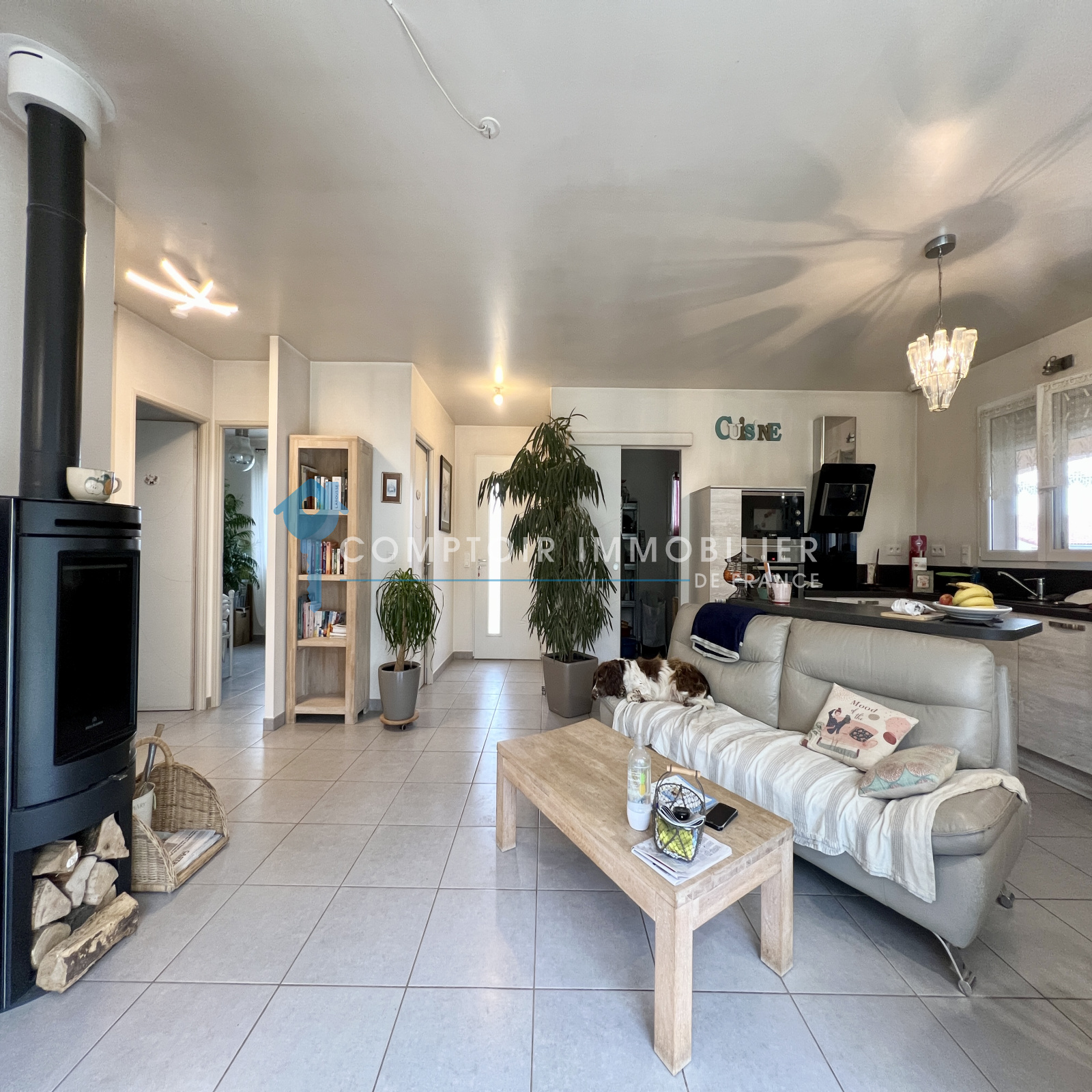 Côté jour: Hall d'entrée avec WC et placard de rangement, pièce de vie lumineuse avec poêle à bois, cuisine ouverte équipée avec îlot central, cellier attenant.
