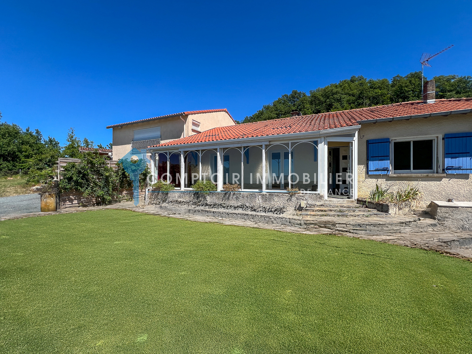 Une agréable véranda vous permet de profiter du soleil en hiver. Jardin d'agrément situé à l'avant de la maison, sur la partie goudronnée .