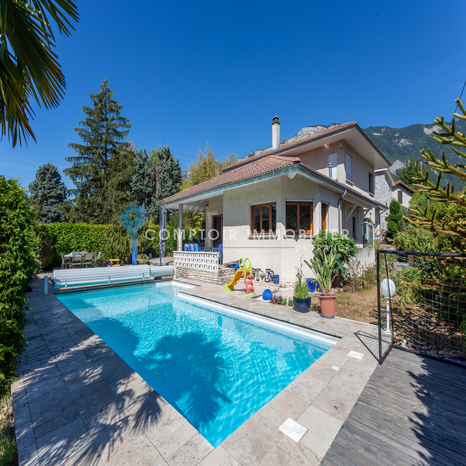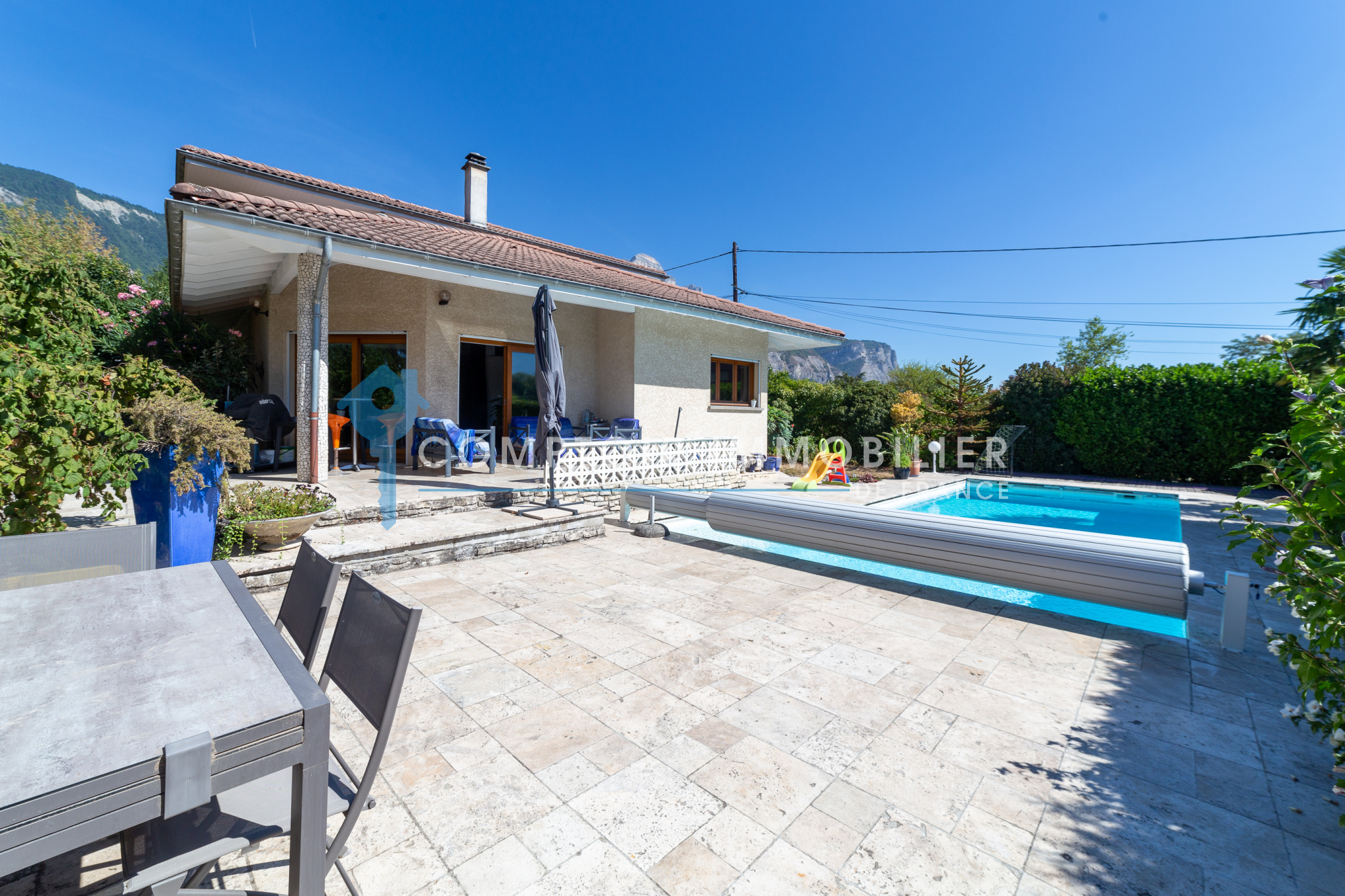 Maison d'architecte sur la commune de Saint Nazaire les Eymes au coeur du Grésivaudan construite en 2001 sur un terrain de 830m2 avec grande piscine et pool house. Vue sur la chaîne de Belledonne d'un côté et la Chartreuse/Dent de Crolles de l'autre côté.