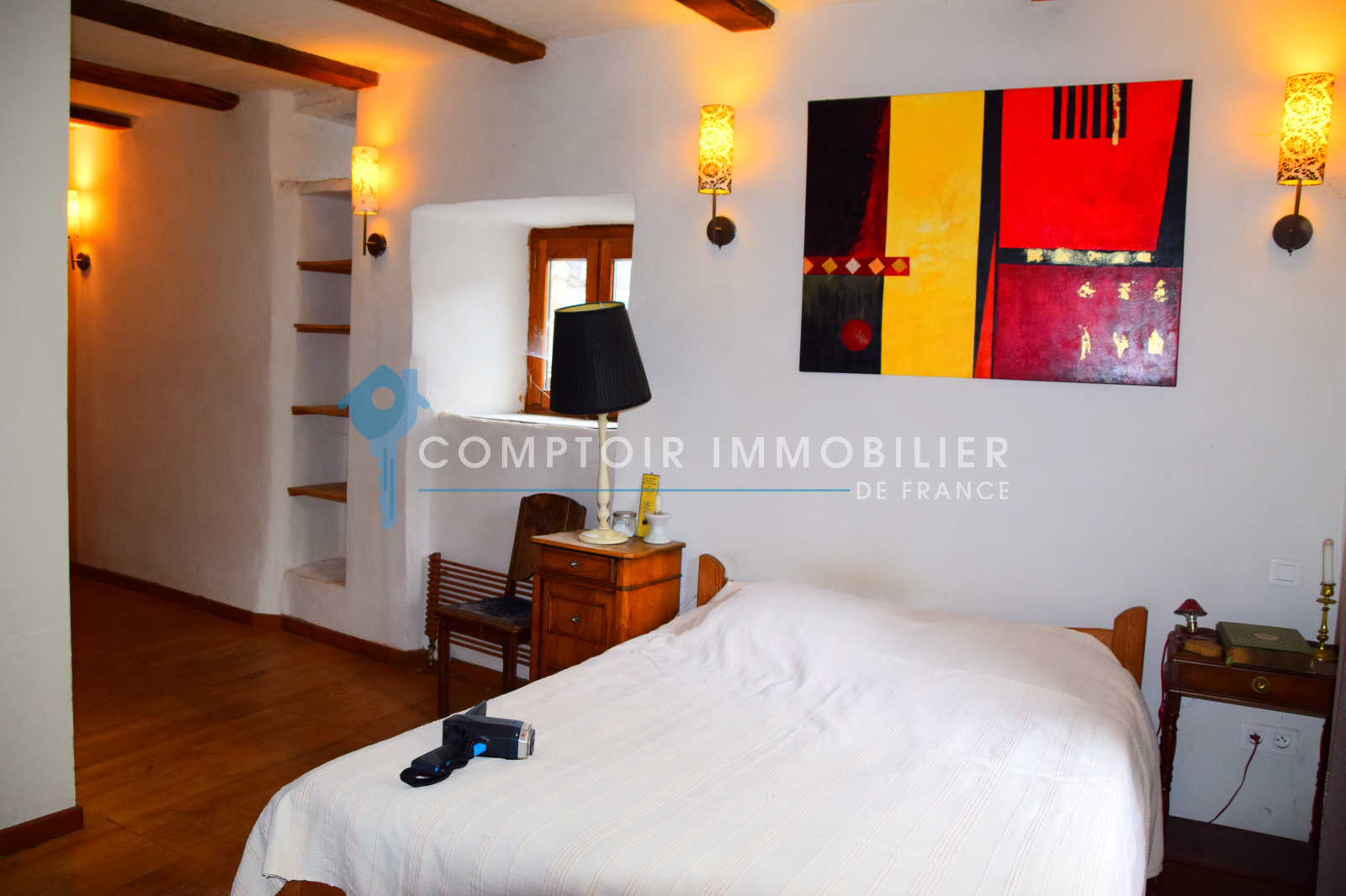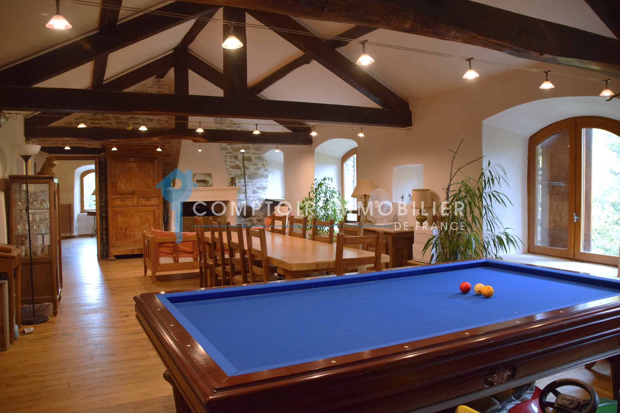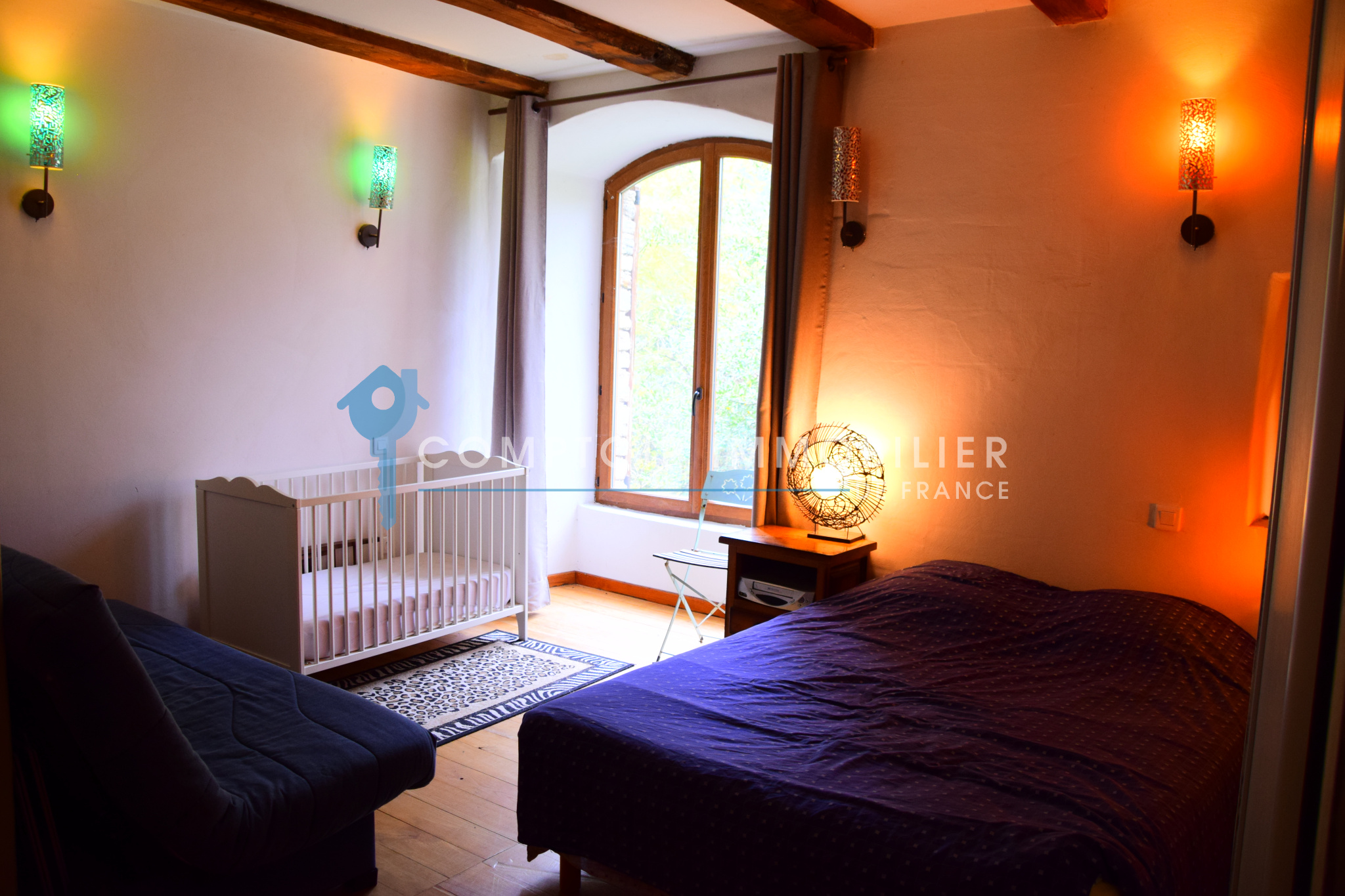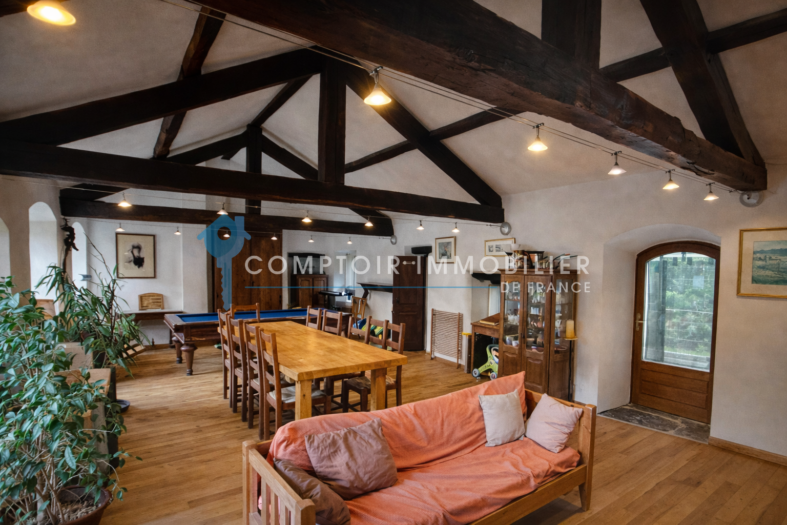Cette grande bâtisse en pierre avec toiture en lauze, se compose de 3 niveaux sur une superficie habitable de 190 m² environ, auquel se rajoute 64 m² environ de caves, ainsi que 100 m² environ de garage couvert.