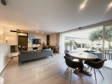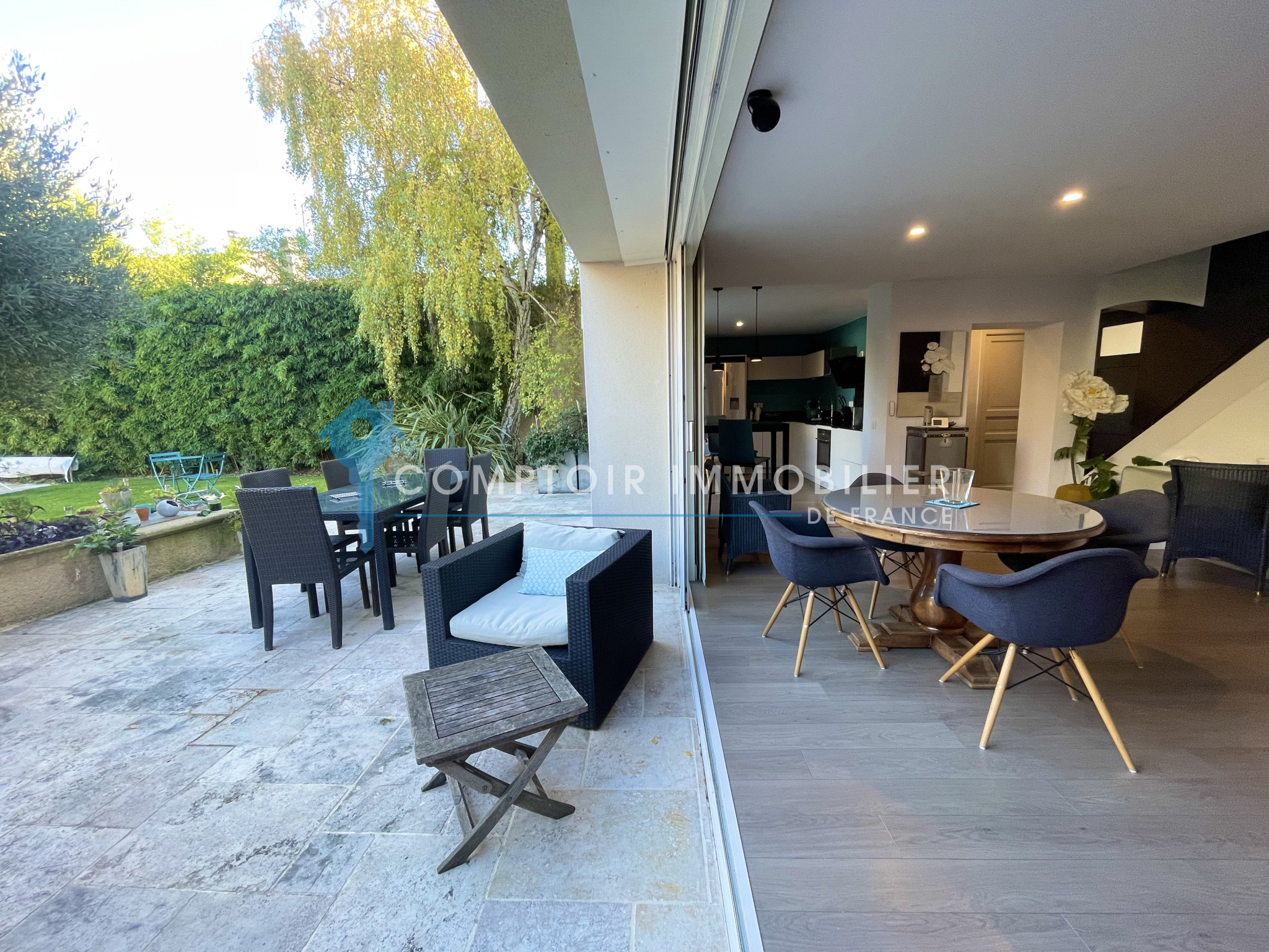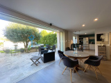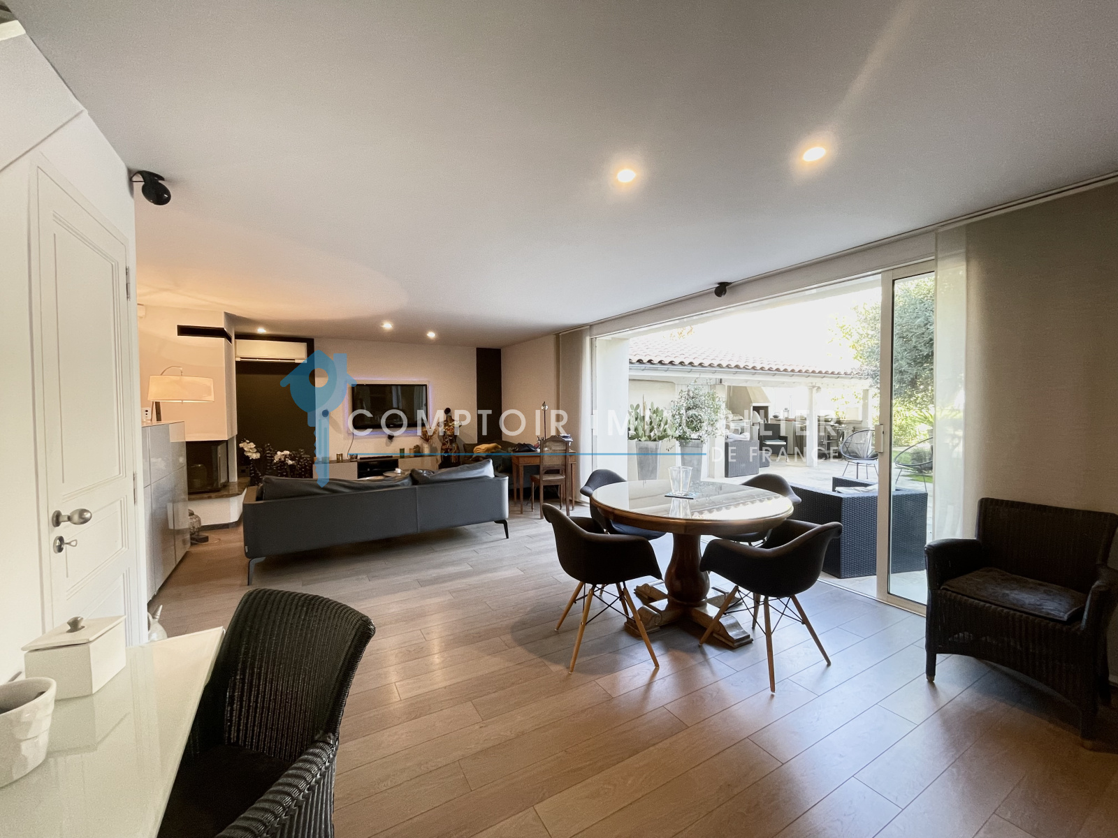 Au rez-de-chaussée, une belle pièce de vie d'environ 50m2 avec cheminée et sa baie vitrée à galandage qui permet une ouverture totale sur la terrasse travertin et le jardin agrémenté d'une piscine et d'un pool-house. Le tout, sans vis-à-vis et sans nuisances, en plein centre ville.