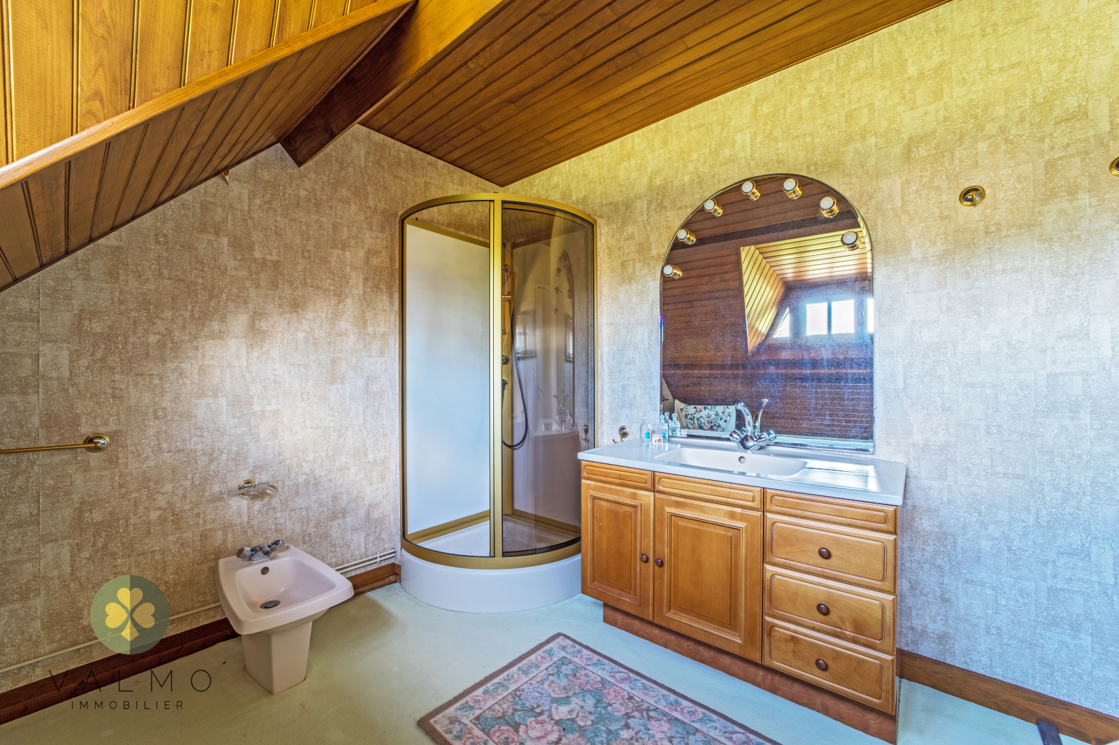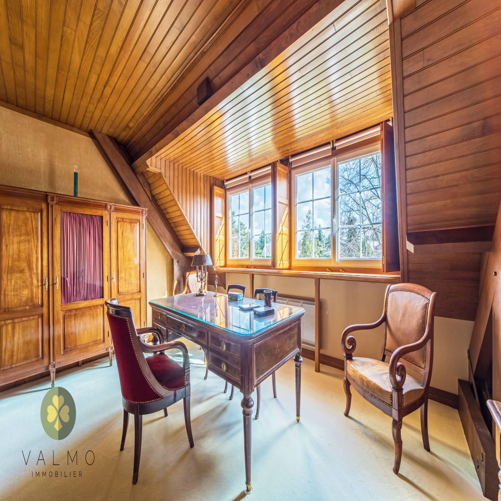 À l’étage, un salon, une chambre, un bureau / chambre, un dressing, une salle de douche et un WC indépendant.