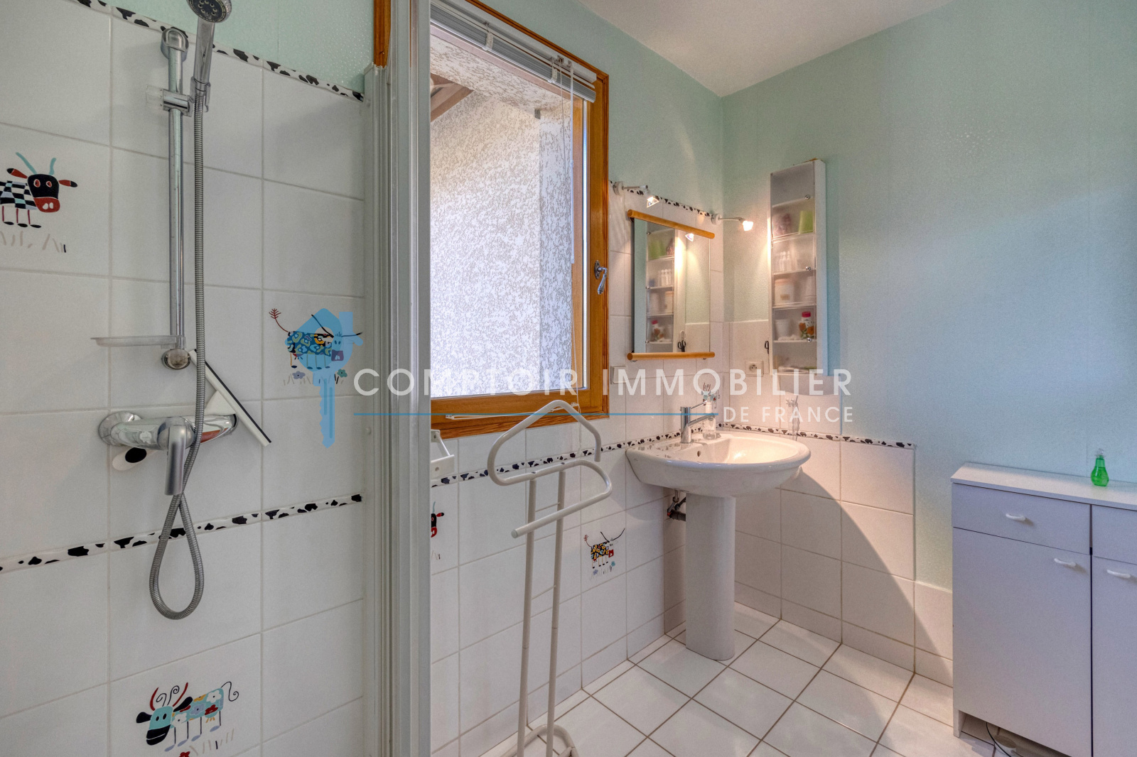 Elle se compose au RDC, d'une entrée spacieuse de 17m² avec rangements et coin bureau, d'une cuisine équipée ouverte sur la pièce de vie (séjour + salle à manger) totalisant 65m² et donnant sur le jardin, d'une buanderie de 9m² et d'un wc séparé.