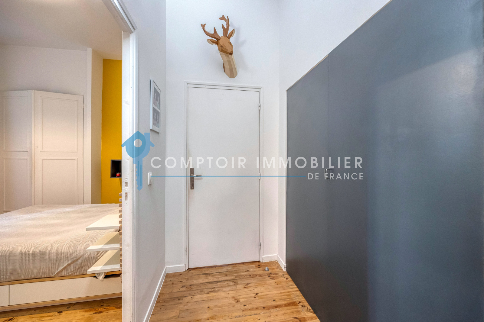 L’appartement, situé au 1er étage, donne sur la cour intérieure, garantissant calme et sérénité. Vous serez séduits par sa vaste pièce de vie de 35 m², où une cuisine équipée se fond harmonieusement dans un décor chaleureux. La chambre spacieuse de 14 m² dispose d'un dressing, et la salle d'eau, avec WC, complète ce bien.