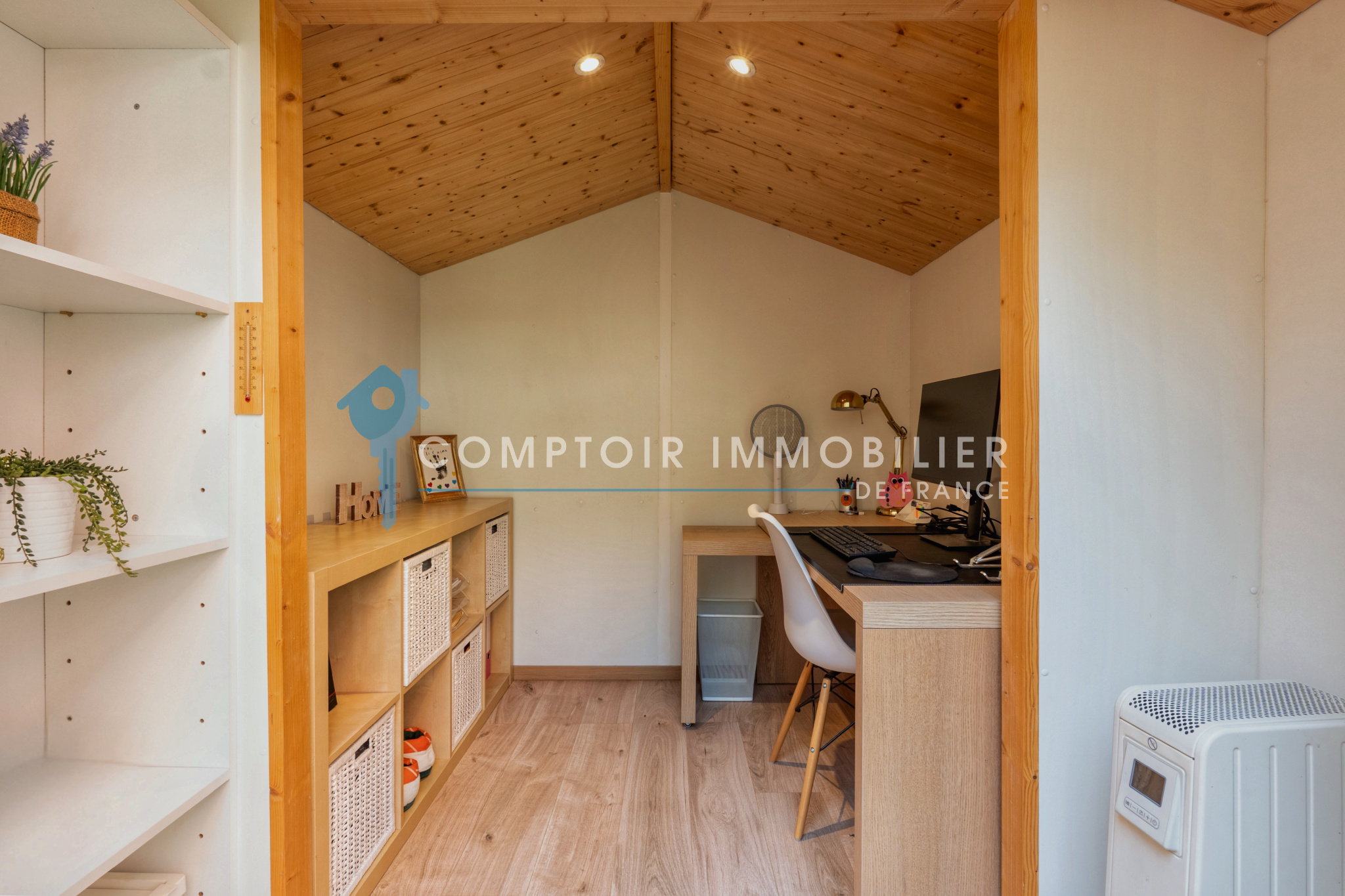 L’extérieur de l’appartement dessert un jardin de 112 m² avec une terrasse et une annexe pouvant servir de rangement ou de pièce supplémentaire! (actuellement bureau pour le Home Office, Climatisation possible..)