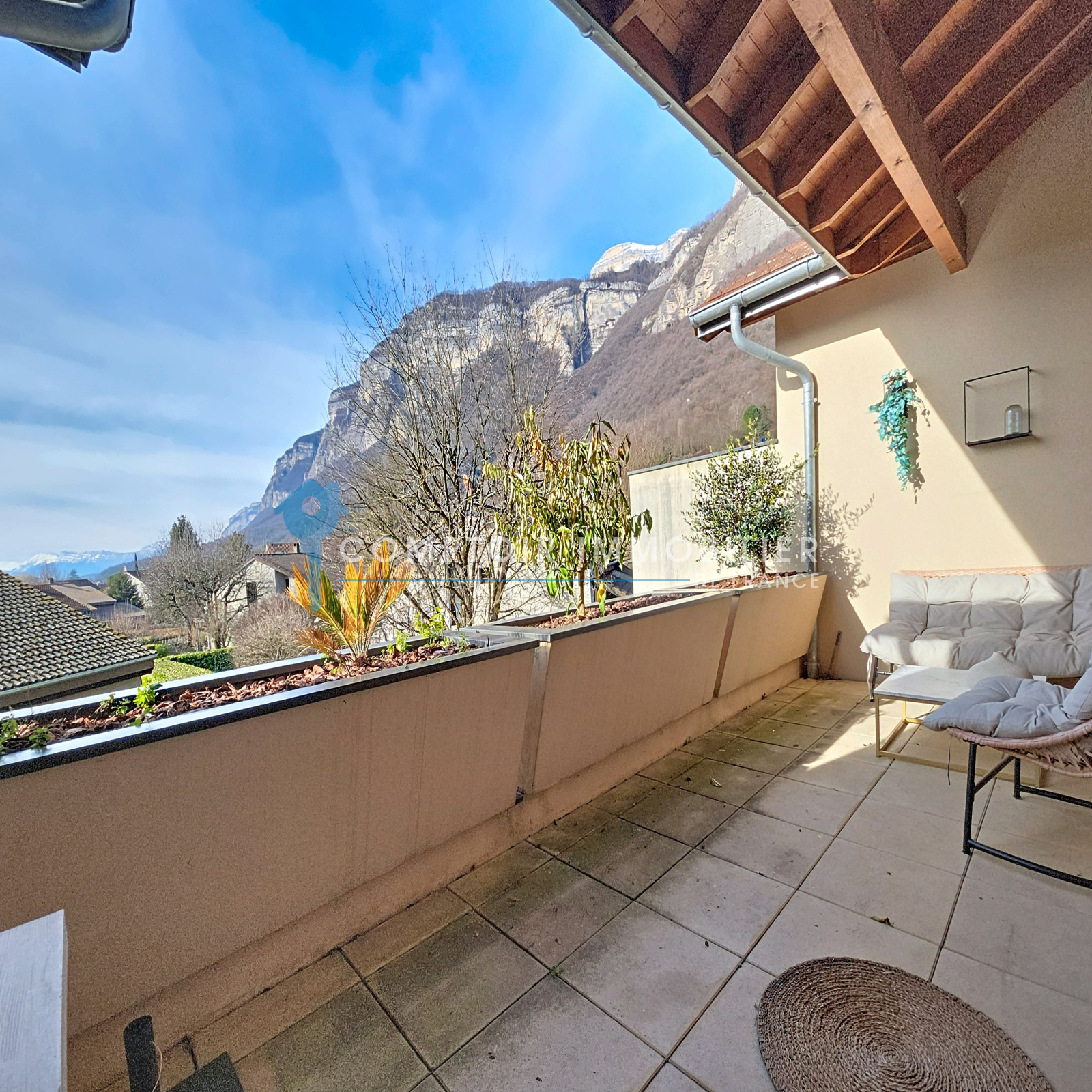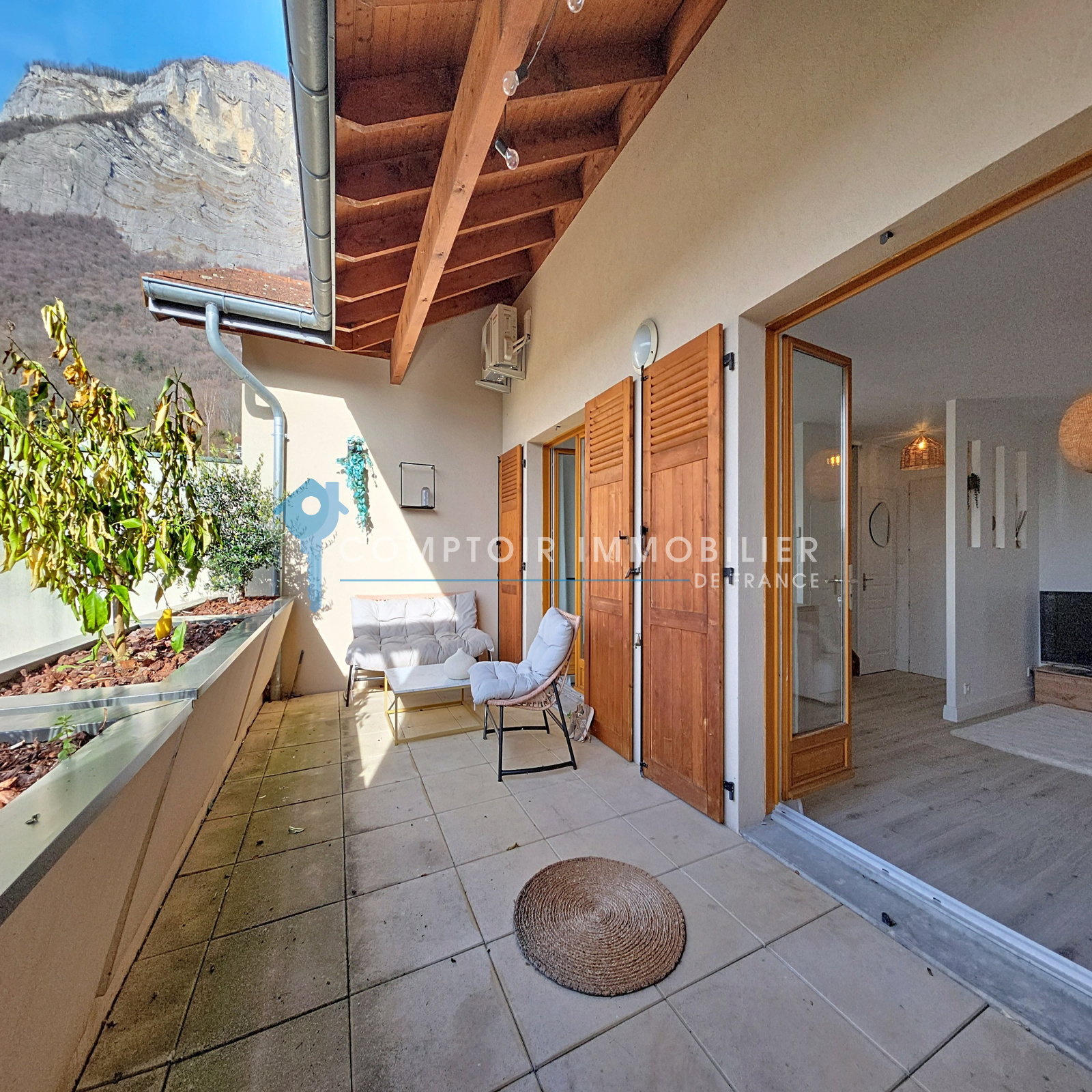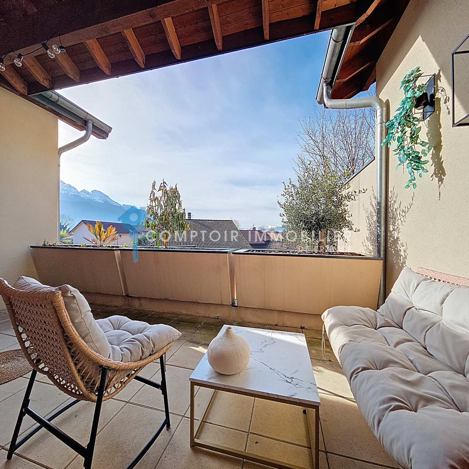 Sa terrasse couverte de 16 m², offrant une vue dégagée sur les massifs, sans vis-à-vis, finira de vous charmer !