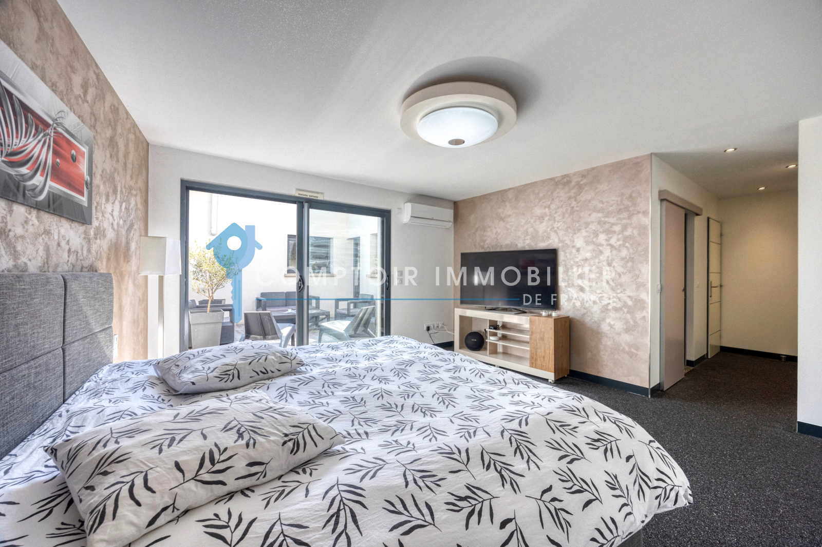 La suite parentale fait plus de 25 m2 avec salle d'eau, dressing et une grande baie vitrée avec accès direct sur le Patio
