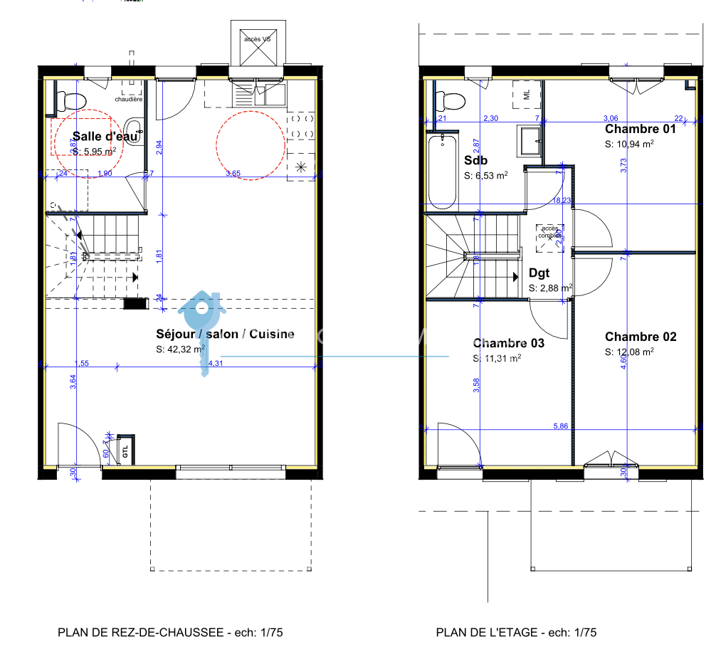À l'étage, un pallier dessert 3 chambres de 11m2 à 12m2 ainsi qu'une salle de bain, également avec wc.