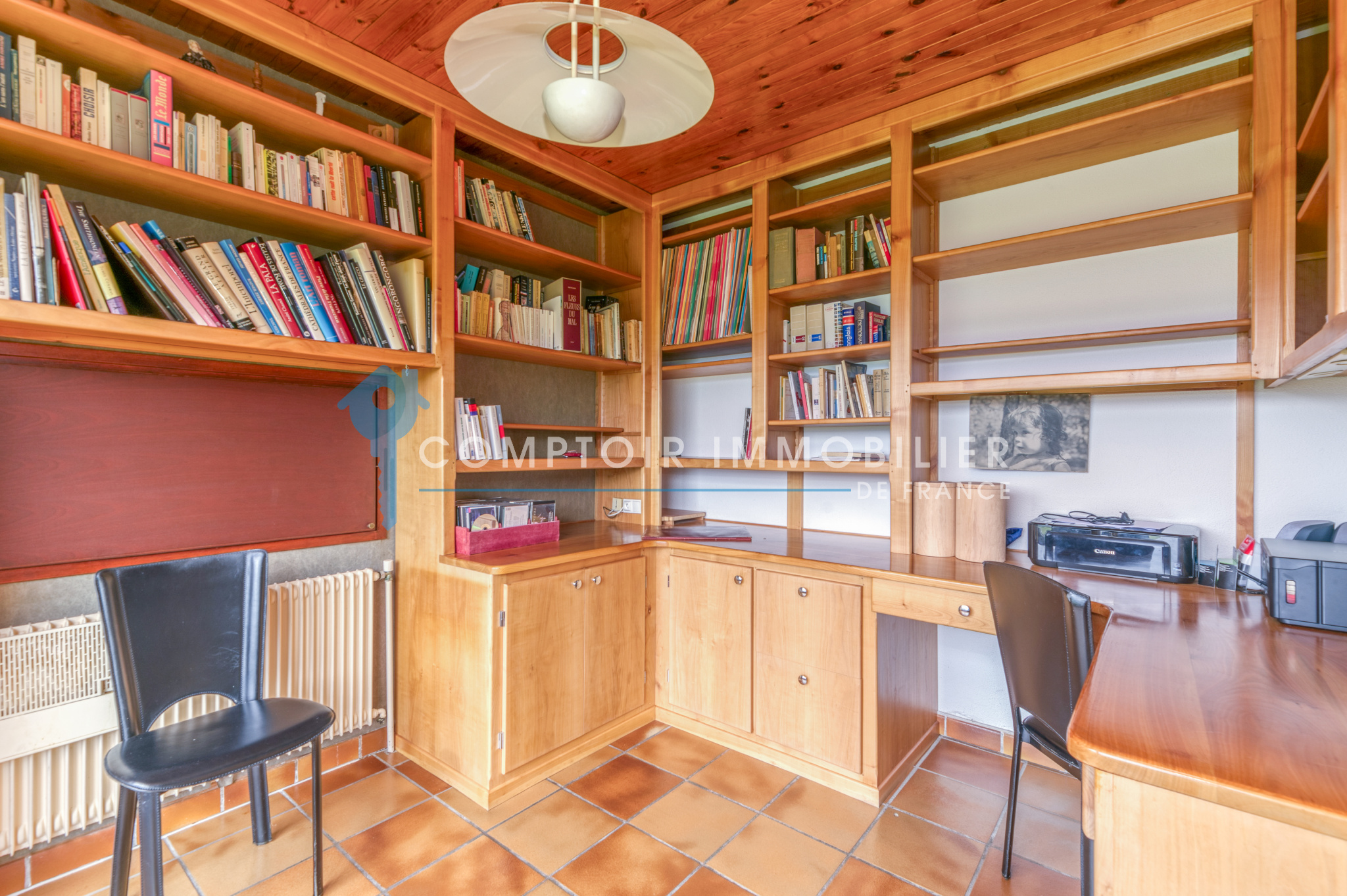 En rez de Jardin, grande entrée donnant sur un séjour avec vue panoramique sur la ville de Grenoble, un bureau de 9m2 et une cuisine séparée de 17m2. Cellier de 5m2 proche de la cuisine avec accès au garage de 17m2.