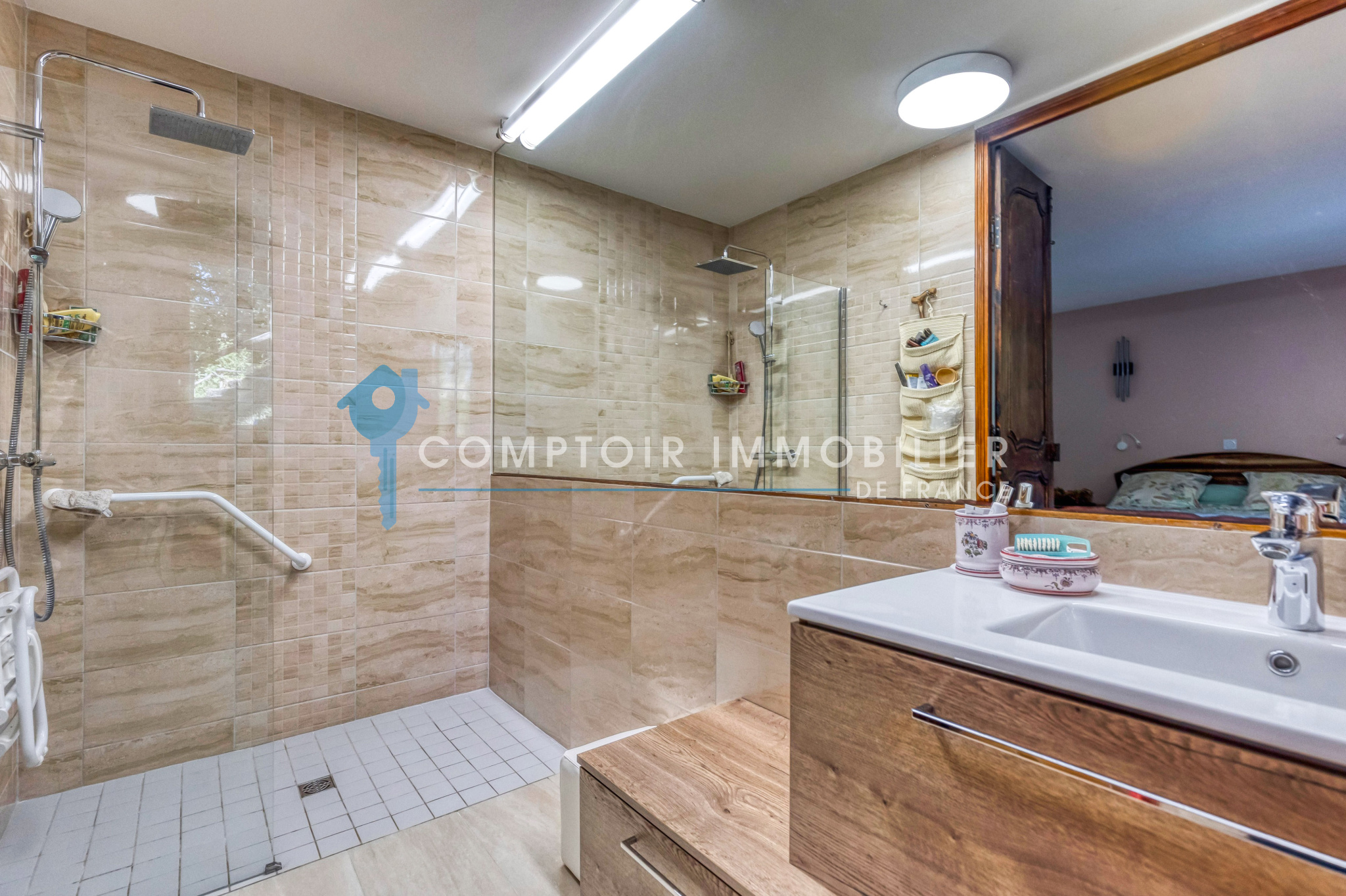 Sa cuisine séparée avec ses portes palières en Noyer. Sa suite parentale sublimée toujours par le cachet de l'ancien avec aussi de belles portes palières menant directement à la salle d'eau ( douche a l'italienne avec 2 vasques ) et une intendance avec machine a laver , rangements.