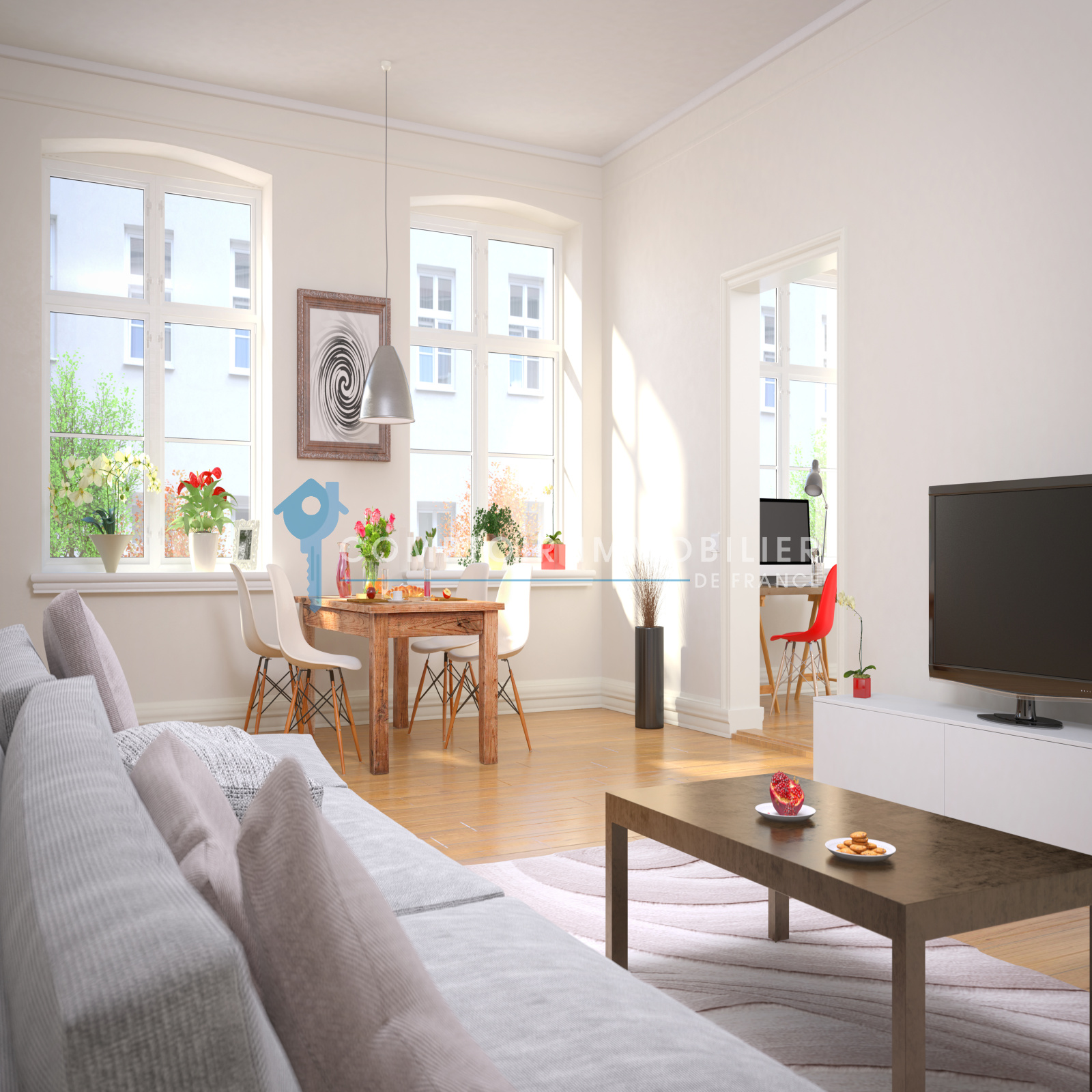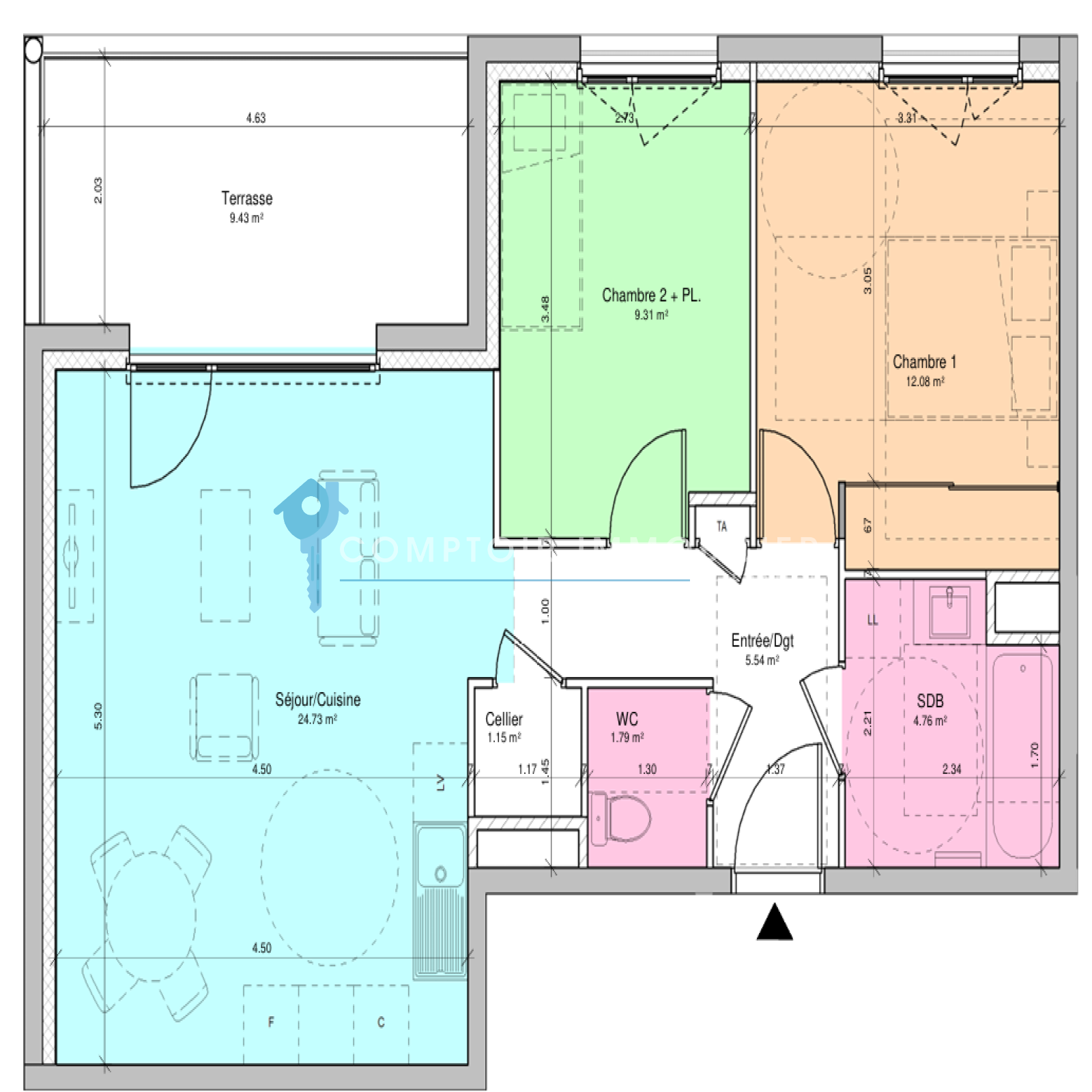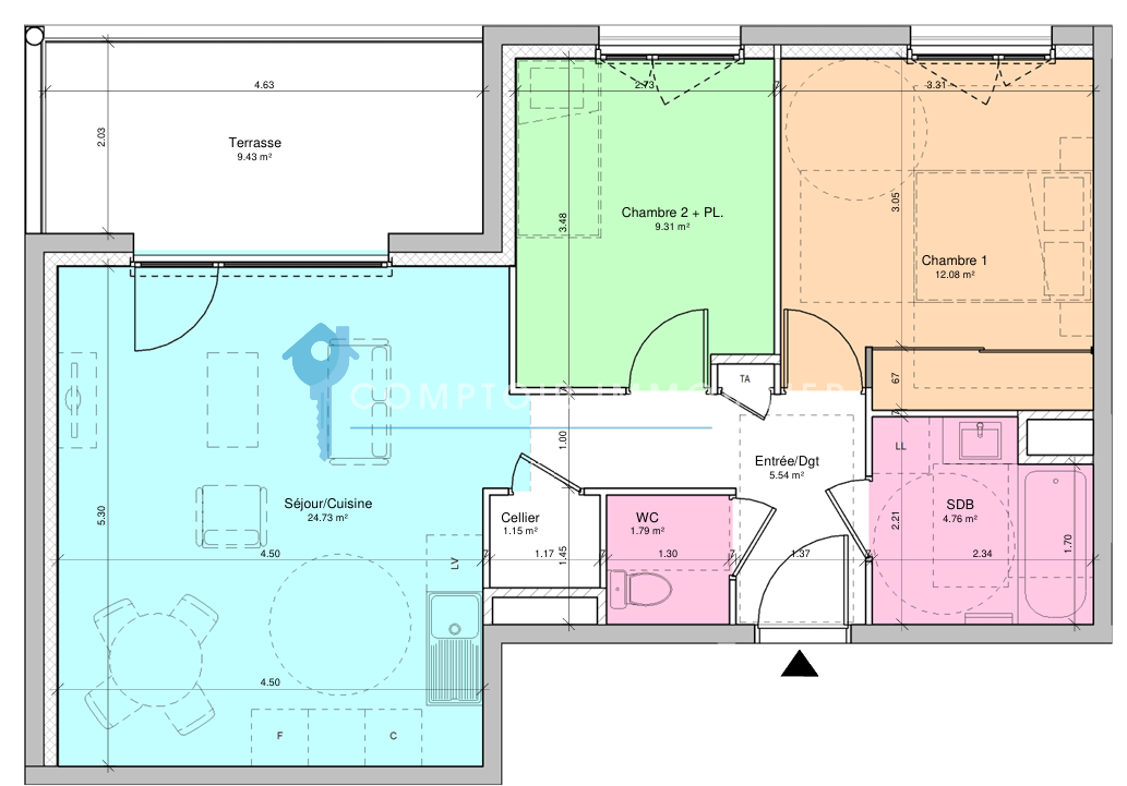 Logement T3 d'une superficie de 59 m² . Le logement se compose d'une pièce de vie avec séjour et cuisine, de deux chambres, d’une salle de bains / salle d'eau et de WC indépendants.