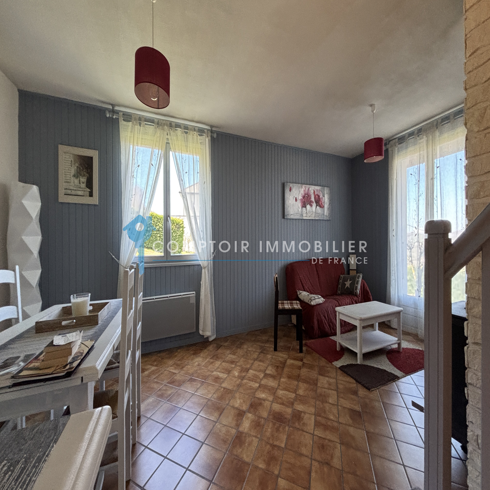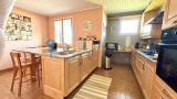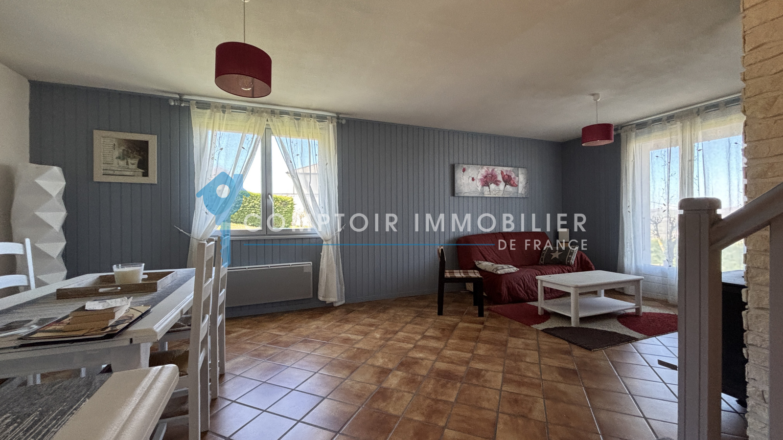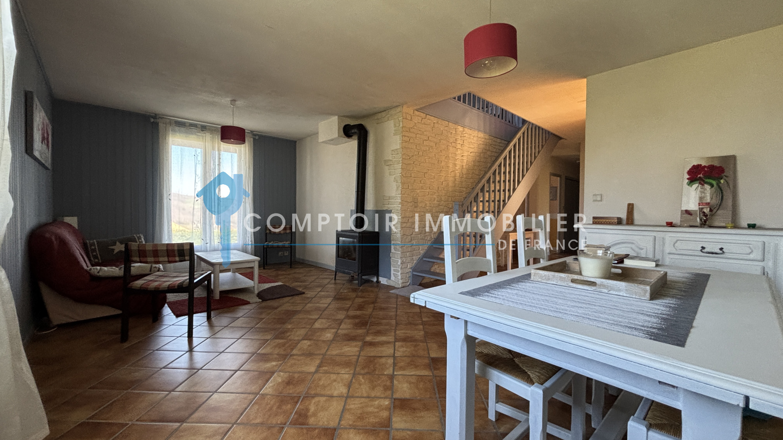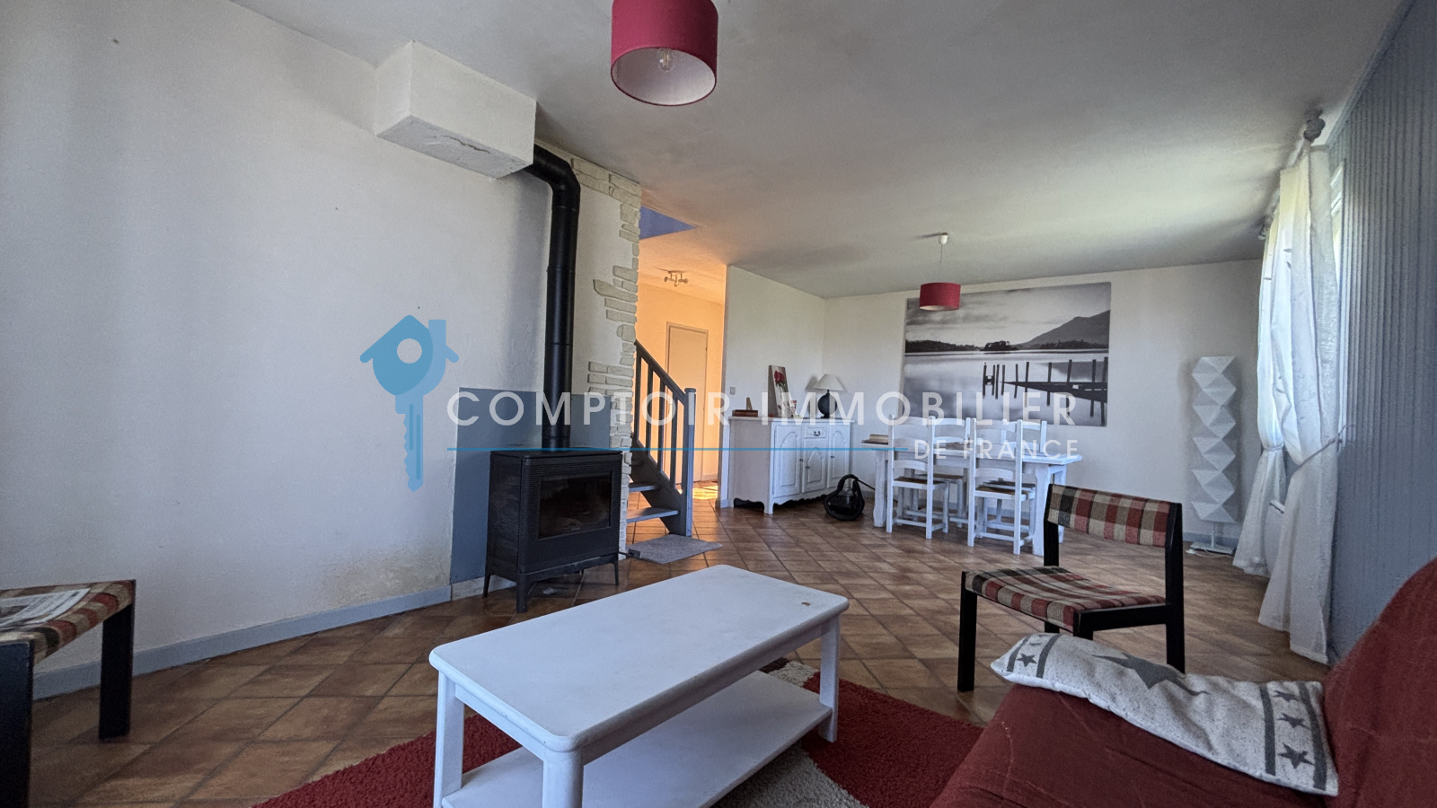 La maison propose un bel espace de vie lumineux au rez-de-chaussée avec salon salle à manger et son poële à bois, ouvrant sur une grande terrasse idéale pour profiter.