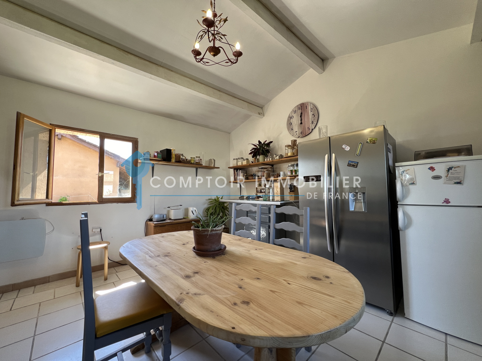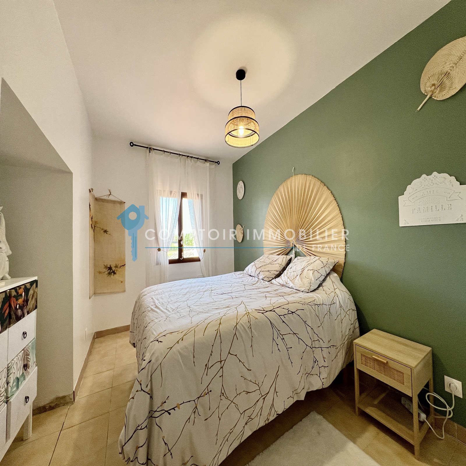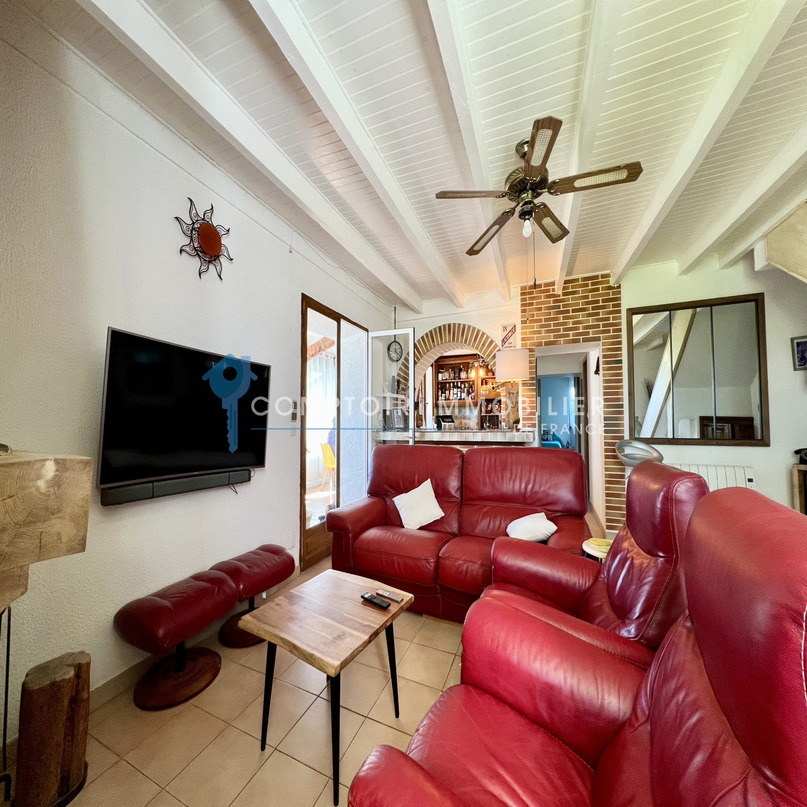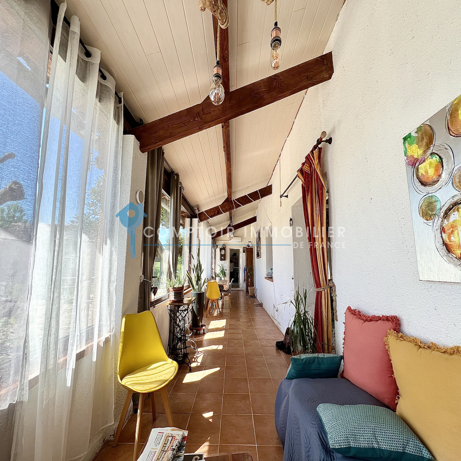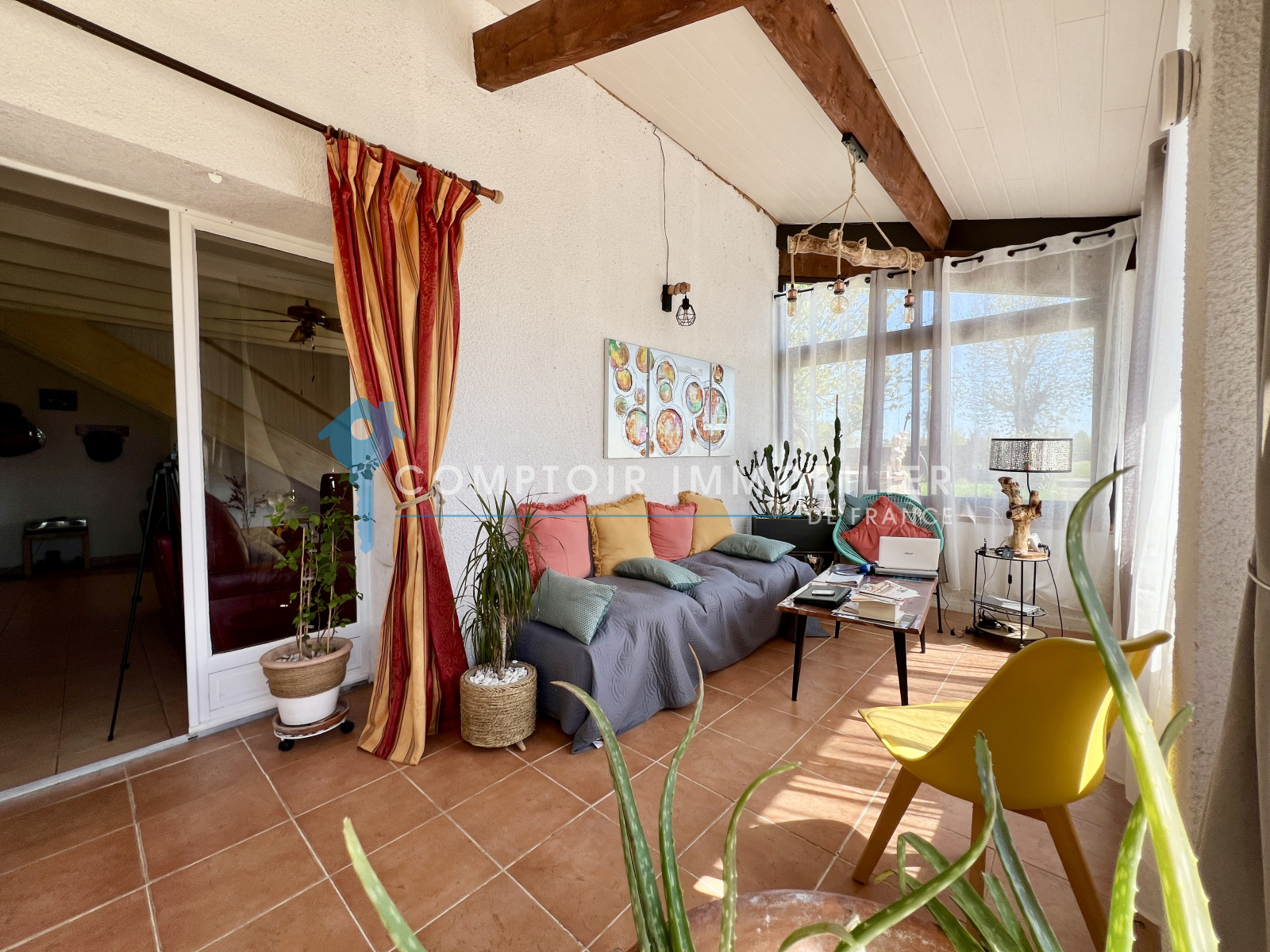 L'entrée se fait par une agréable véranda équipée d'une climatisation réversible, salon cosy avec coin bar et insert, cuisine fermée, buanderie, WC et grande chambre avec placards en RDC.