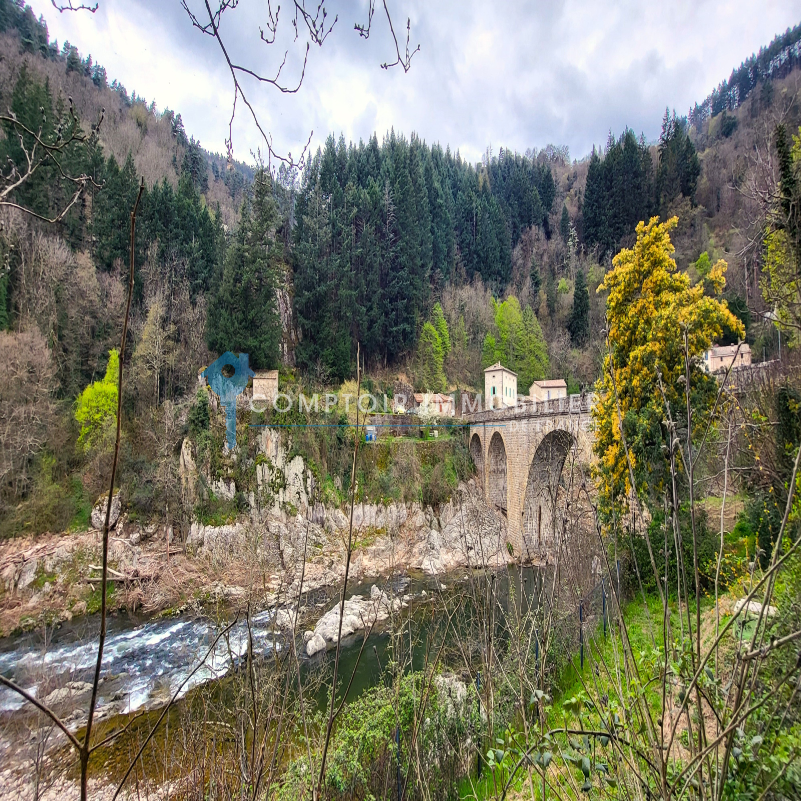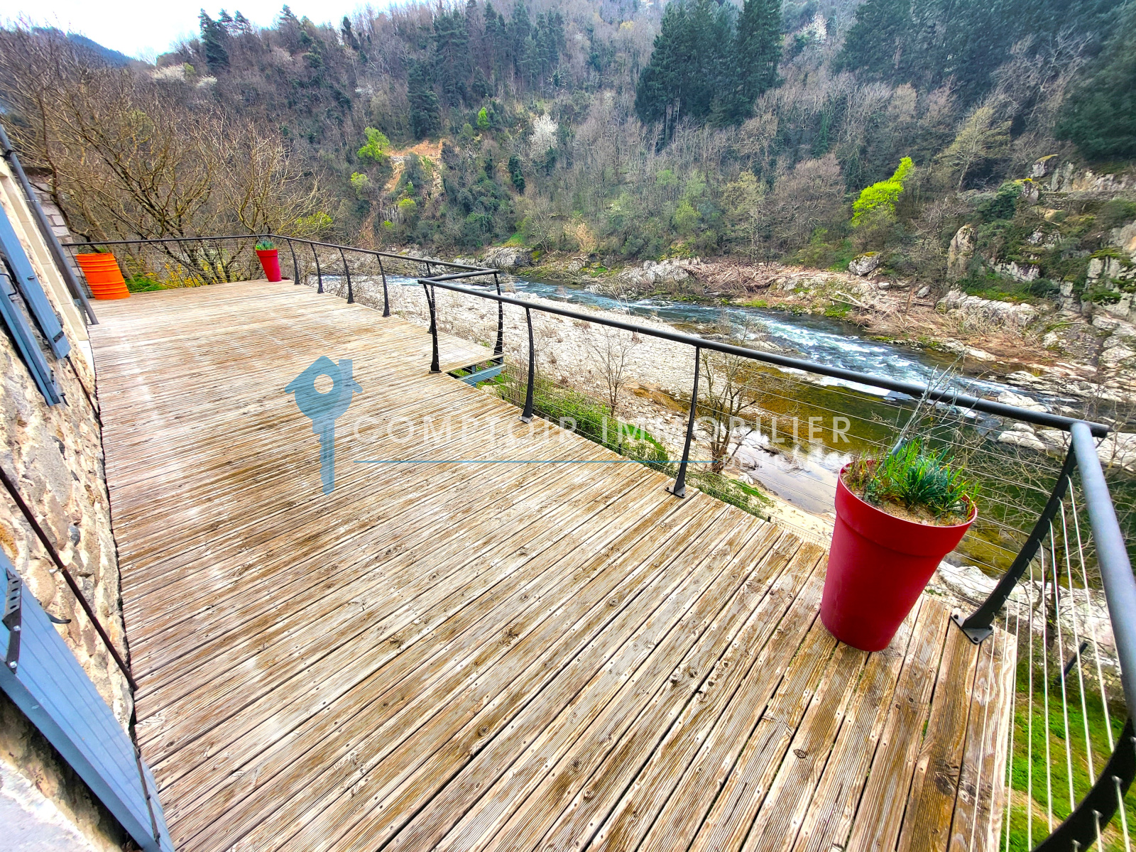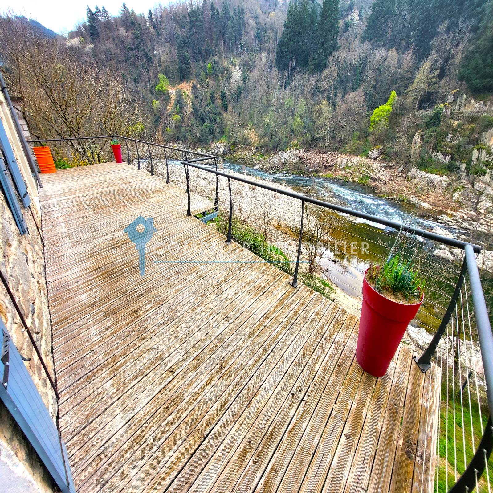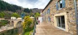 Espaces complémentaires & Extérieur : Garage de 27 m², pouvant accueillir une voiture, motos et vélos, équipé d’une porte électrique avec télécommande. Quatre caves voûtées au rez-de-jardin. Terrain en terrasses avec murs en pierres sèches, descendant jusqu’à la rivière, pour une surface totale de 2 836 m².