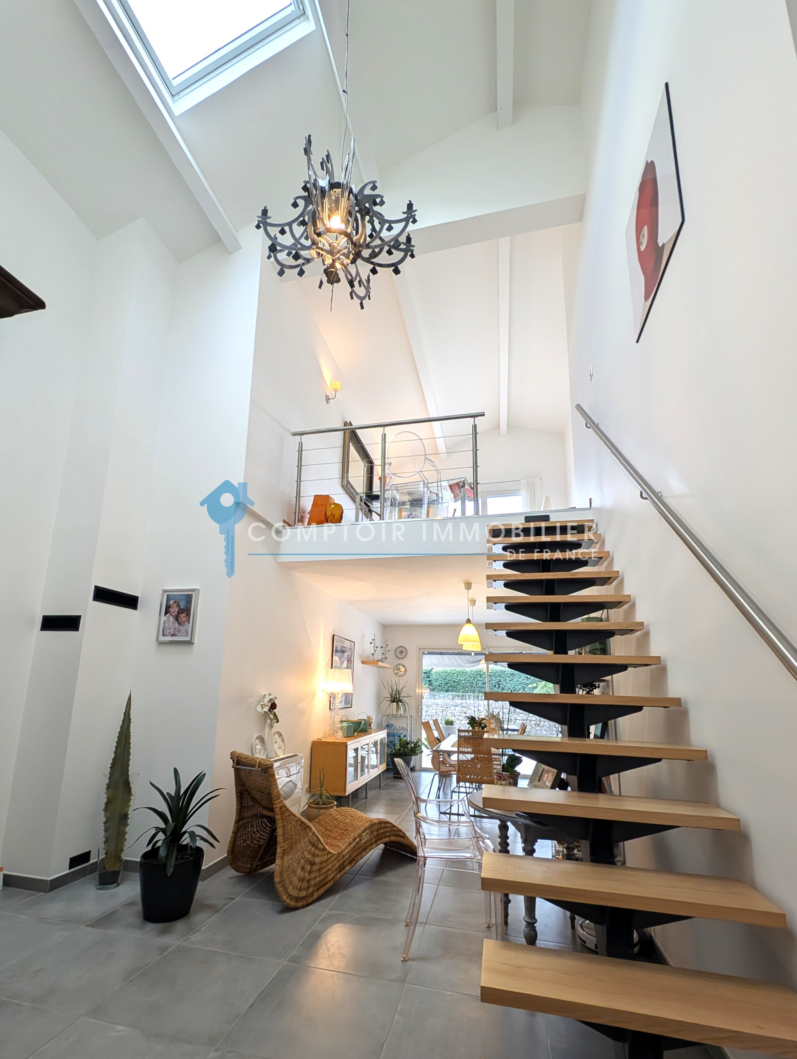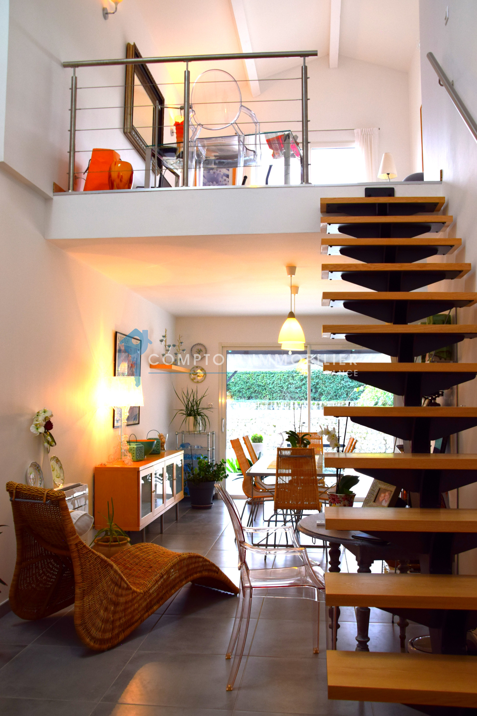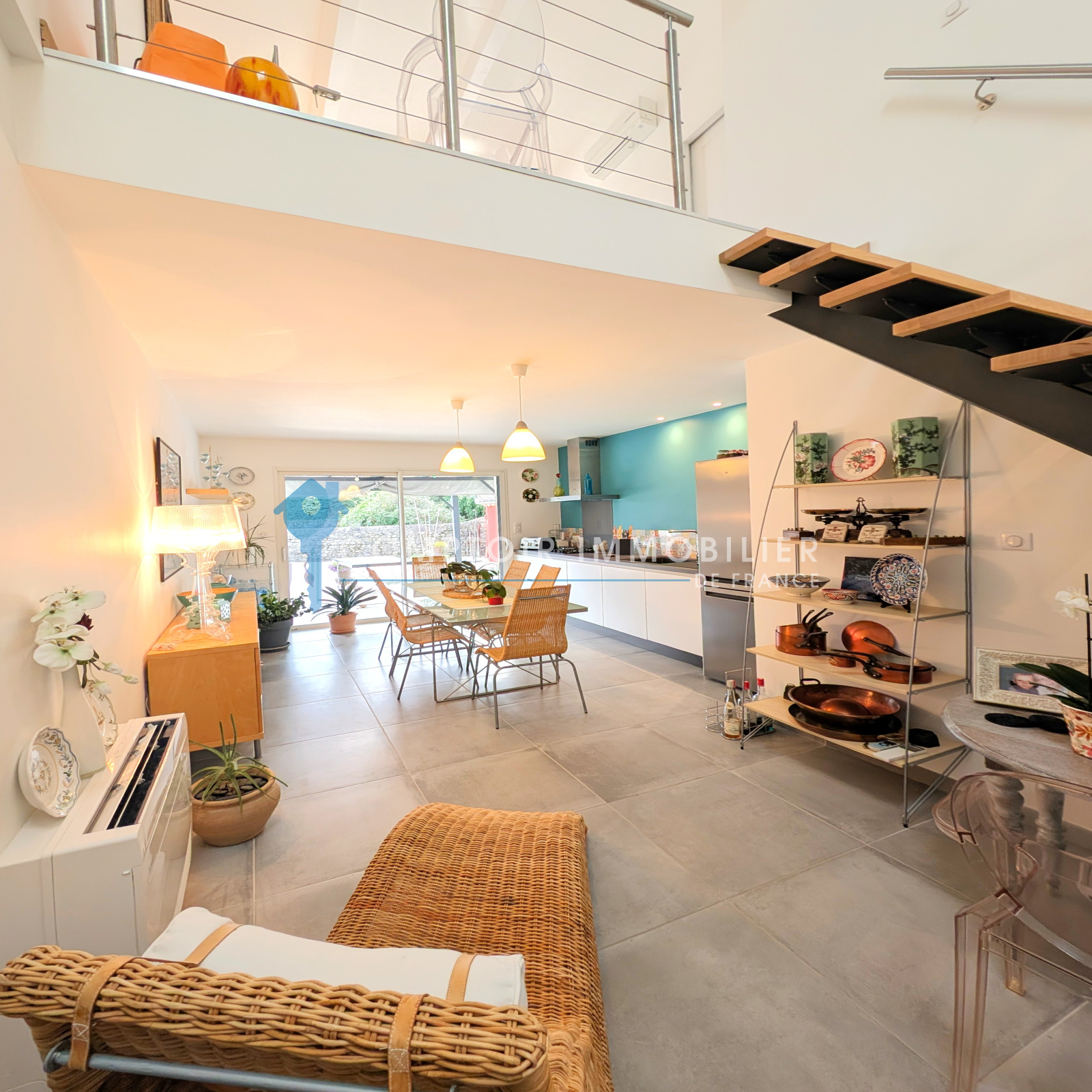 Enfin, la villa possède également un magnifique espace lumineux qui se compose d’un salon avec une deuxième cuisine ouverte équipée, donnant accès sur une baie vitrée ouvrant sur la grande terrasse extérieure. Cette pièce de plus de 35 m2 au sol, propose en plus une mezzanine accessible par un escalier en bois et acier, et donnant accés à une quatrième suite avec sanitaire. Cet espace aéré avec une hauteur sous plafond de plus de quatre mètres, peut être à la fois communiquant et indépendant de la maison. Idéal pour un espace d’été, pour une location, un gîte, ou simplement pour accueillir des amis.