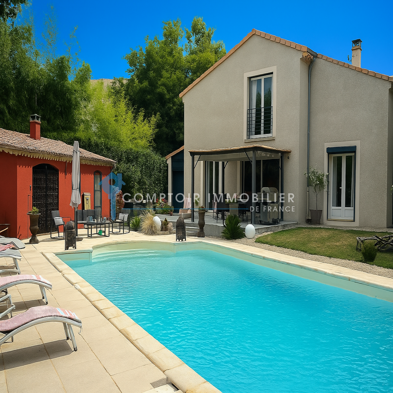 La villa propose également une superbe pergola orientée plein Sud et surplombant cette belle piscine, ainsi qu’une petite terrasse côté Est pour prendre son café le matin au lever du soleil.