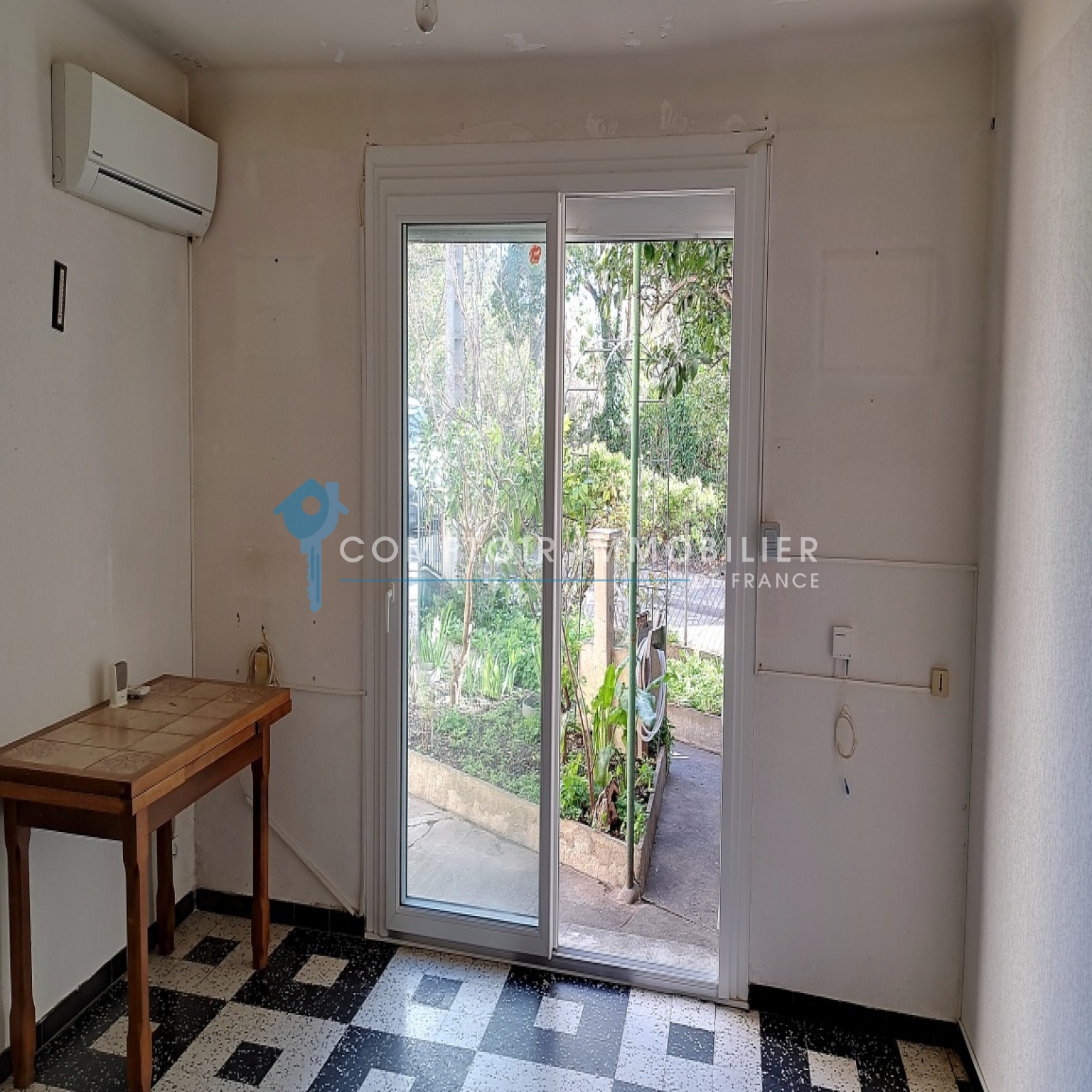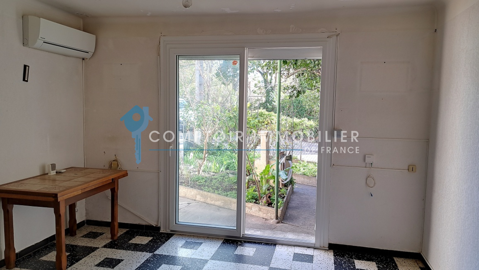 Au rez-de-chaussée, un salon avec une baie vitrée , une cuisine séparée donnant sur une autre cours située à l'arrière de la maison ainsi qu'un cellier.