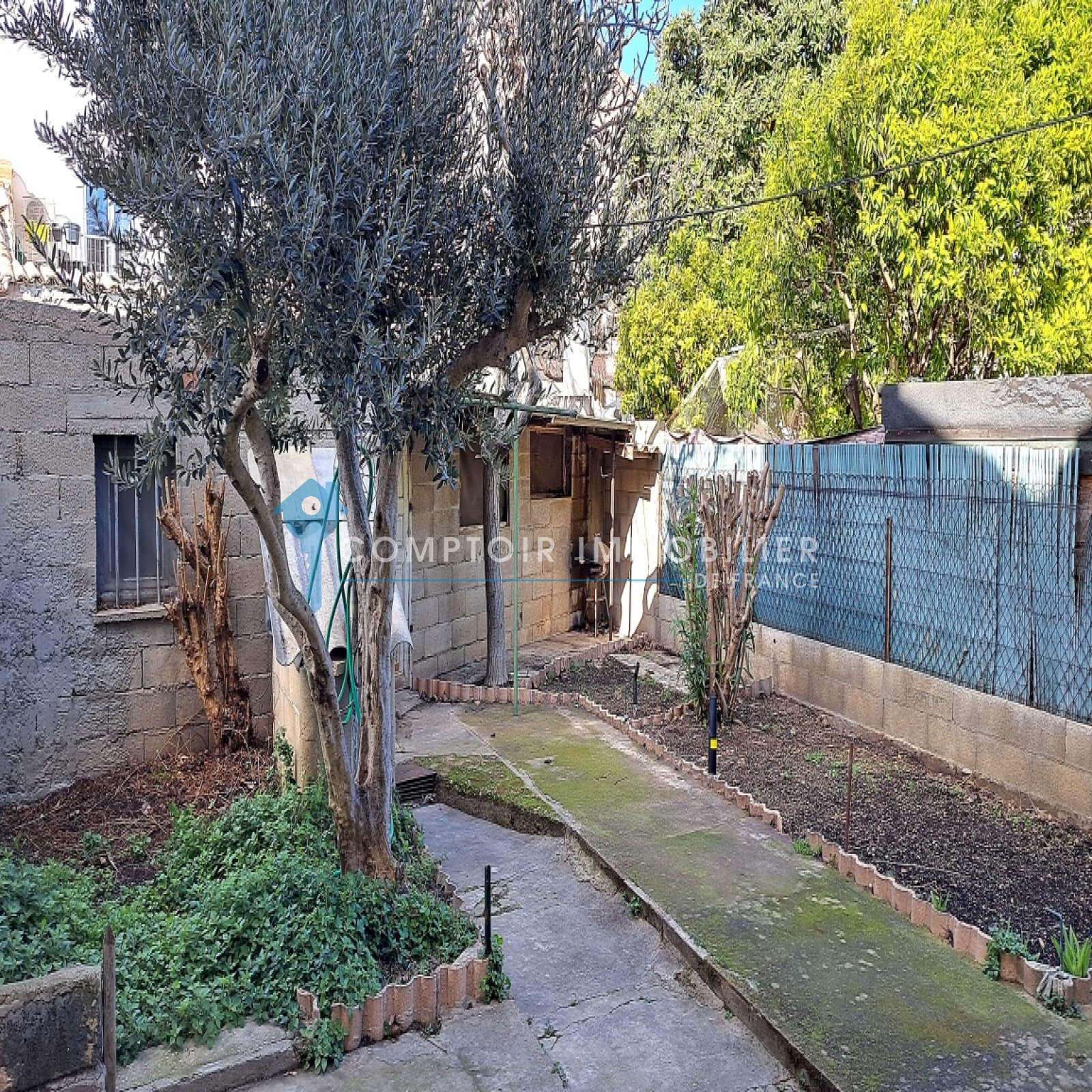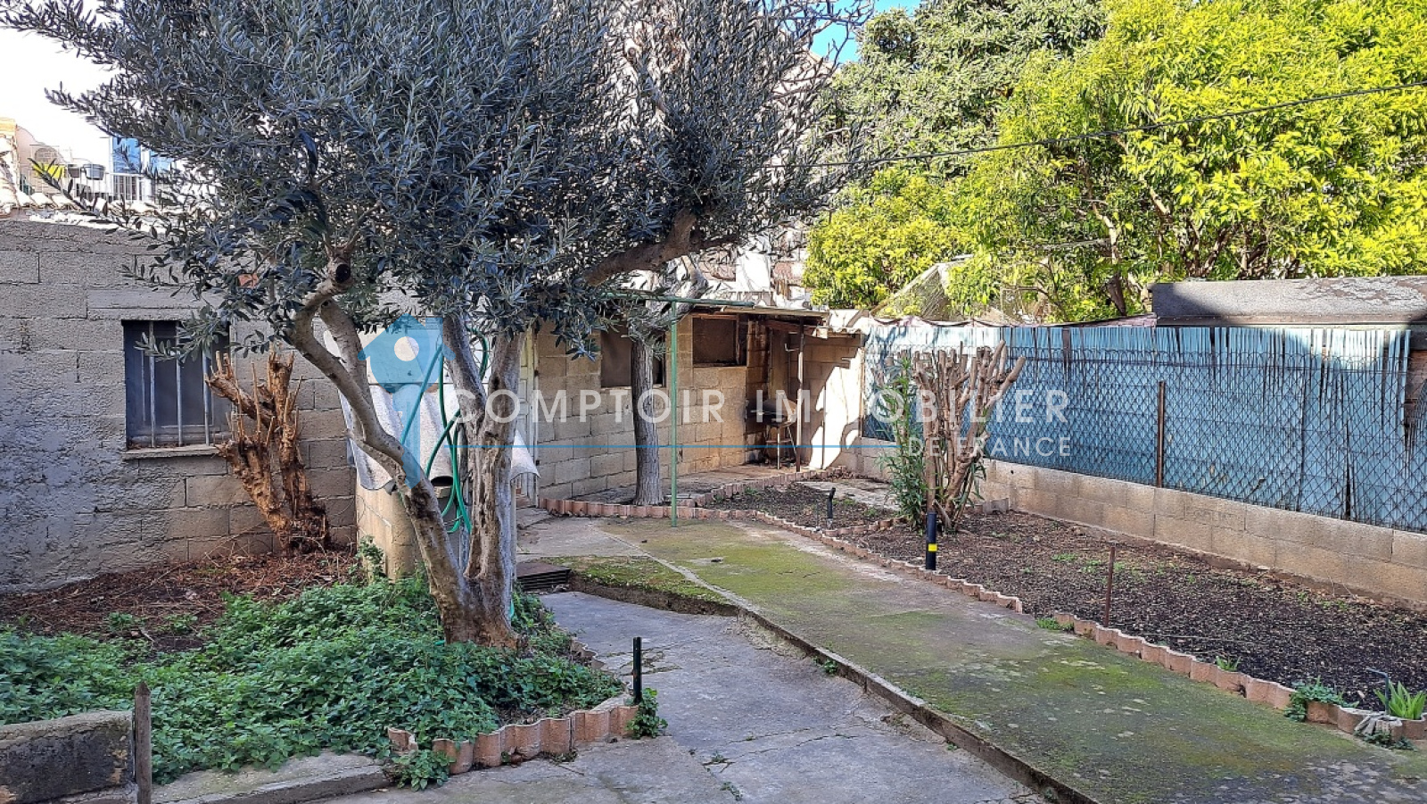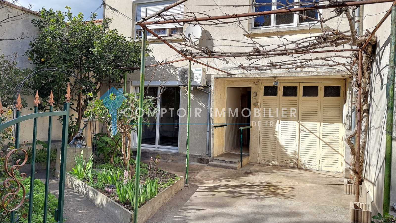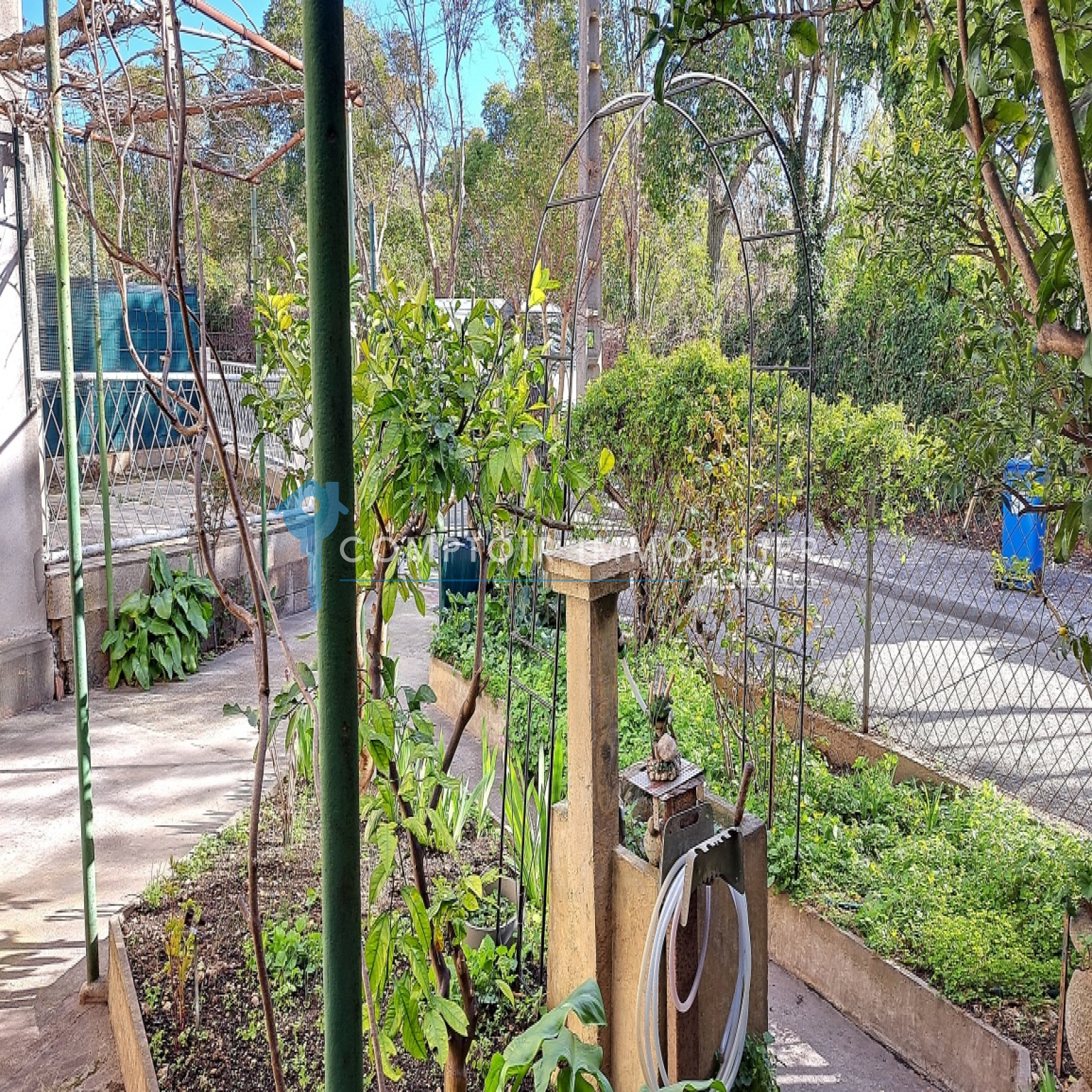 Vous entrez sur une cour arborée et parfaitement entretenue avec un accès à l'entrée principale de la maison ainsi qu'un garage de 14M2.