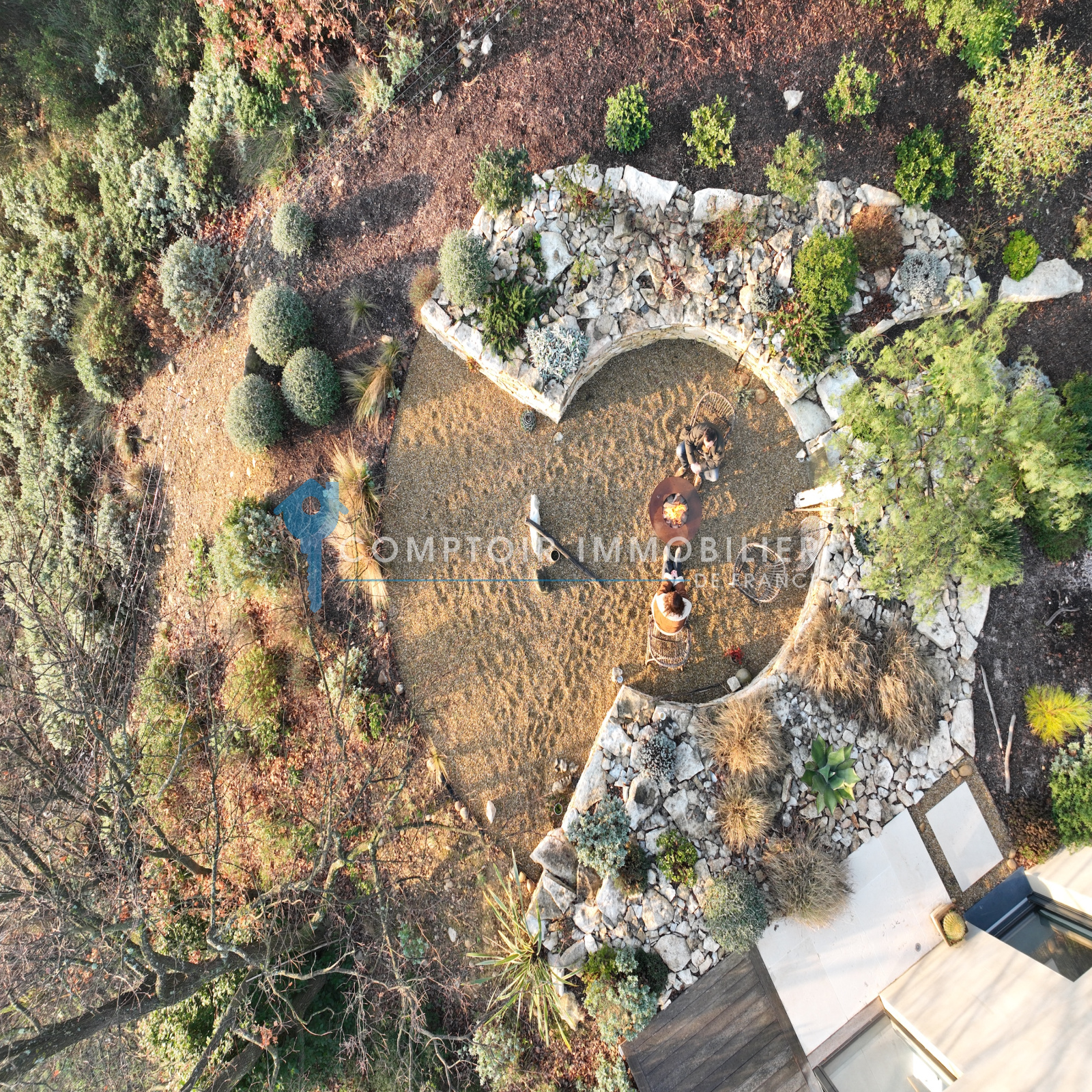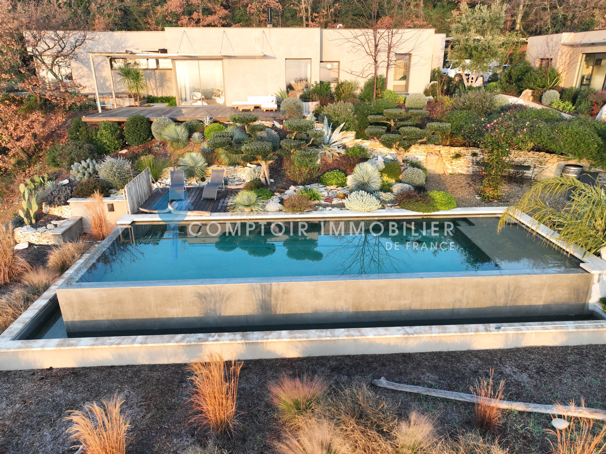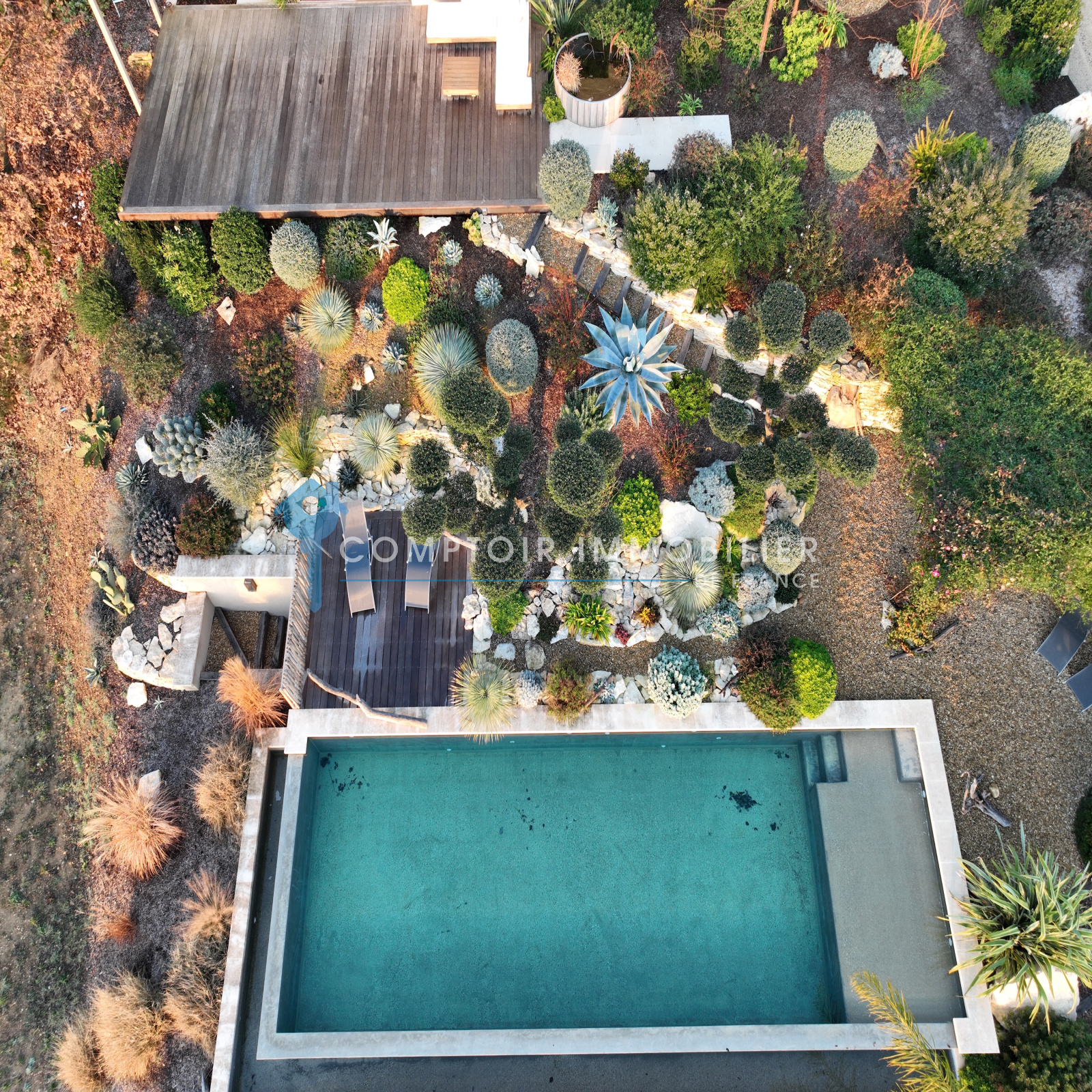 Le terrain, entièrement paysagé, compose une mise en scène naturelle : terrasses minérales, essences méditerranéennes, vignes et jeux d’ombres créent une ambiance élégante et apaisée, où chaque zone extérieure devient un lieu de vie.