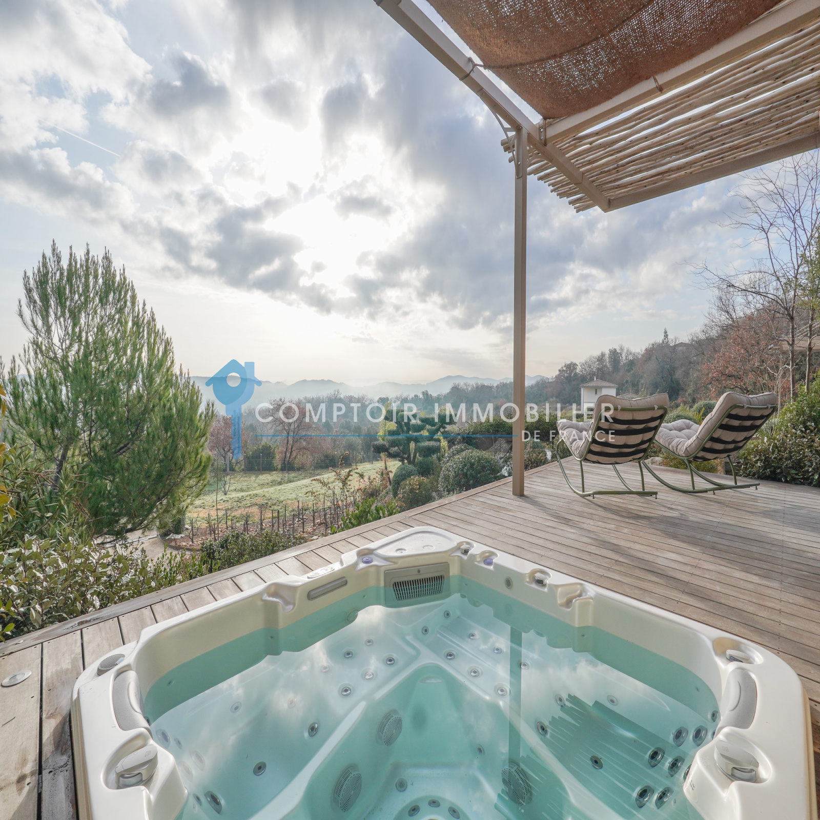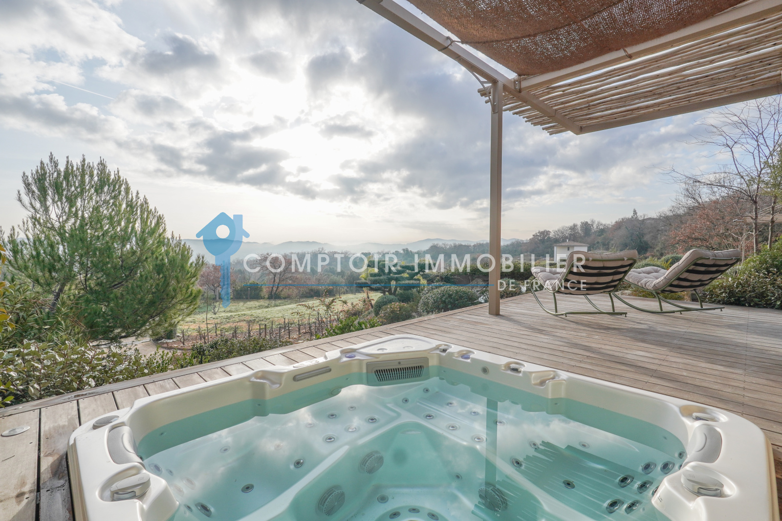 À l’écart de la maison principale, une dépendance autonome enrichit encore le lieu. Son séjour avec cuisine ouverte, sa chambre élégante et sa salle d’eau raffinée prolongent l’esprit maison. Sur la terrasse privative, un jacuzzi exclusif invite à des instants suspendus face au panorama. Cet espace indépendant permet toutes les envies :