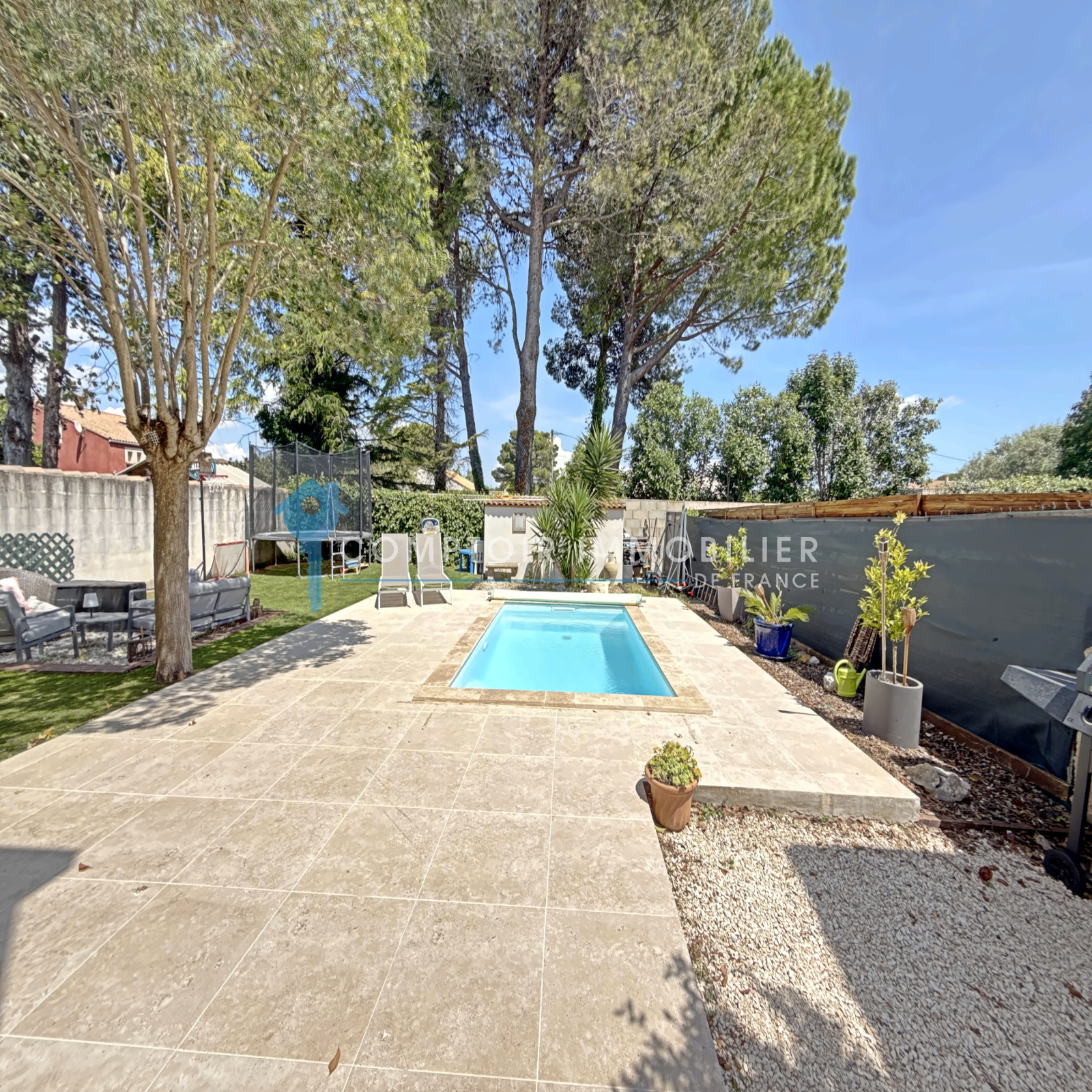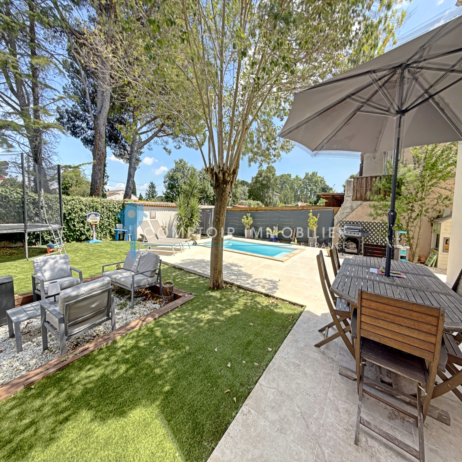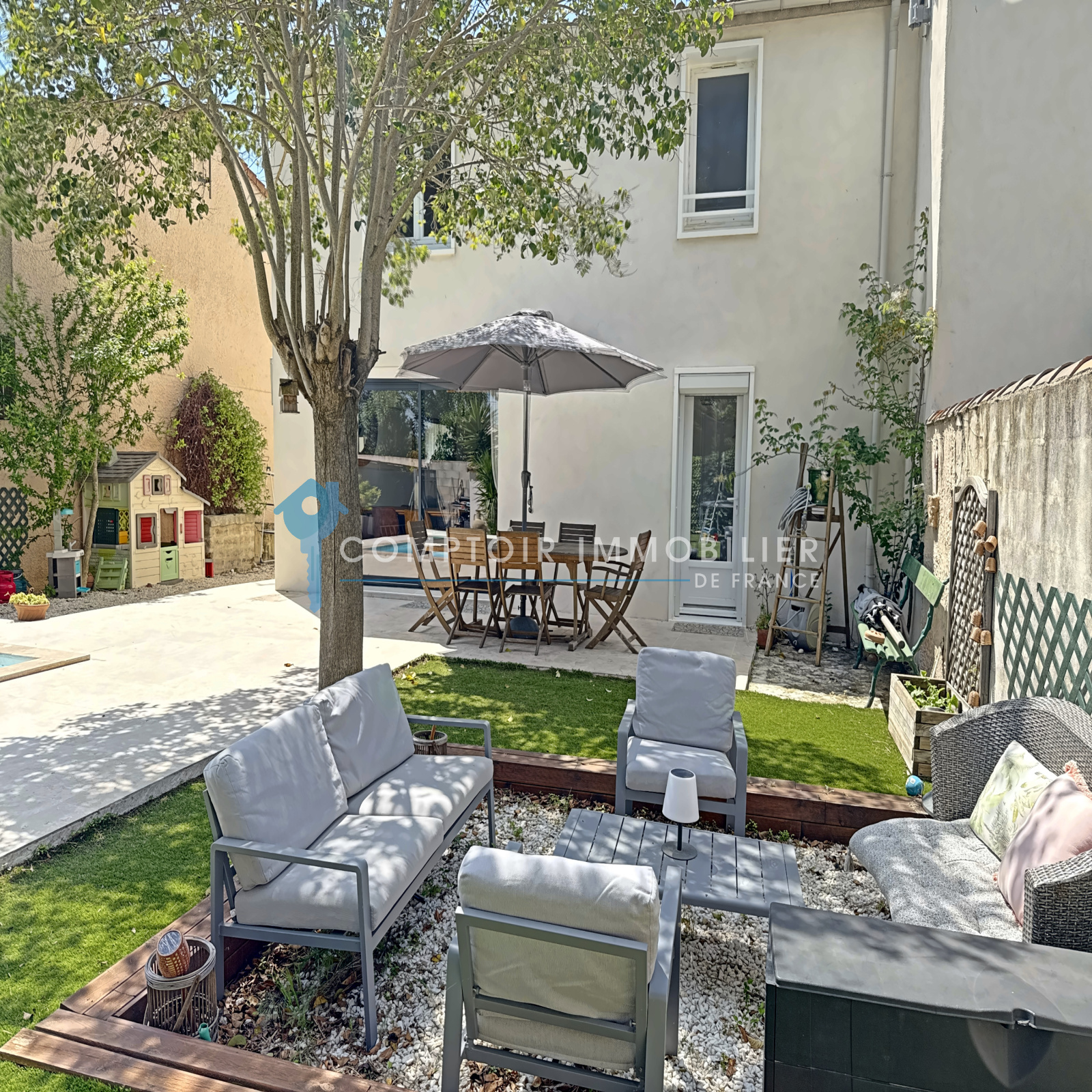 A l'exterieur , vous profiterez d'un jardin arboré de 336 M2 , avec terrasse , espace détente et piscine pour vos moments en famille ou entre amis .