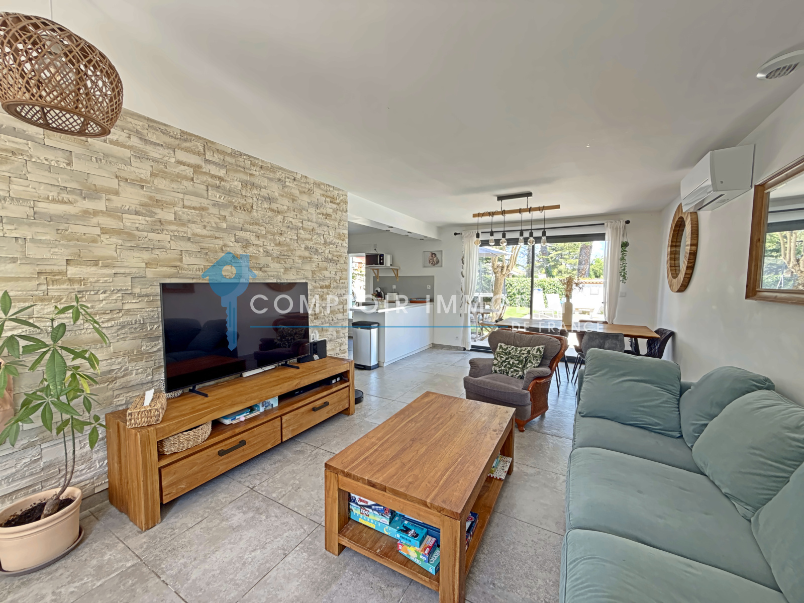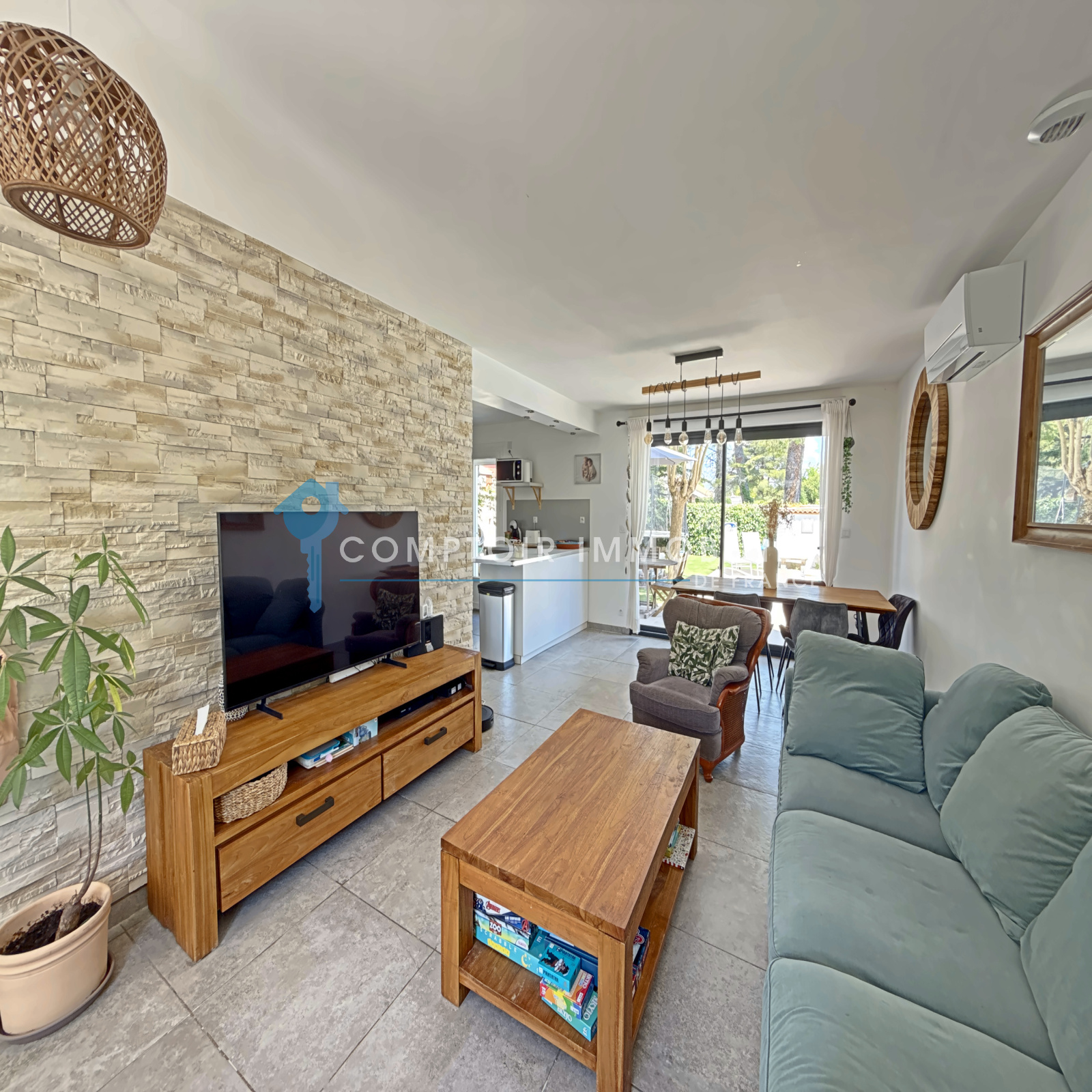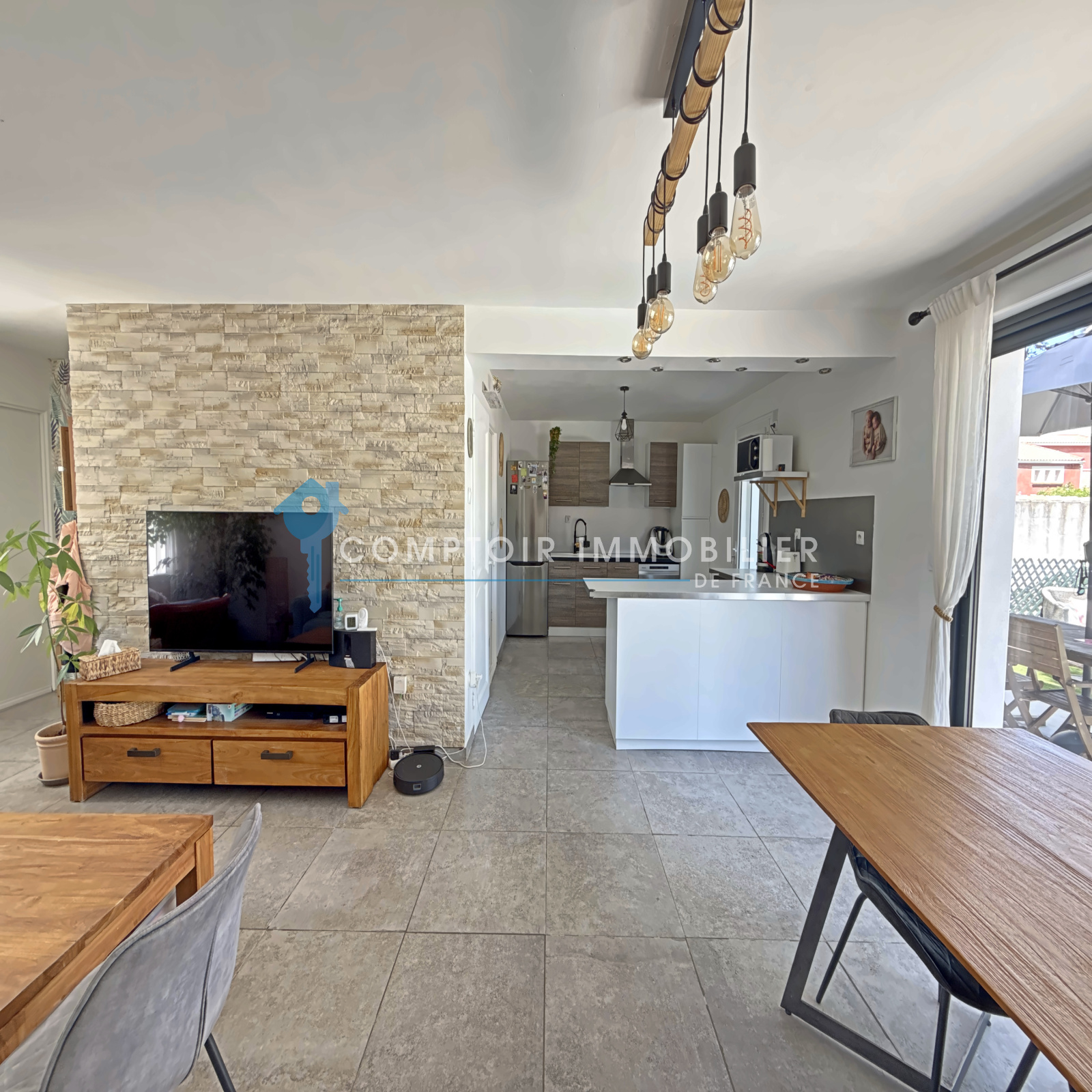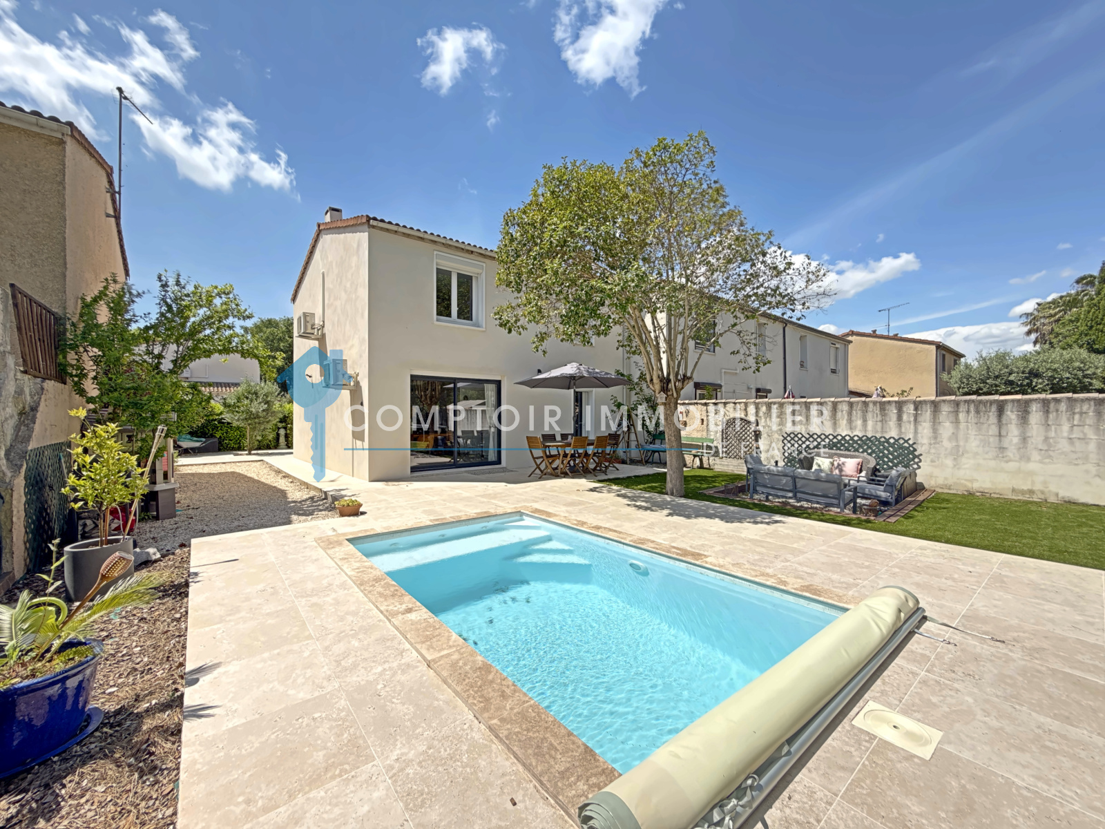 A l'exterieur , vous profiterez d'un jardin arboré de 336 M2 , avec terrasse , espace détente et piscine pour vos moments en famille ou entre amis .