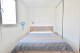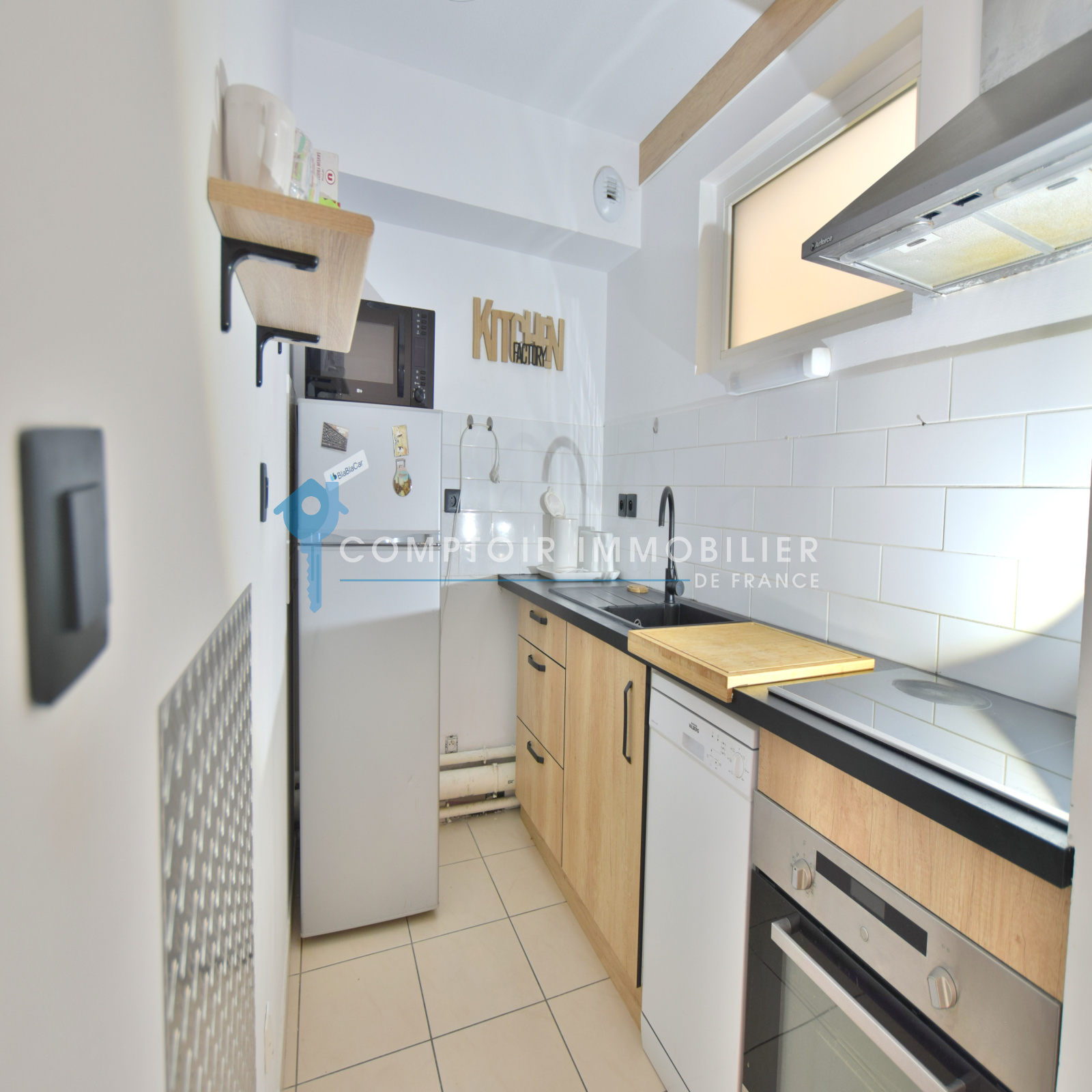 Une cuisine ouverte équipée, une chambre avec un grand placard et une salle de bains avec son WC séparé.