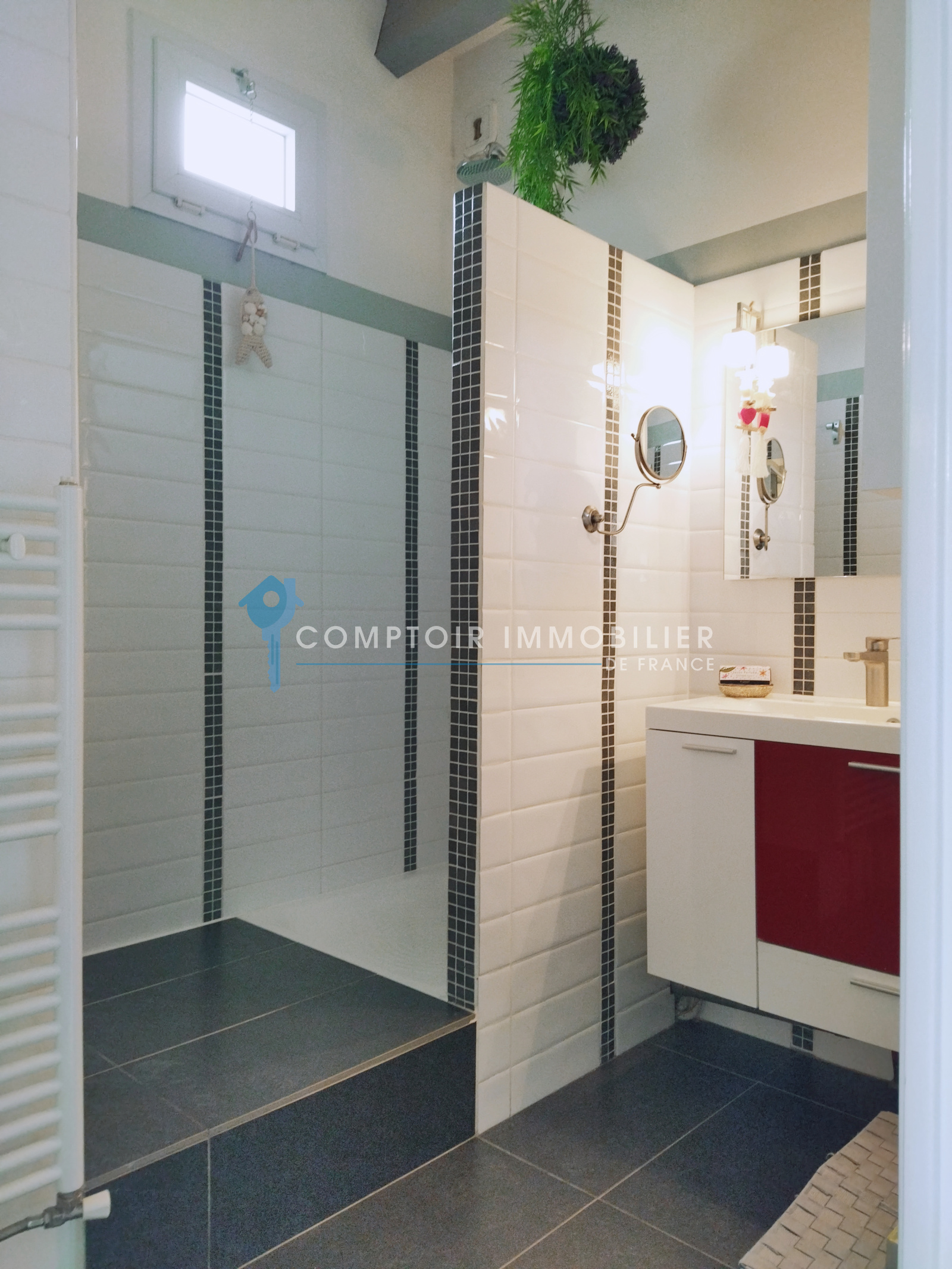 À l'étage, deux chambres équipées de nombreux rangements dont une avec mezzanine, une salle d'eau ainsi qu'un wc séparé.