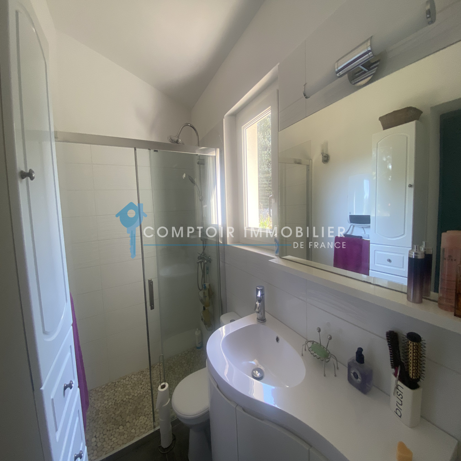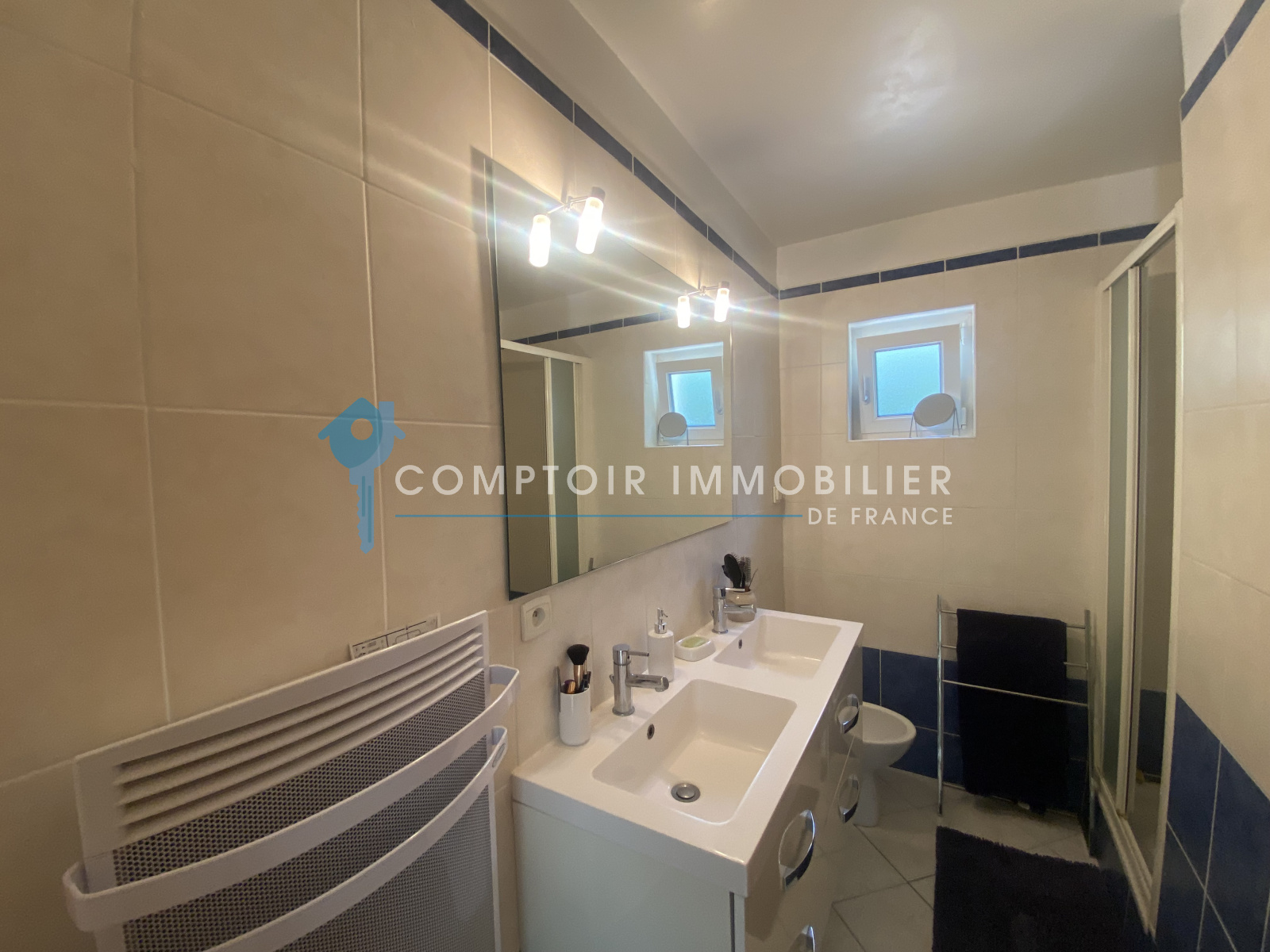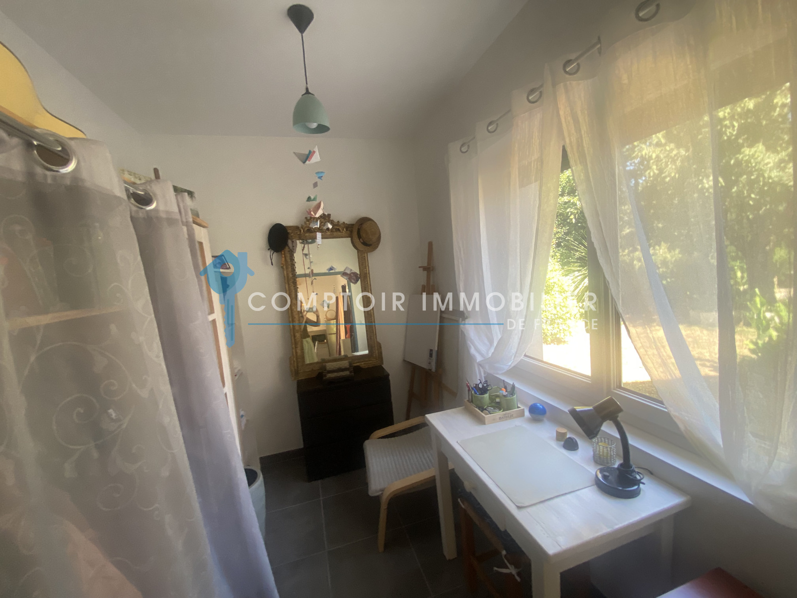 L'étage est lui composé d'un palier avec un coin bureau, d'une chambre et d'une salle de bains avec toilettes ainsi qu'une chambre