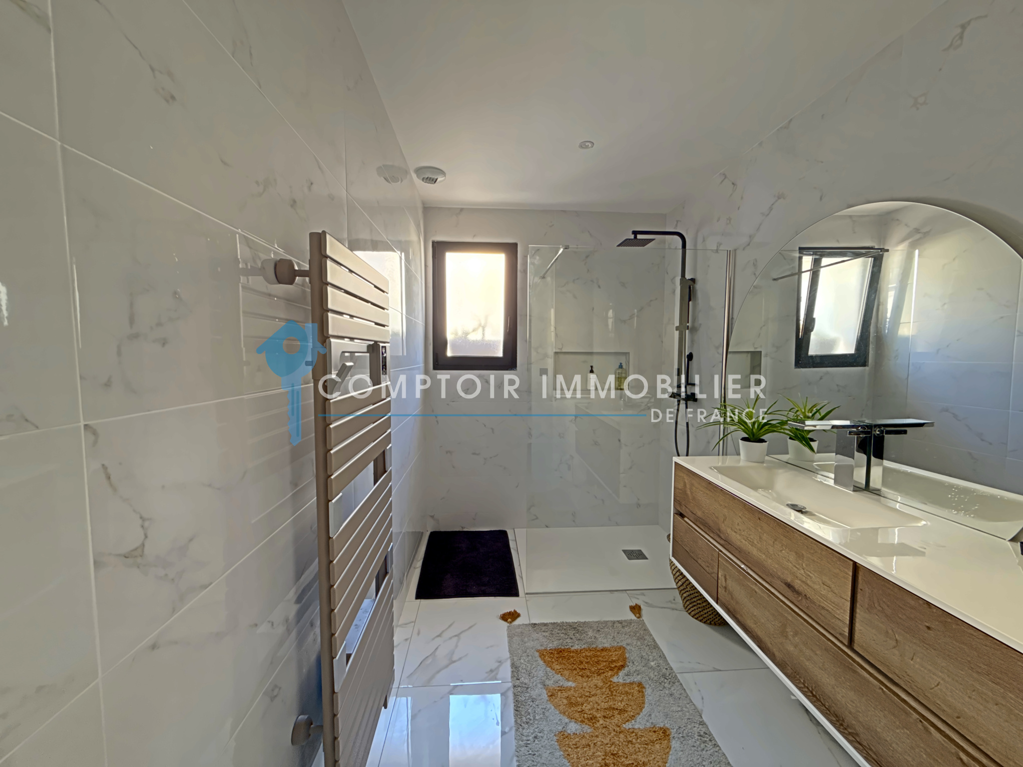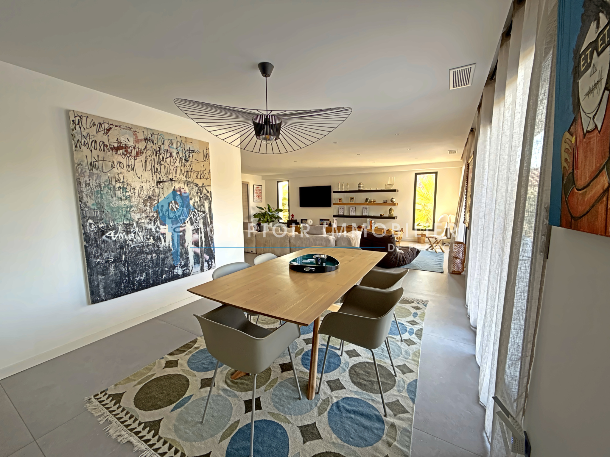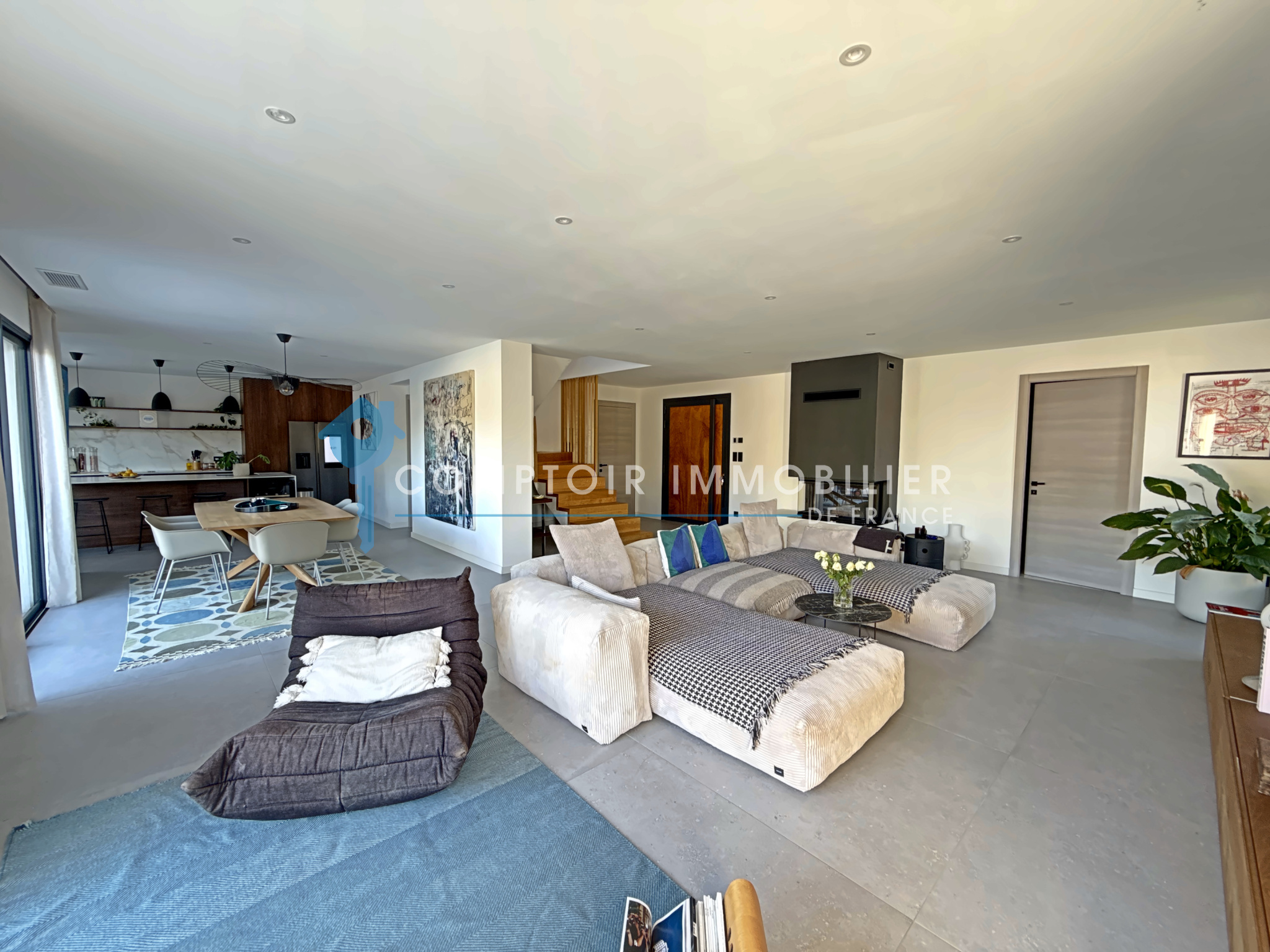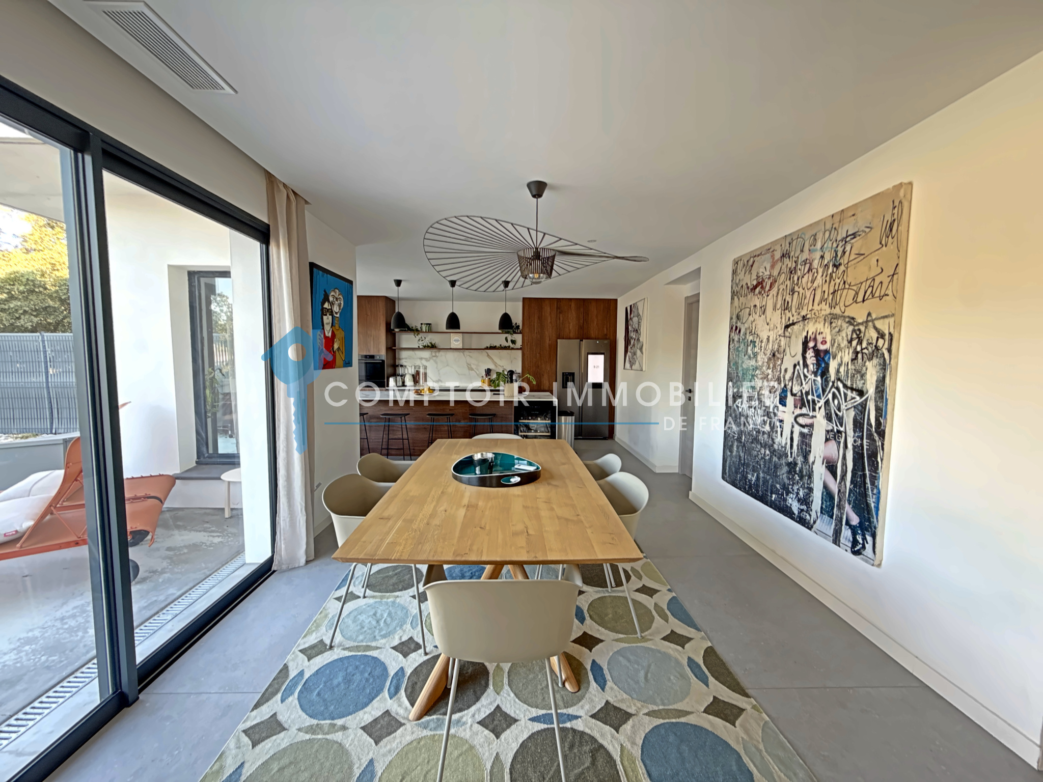 Au rez-de-chaussée, profitez d'une très grande pièce de vie baignée de lumière, d'une cuisine haut de gamme entièrement tournée vers la piscine et d'une spacieuse suite parentale avec salle d'eau .