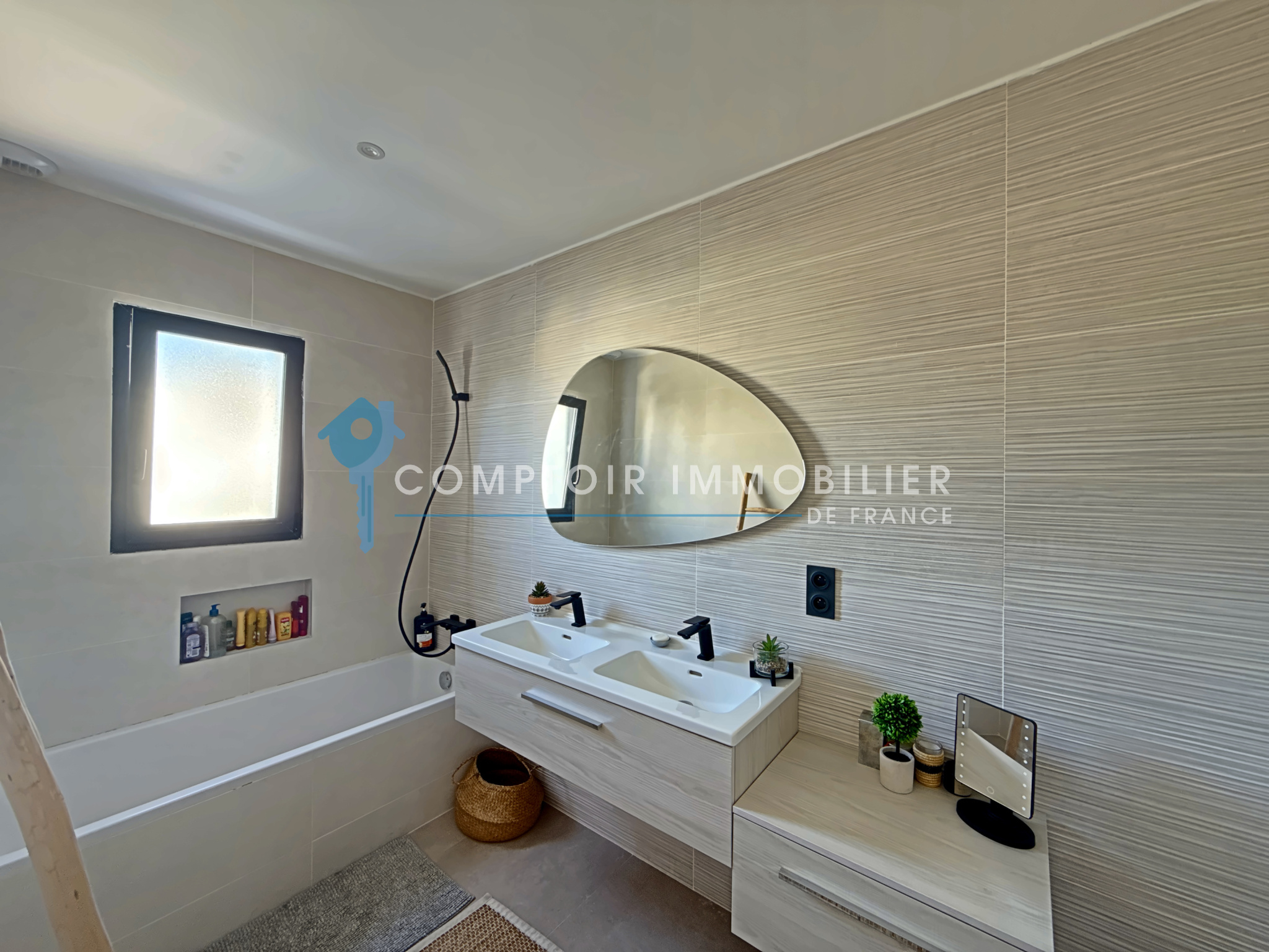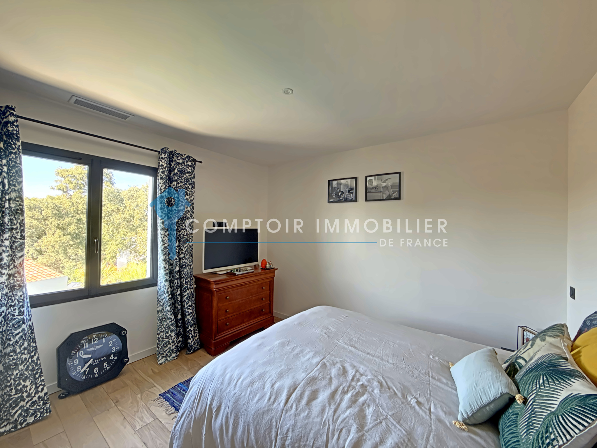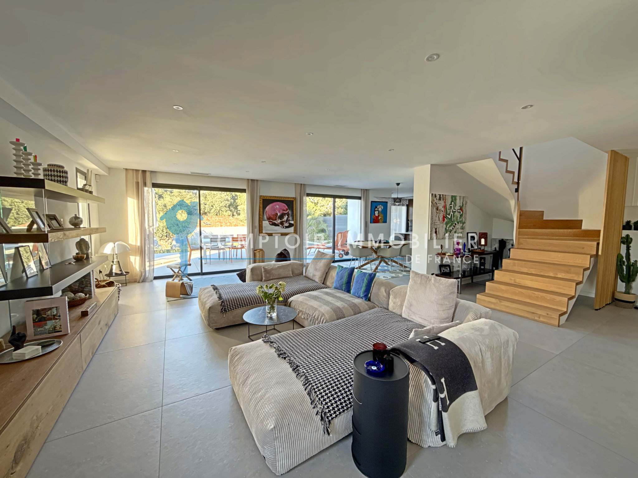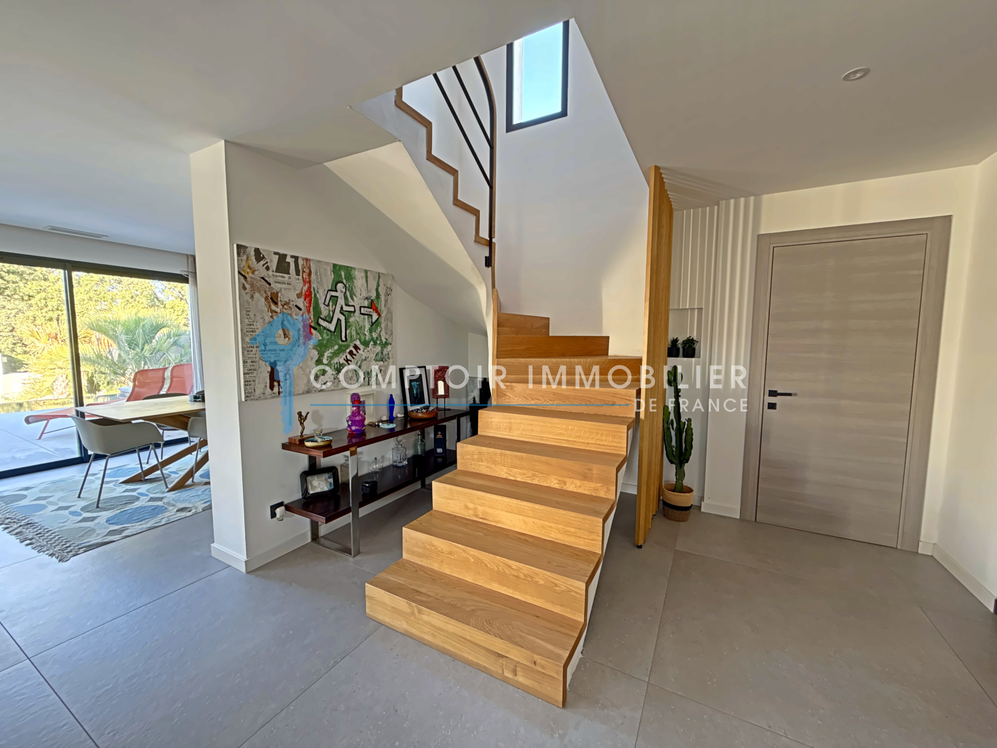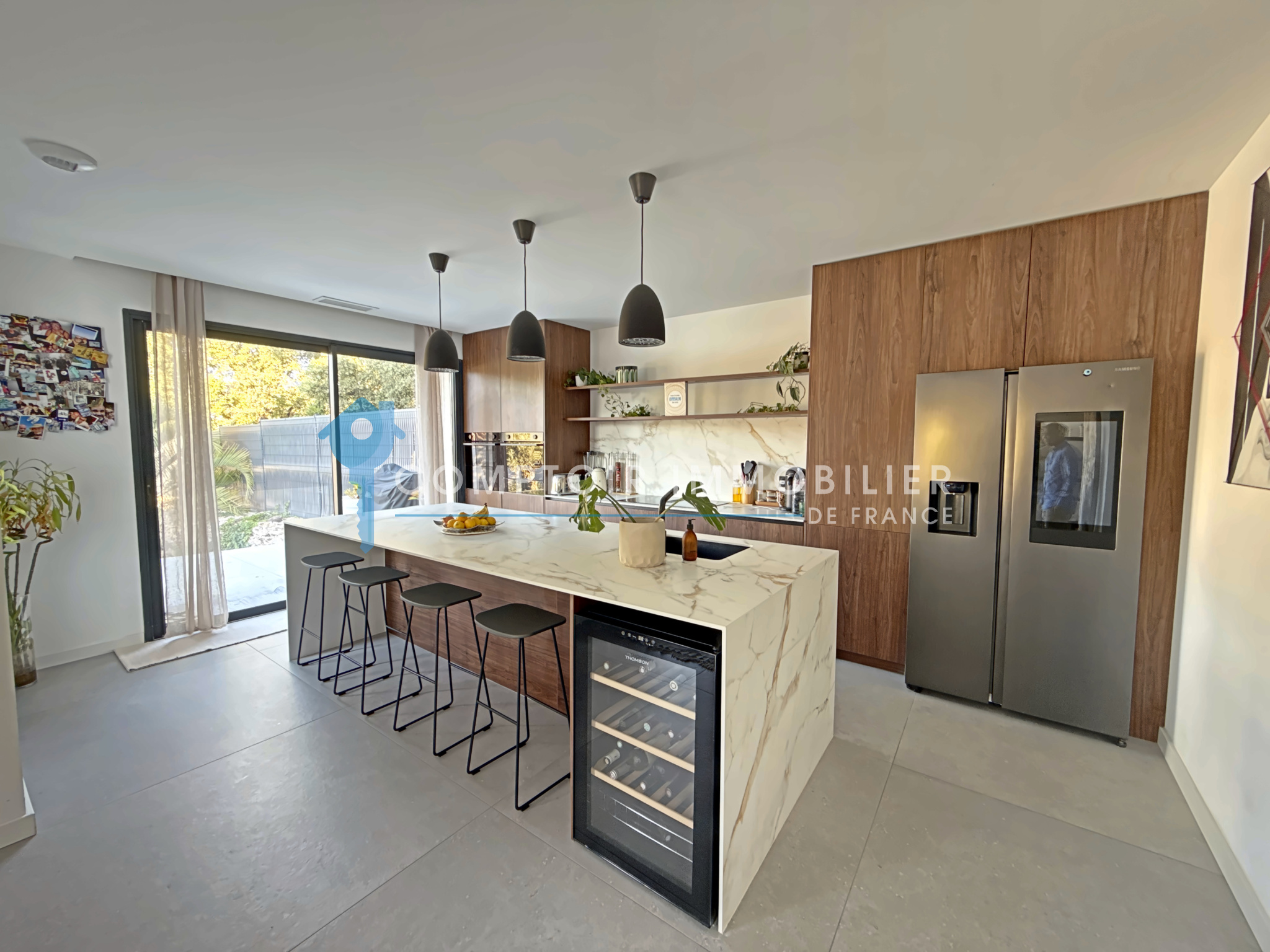 Au rez-de-chaussée, profitez d'une très grande pièce de vie baignée de lumière, d'une cuisine haut de gamme entièrement tournée vers la piscine et d'une spacieuse suite parentale avec salle d'eau .