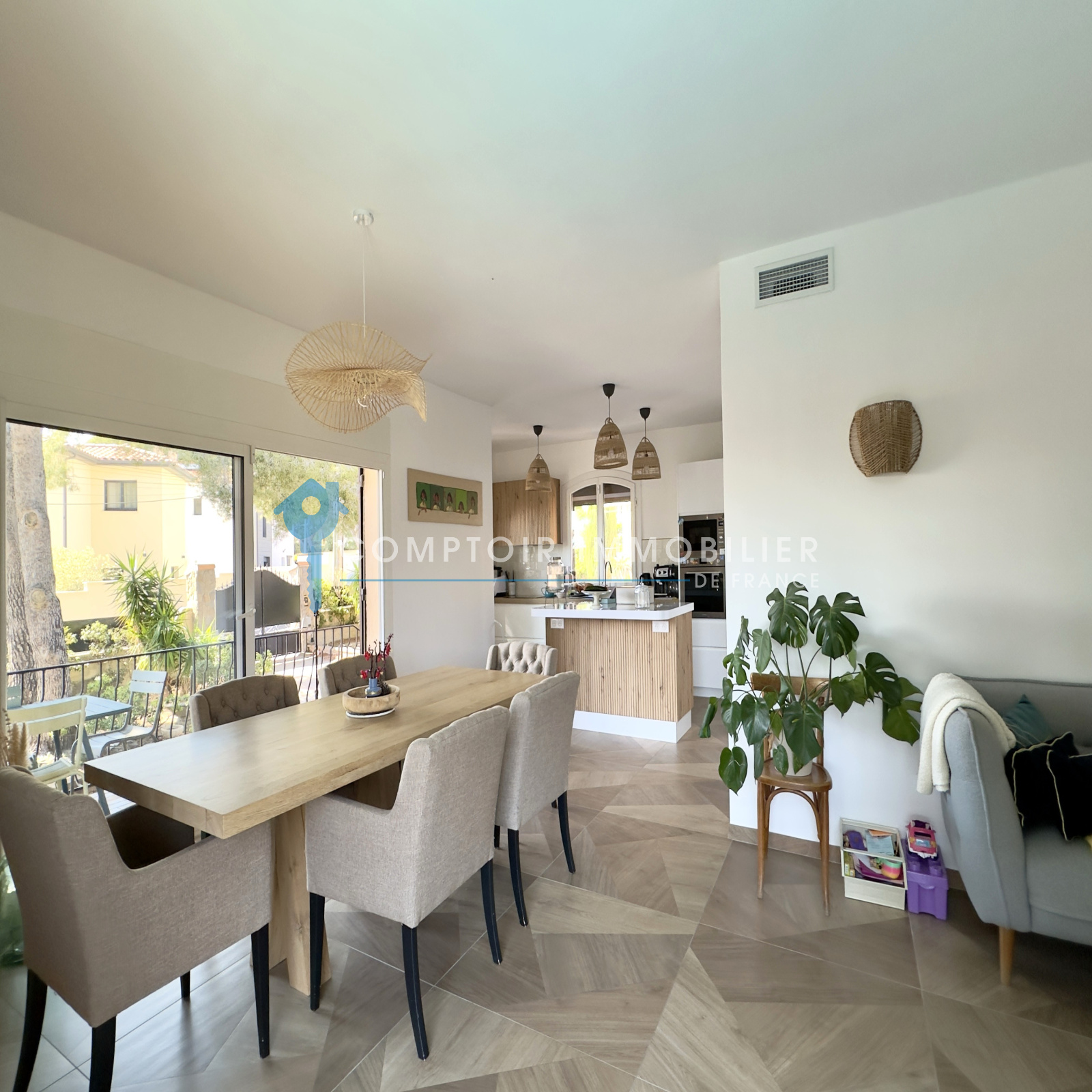 La maison possède une grande pièce à vivre lumineuse de 44 m² avec cuisine ouverte et équipée donnant sur la terrasse pour de chaleureux déjeuners.
