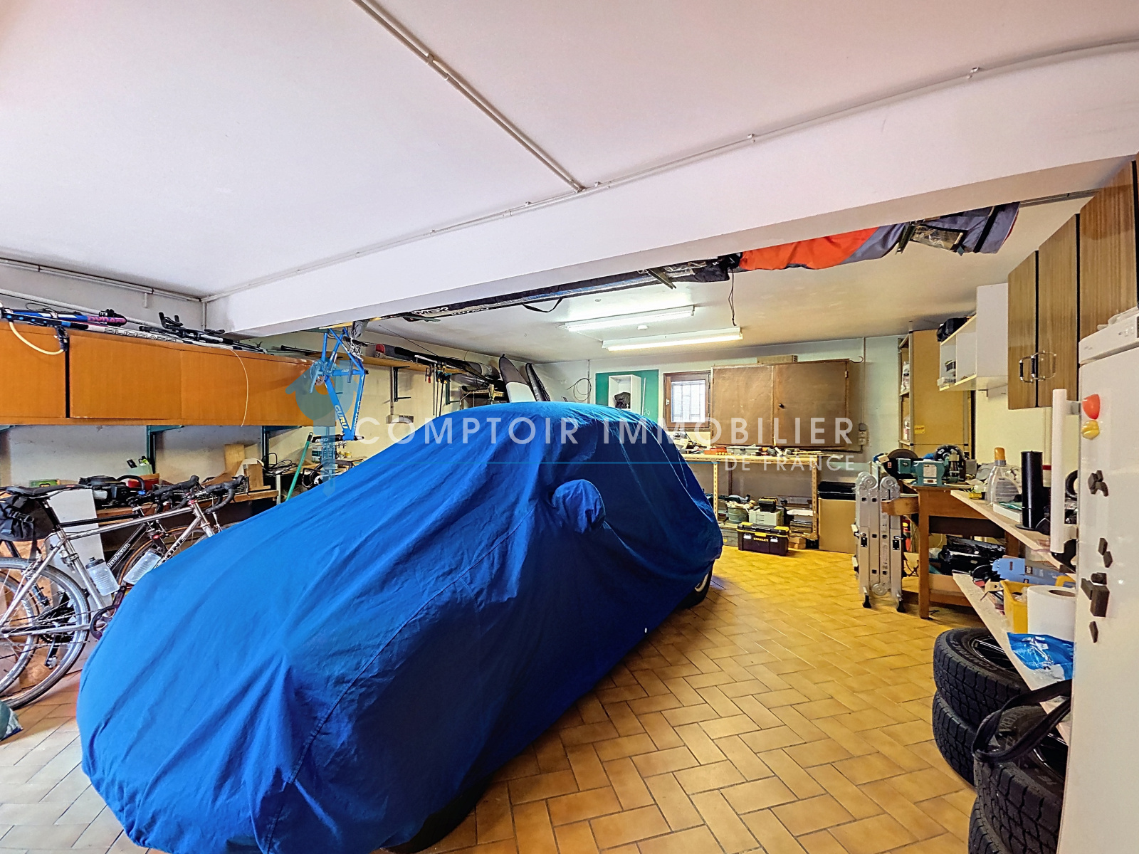 En descendant d'un "demi niveau" (3 marches), vous accéderez à un cellier de 5m², un wc séparé, une chaufferie / buanderie de 8m² comprenant une salle d'eau, et d'un garage de 43m².