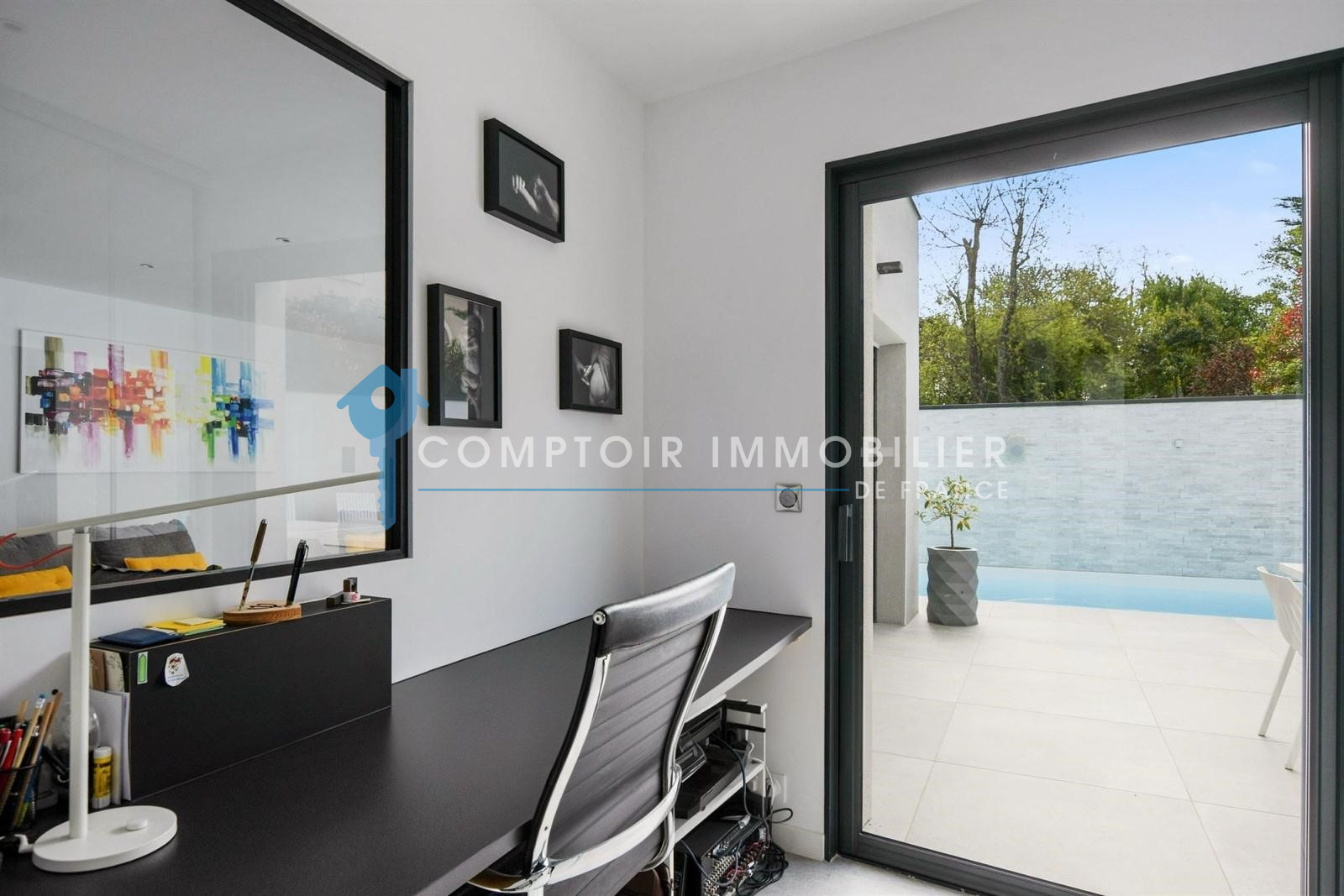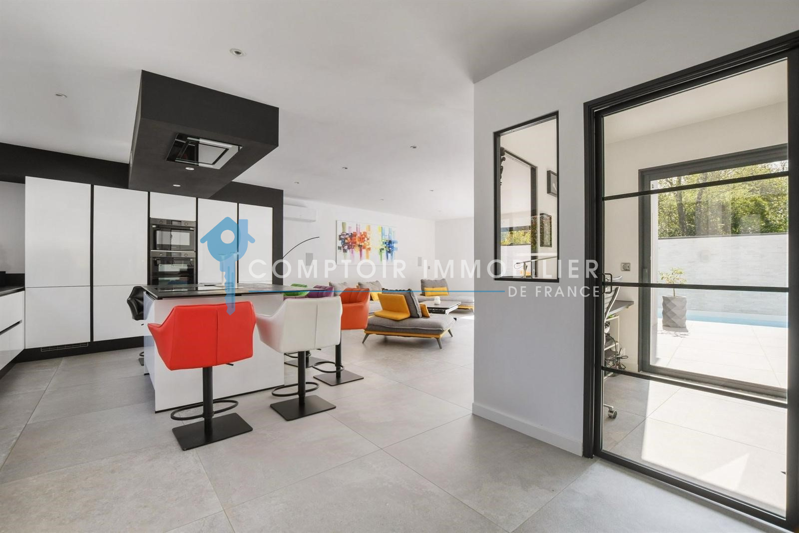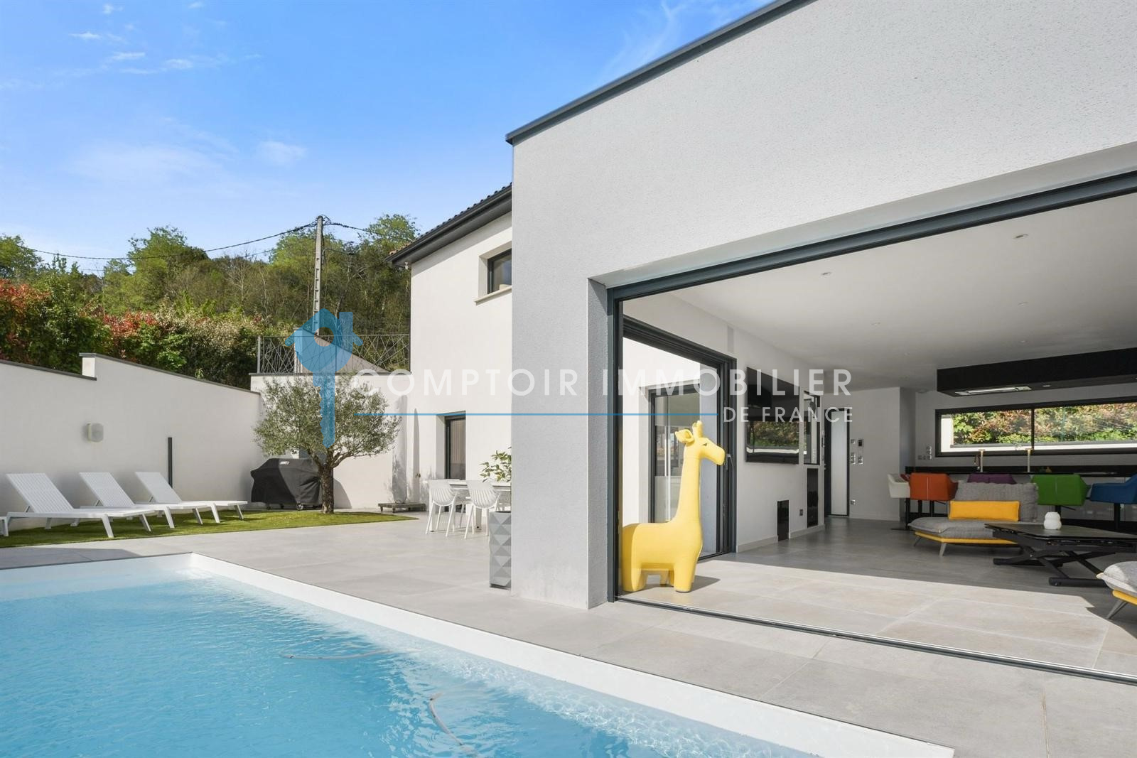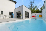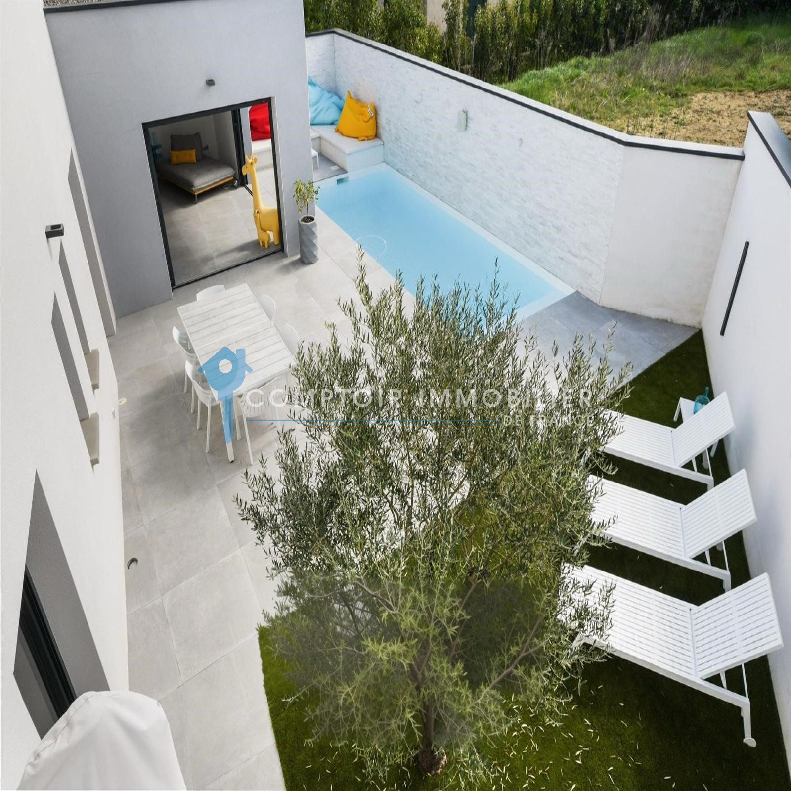 En fond d’impasse, sur un coteau boisé villa contemporaine T4/T5 de 2021 aux prestations premium, avec piscine, jardin intime, garage et stationnements.