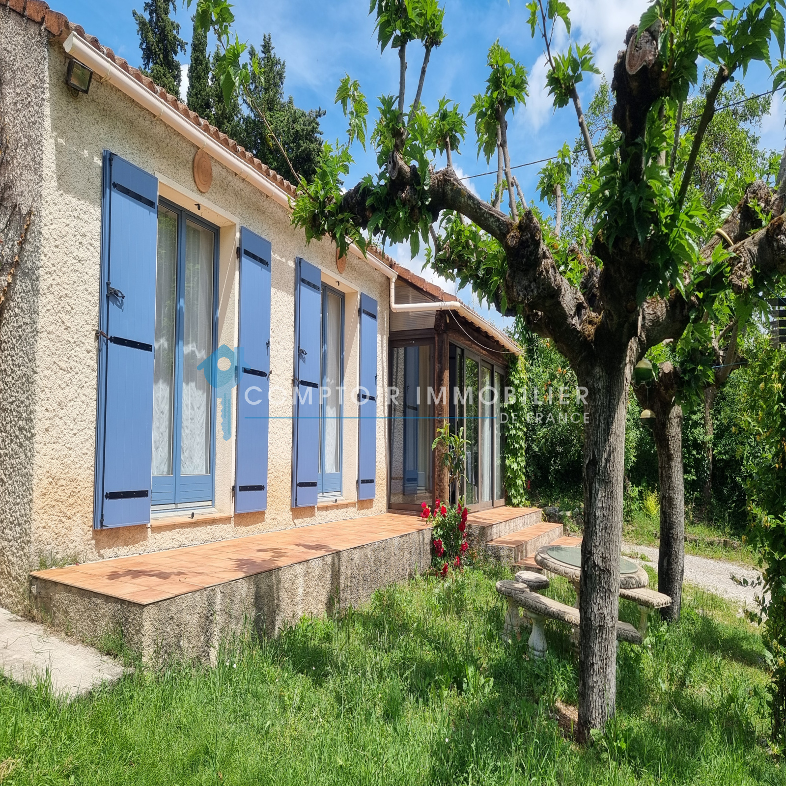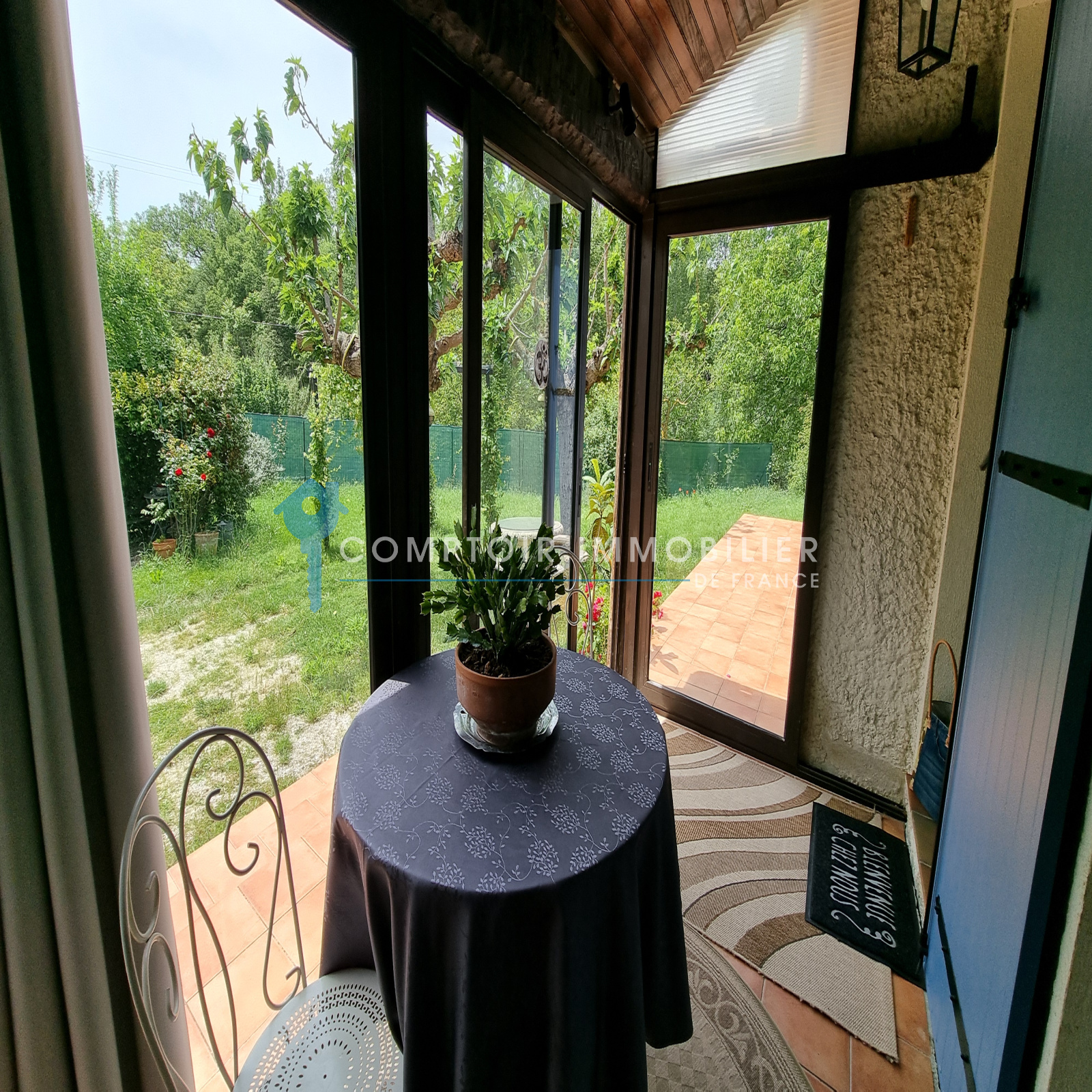 Sa pièce de vie est ouverte sur une petite véranda, idéalement orientée pour les mi-saisons, alors que l'été, vous pourrez profiter avec plaisir de l'ombre des superbes muriers platanes dans cet environement bucolique.