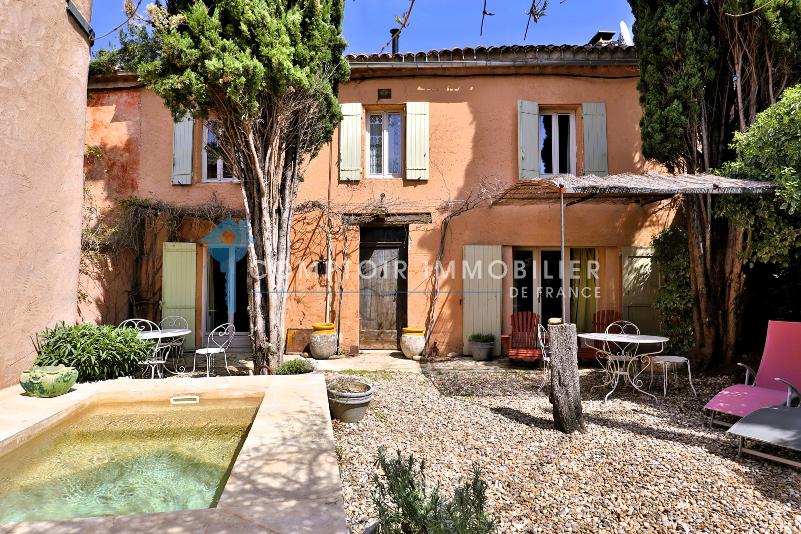 Les extérieurs: côté sud jardin/cour d'environ 80 m² avec petit bassin 1.40 x 2.30 m. Au nord jardinet d'environ 25 m².