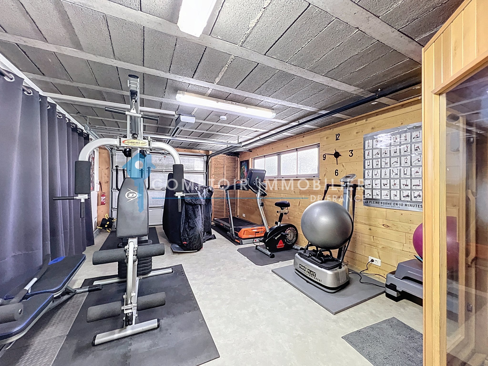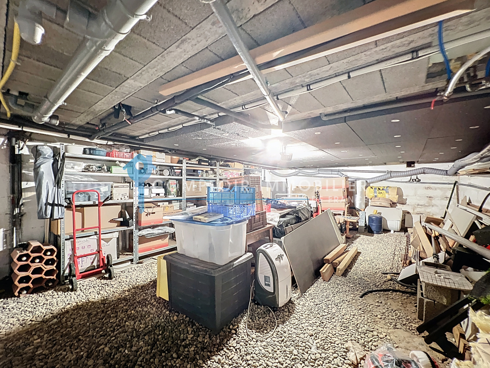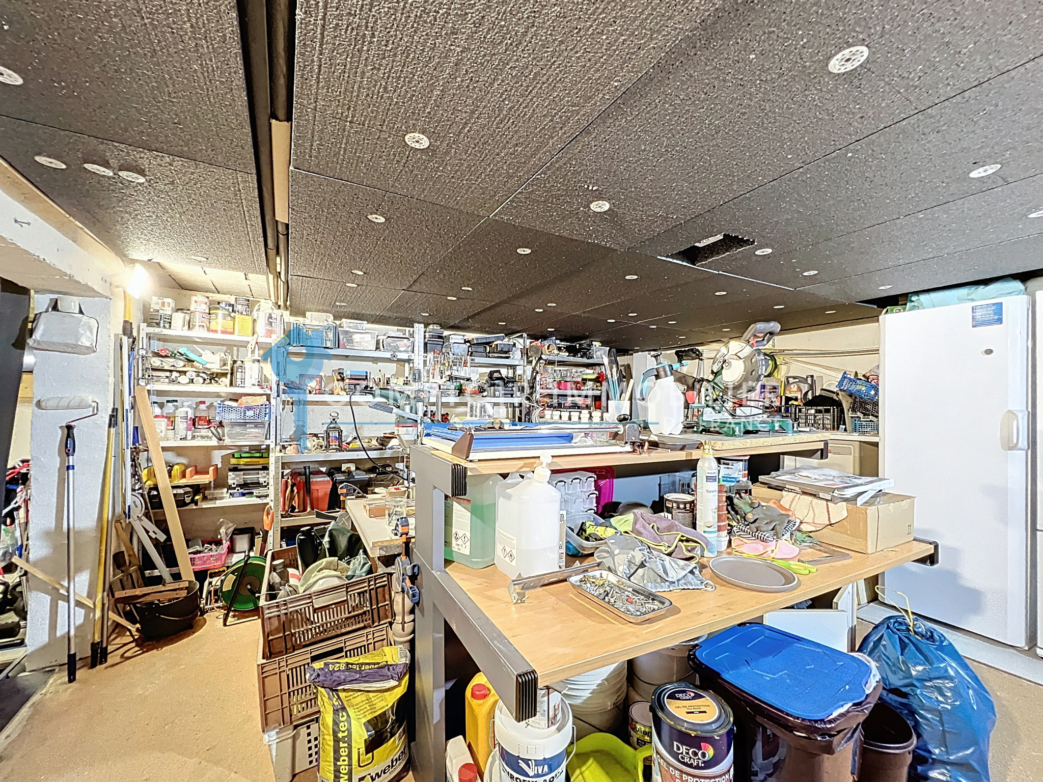 Au rez-de-jardin : chambre indépendante avec salle d’eau, coin bureau et espace cuisine (à aménager). Garage 29 m² et atelier 24,30 m².