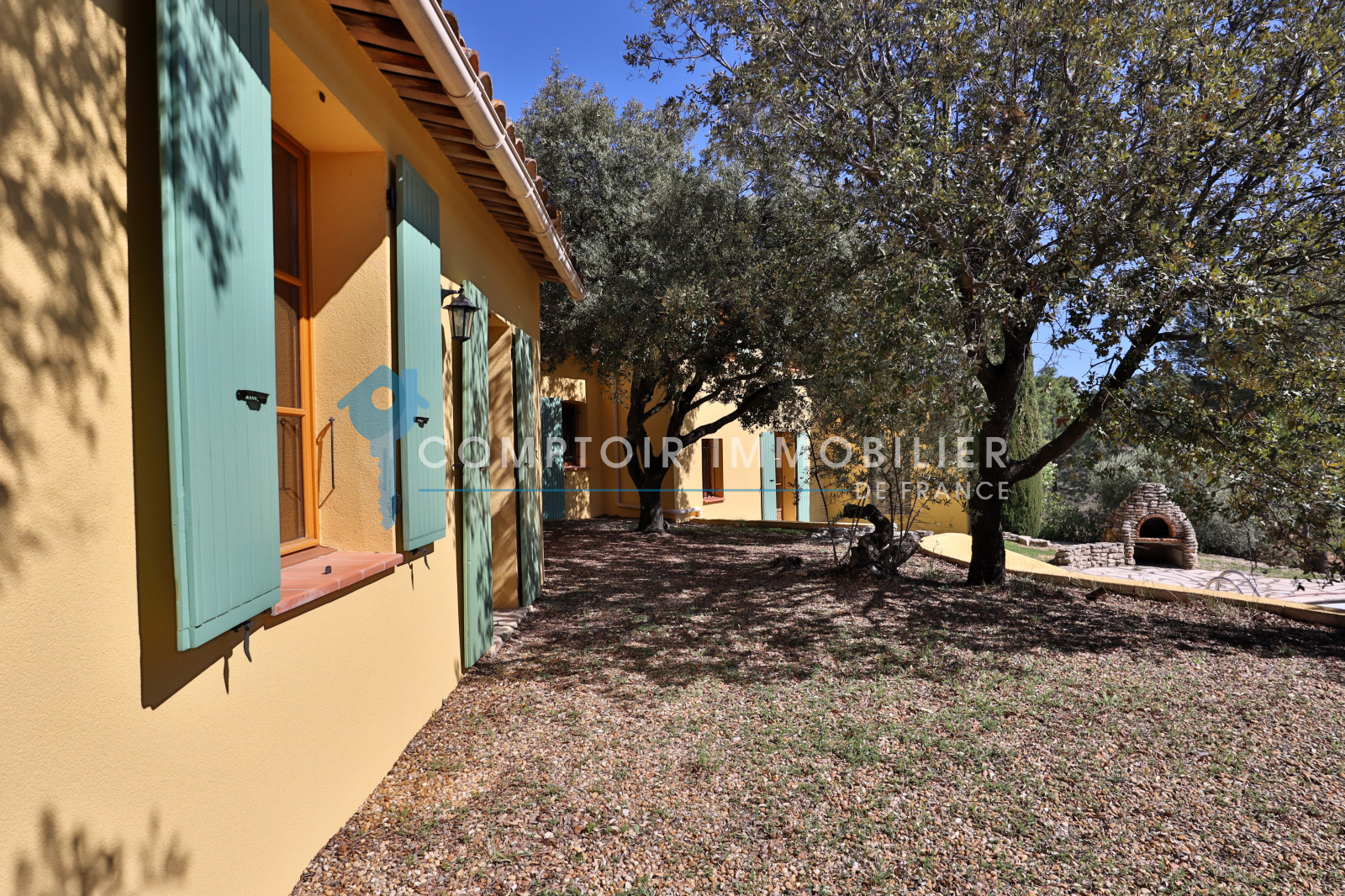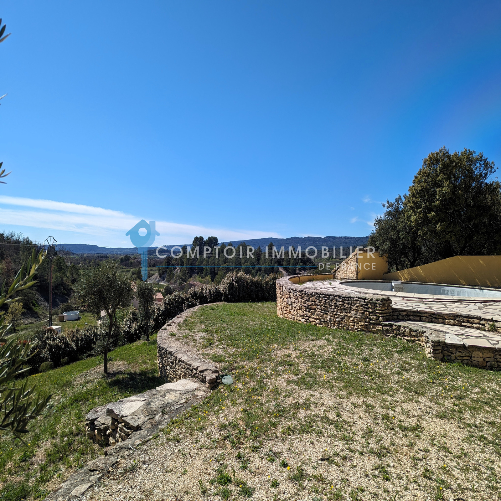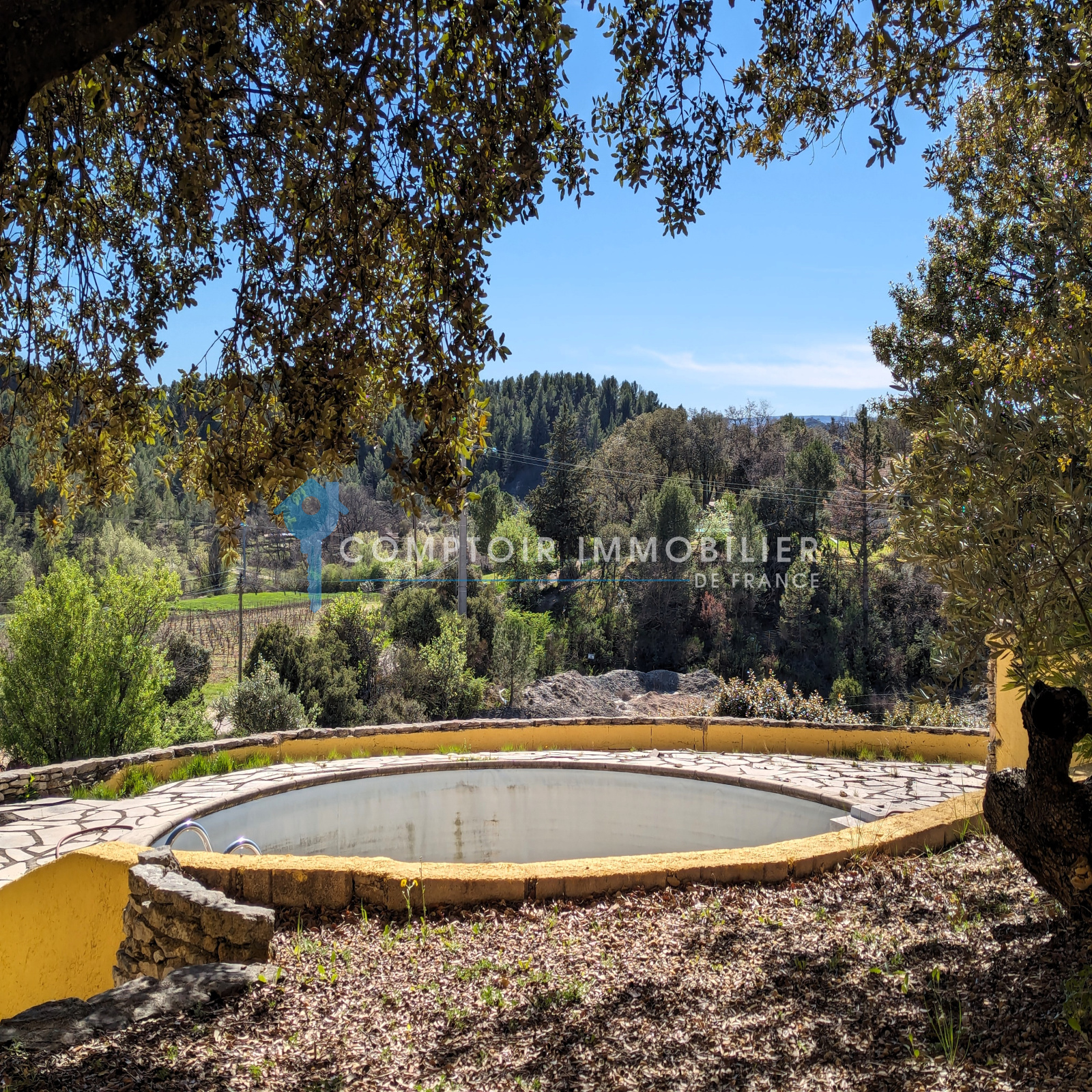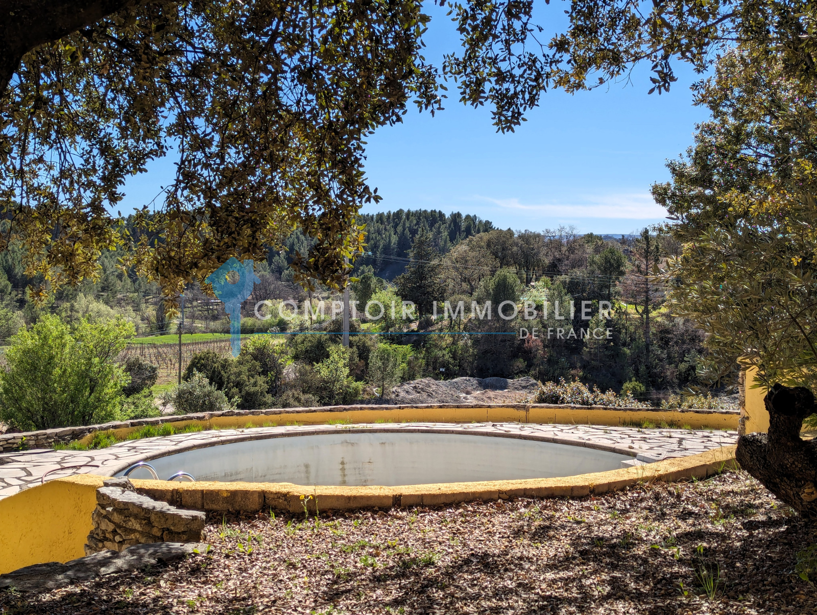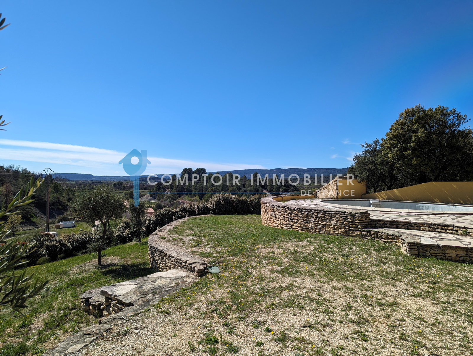 À l’extérieur : Le terrain de 2020m² est clos, il y a une piscine ronde (liner et système de filtration et pompe sont à changer), ainsi que la plage autour de la piscine qui est à refaire. Essences locales, chênes verts, oliviers, cyprès. Belle terrasse ombragée côté sud, barbecue en pierre.